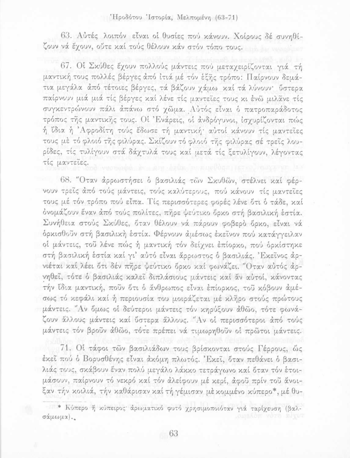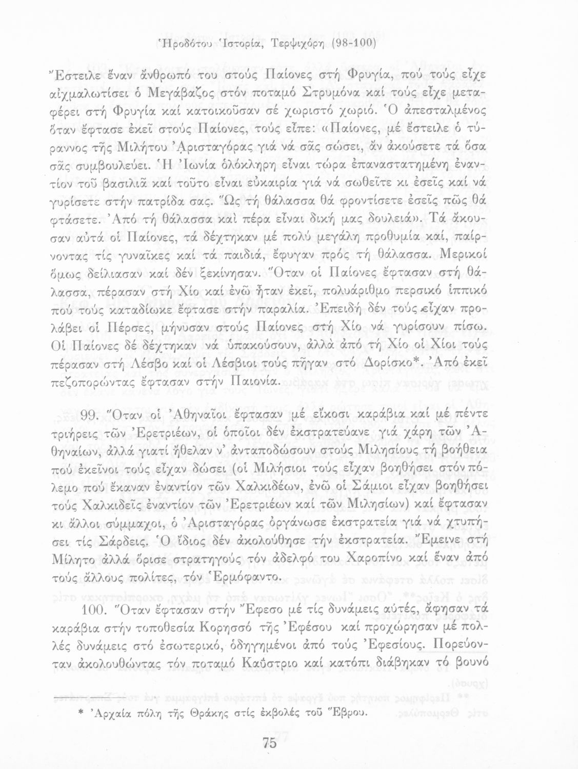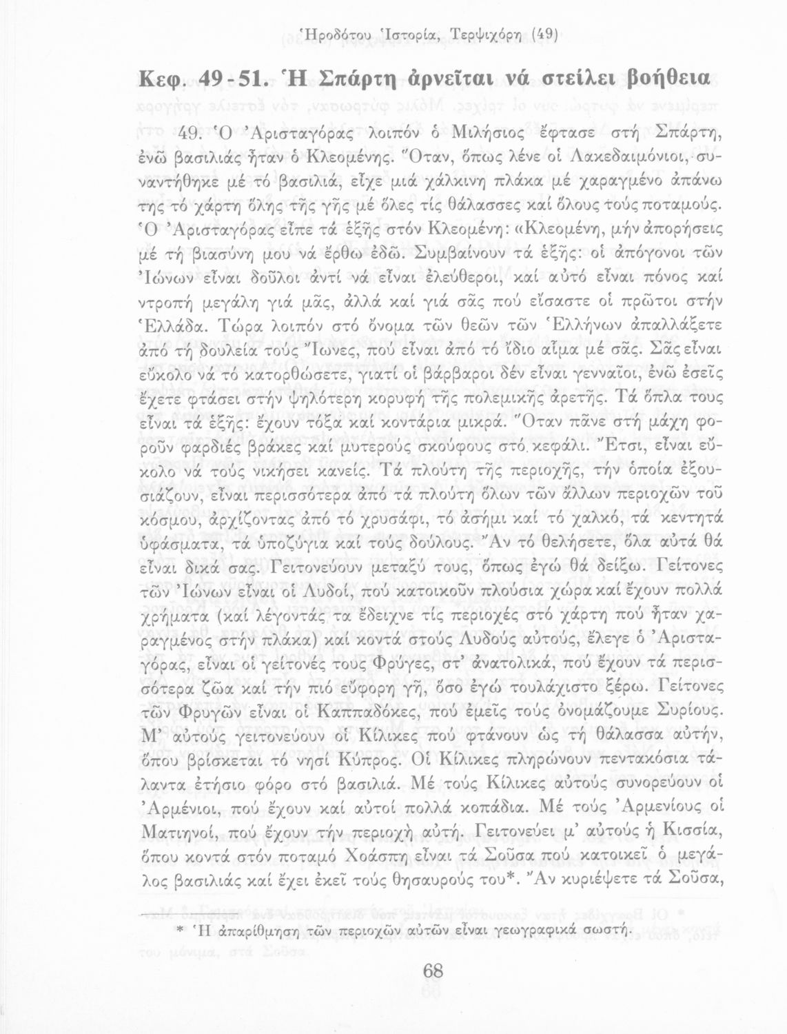 Σχολικό εγχειρίδιο Αρχαίων Ελληνικών Α΄ Γυμνασίου που περιλαμβάνει αποσπάσματα από την Ιστορία του Ηρόδοτου σε μετάφραση, εισαγωγή στη ζωή, το έργο και τη διάλεκτό του και ερμηνευτικά και πραγματολογικά σχόλια.