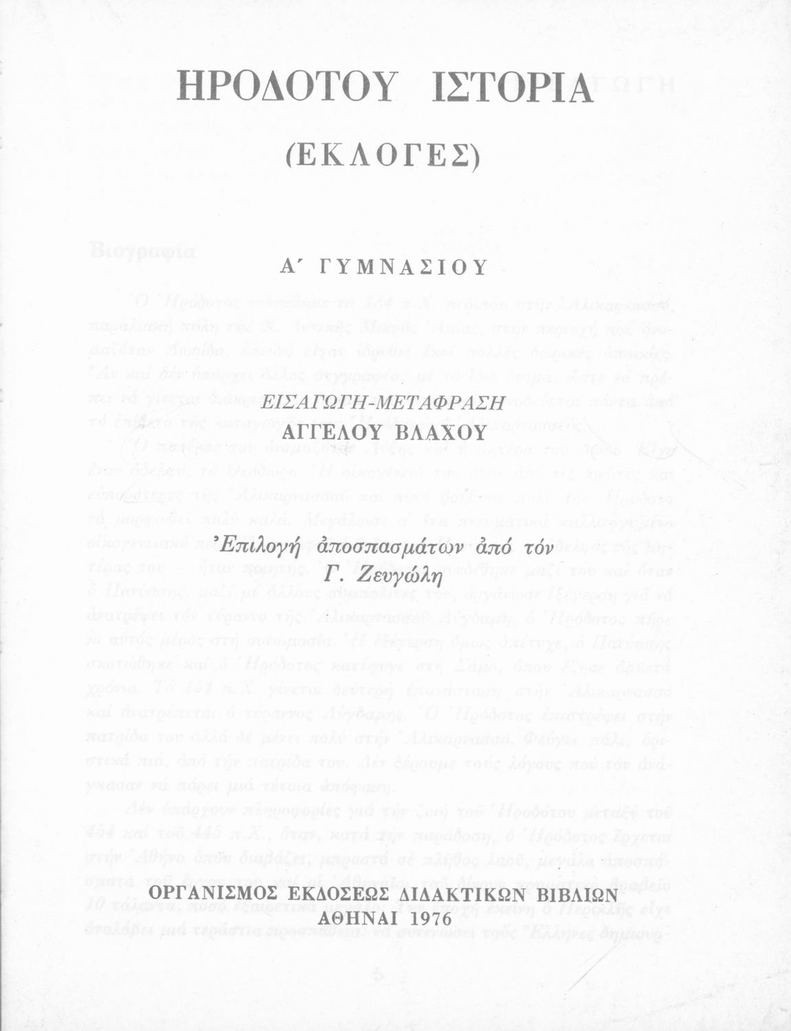 Βαθμίδα εκπαίδευσης: Δευτεροβάθμια Τάξη: Α' Γυμνασίου Μάθημα: Αρχαία Ελληνικά Γλώσσα: Δημοτική Παρουσίαση περιεχομένου: Σχολικό εγχειρίδιο Αρχαίων Ελληνικών Α΄ Γυμνασίου που περιλαμβάνει εισαγωγή στη ζωή και το έργο του Ηρόδοτου και αποσπάσματα από τα εννέα βιβλία της Ιστορίας του σε μετάφραση. |