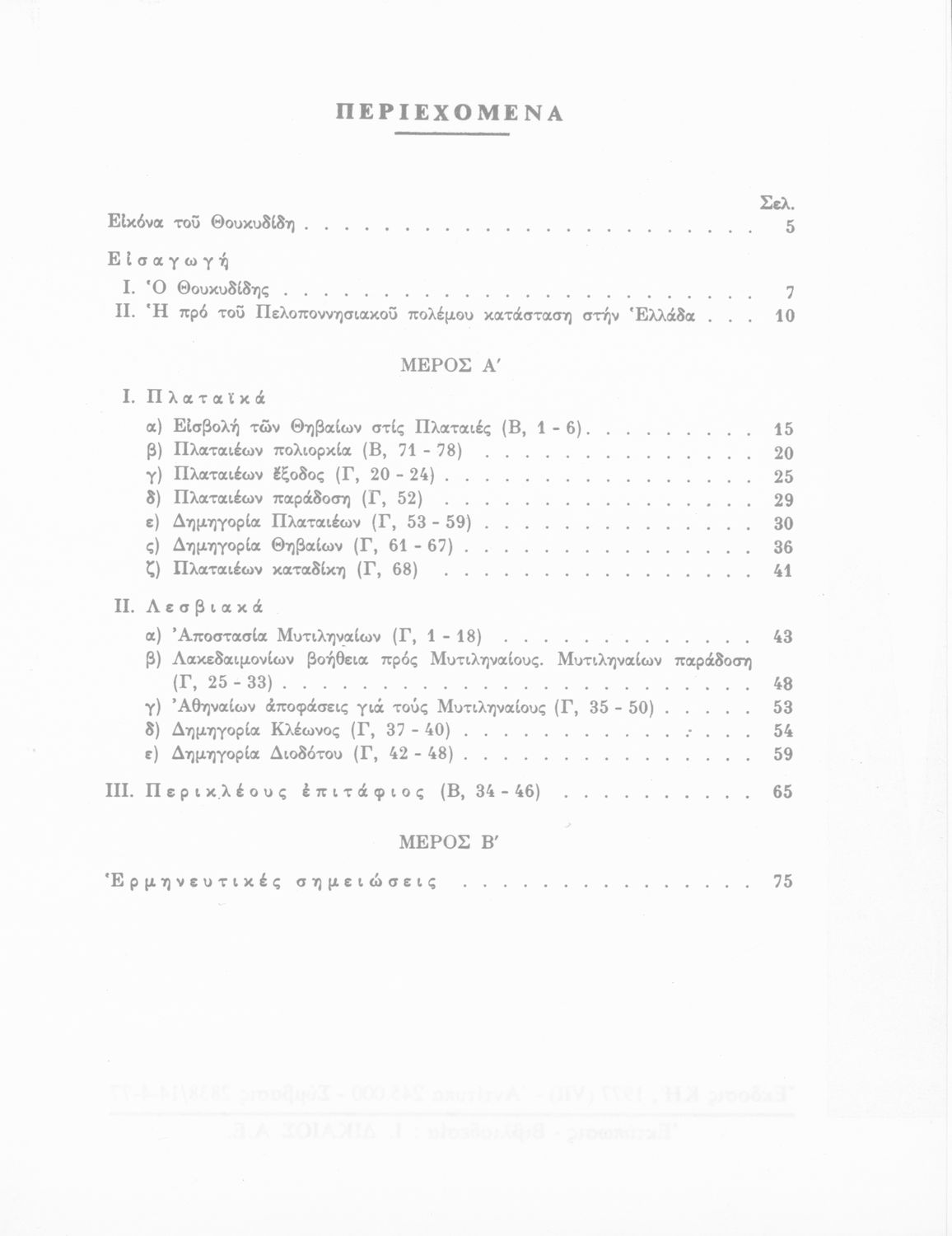 Σχολικό εγχειρίδιο Αρχαίων Ελληνικών Γυμνασίου που περιέχει εισαγωγή στη ζωή και το έργο του Θουκυδίδη, αποσπάσματα από τα Πλαταιϊκά, τα Λεσβιακά και τον Επιτάφιο του Περικλή και ερμηνευτικές σημειώσεις. Φέρει