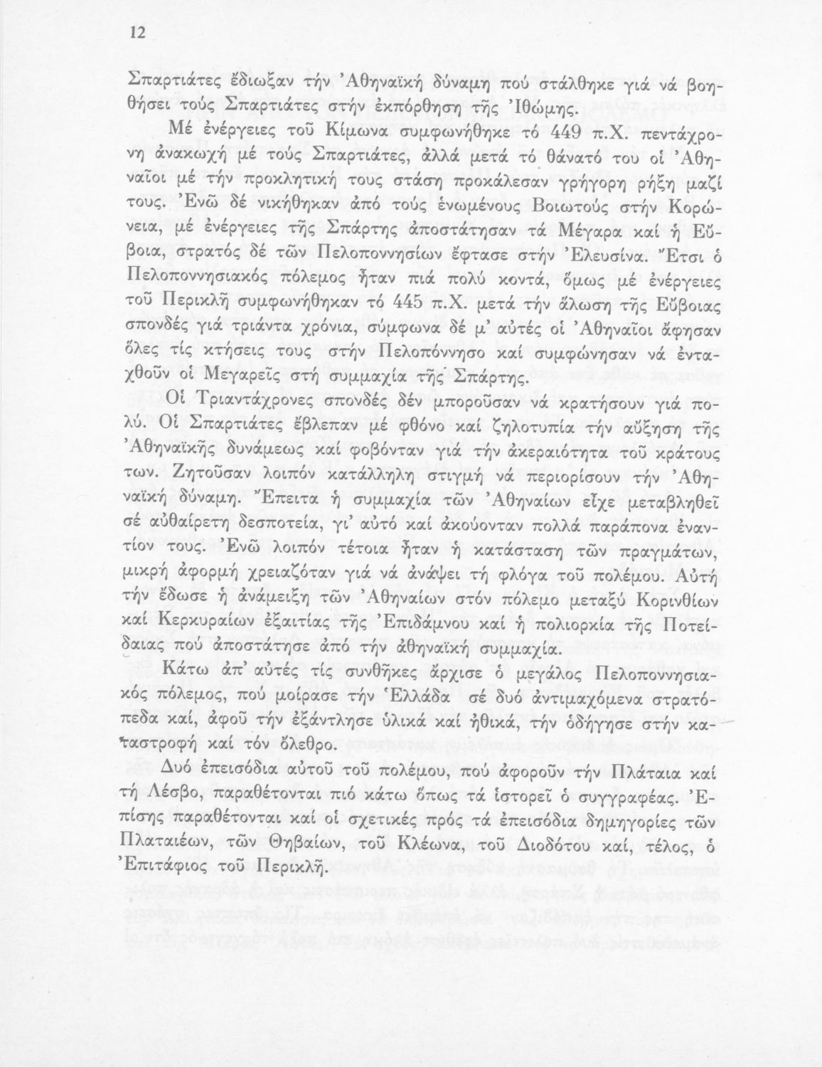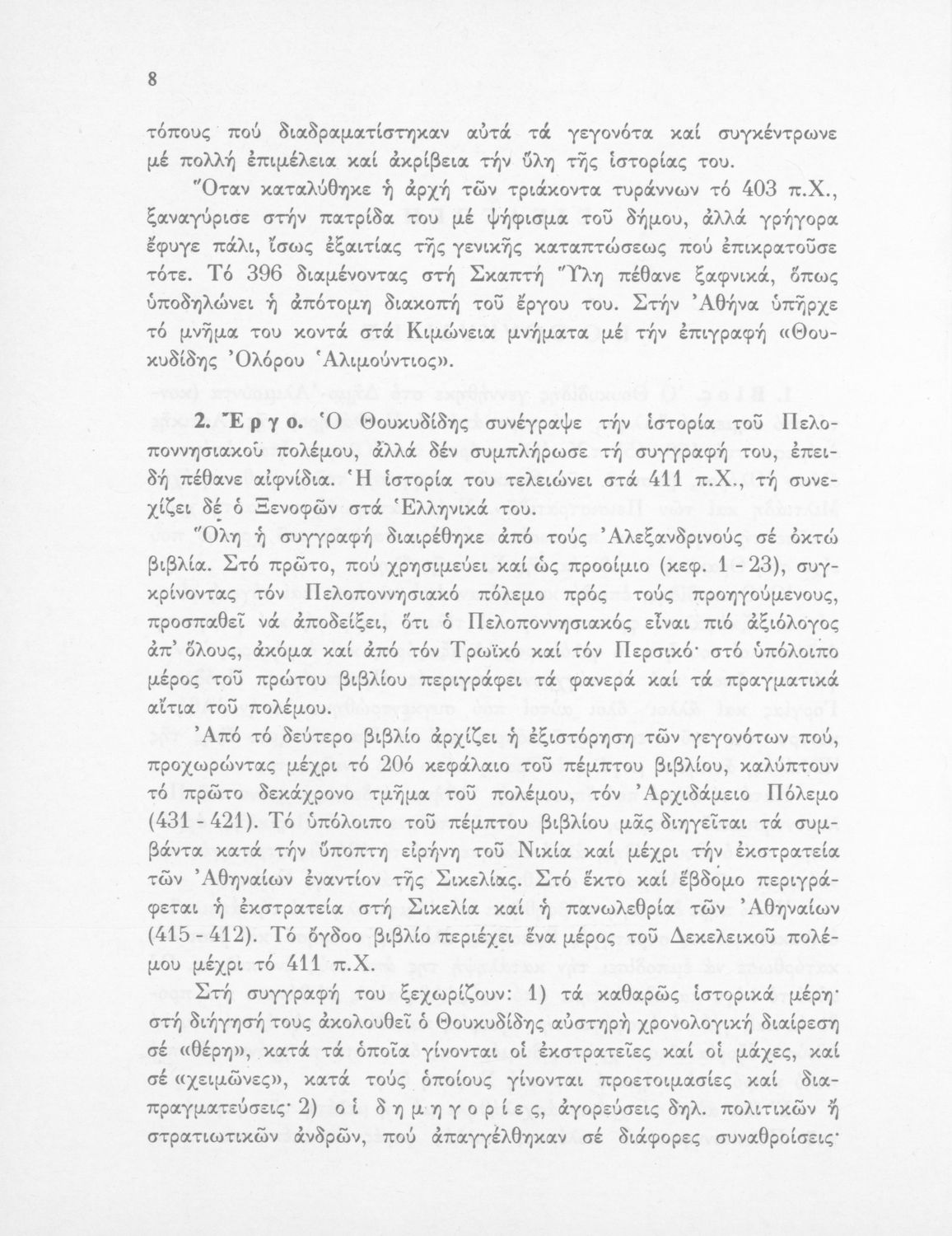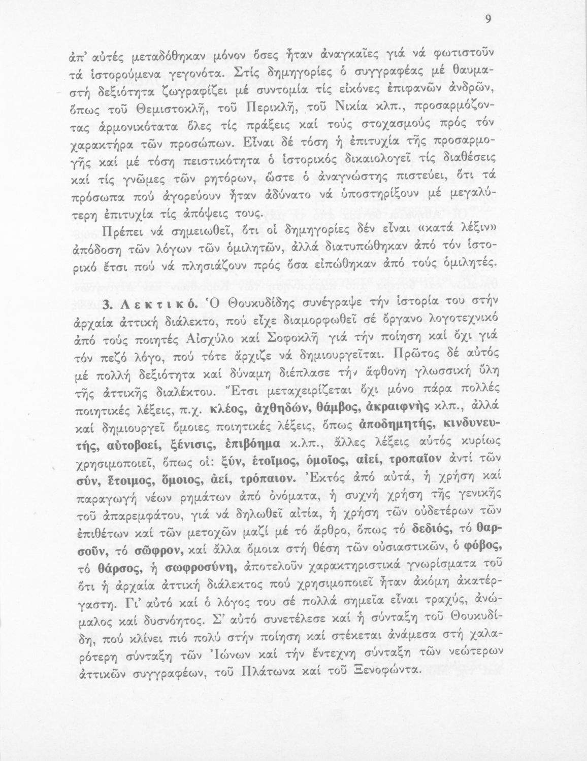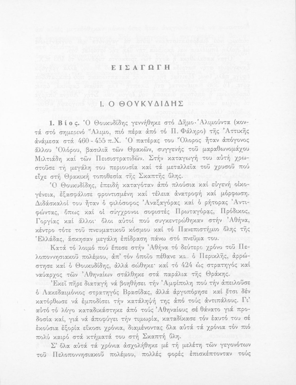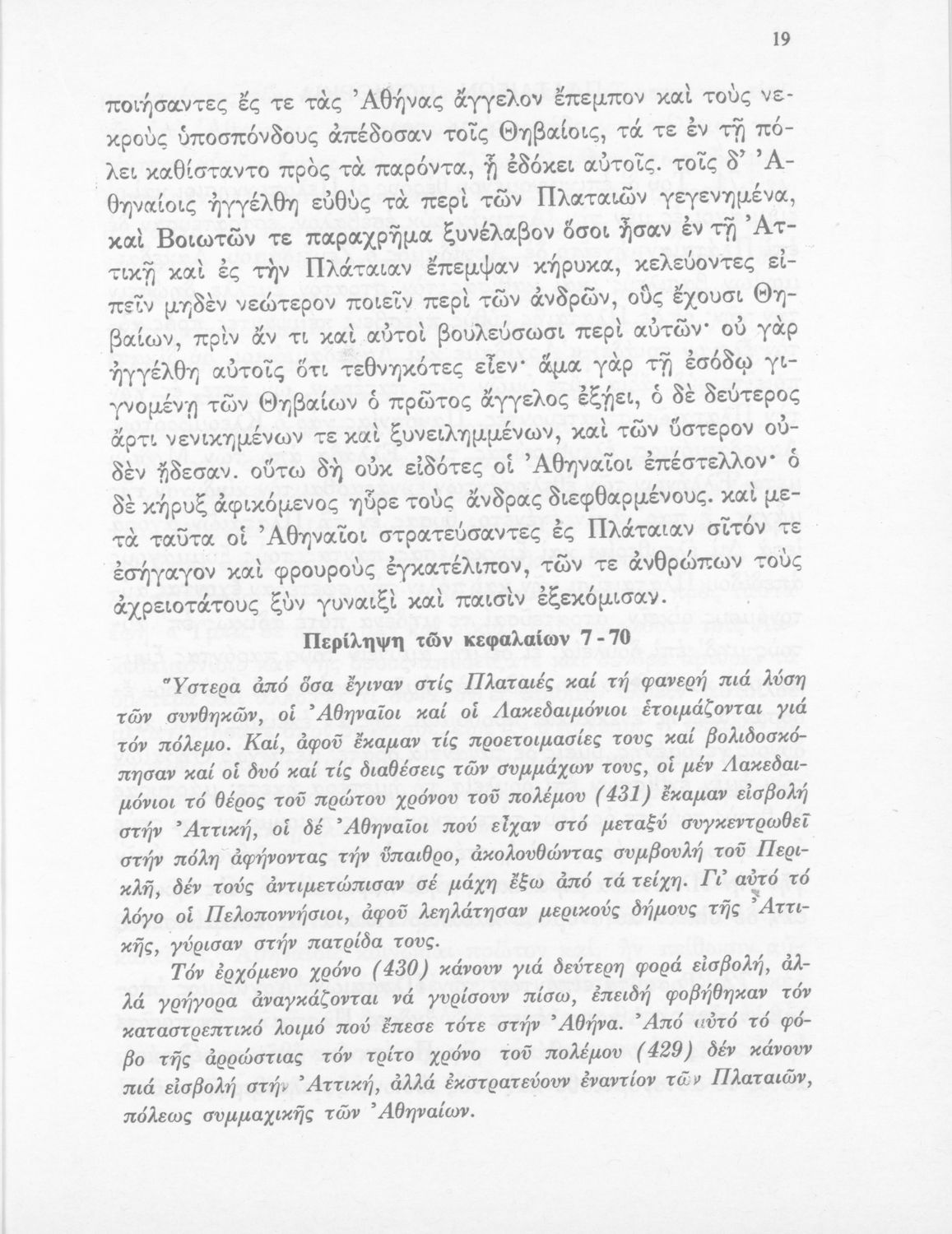 Σχολικό εγχειρίδιο Αρχαίων Ελληνικών Γυμνασίου που περιέχει εισαγωγή στη ζωή και το έργο του Θουκυδίδη, αποσπάσματα από τα Πλαταιϊκά, τα Λεσβιακά και τον Επιτάφιο του Περικλή και ερμηνευτικές σημειώσεις. Φέρει