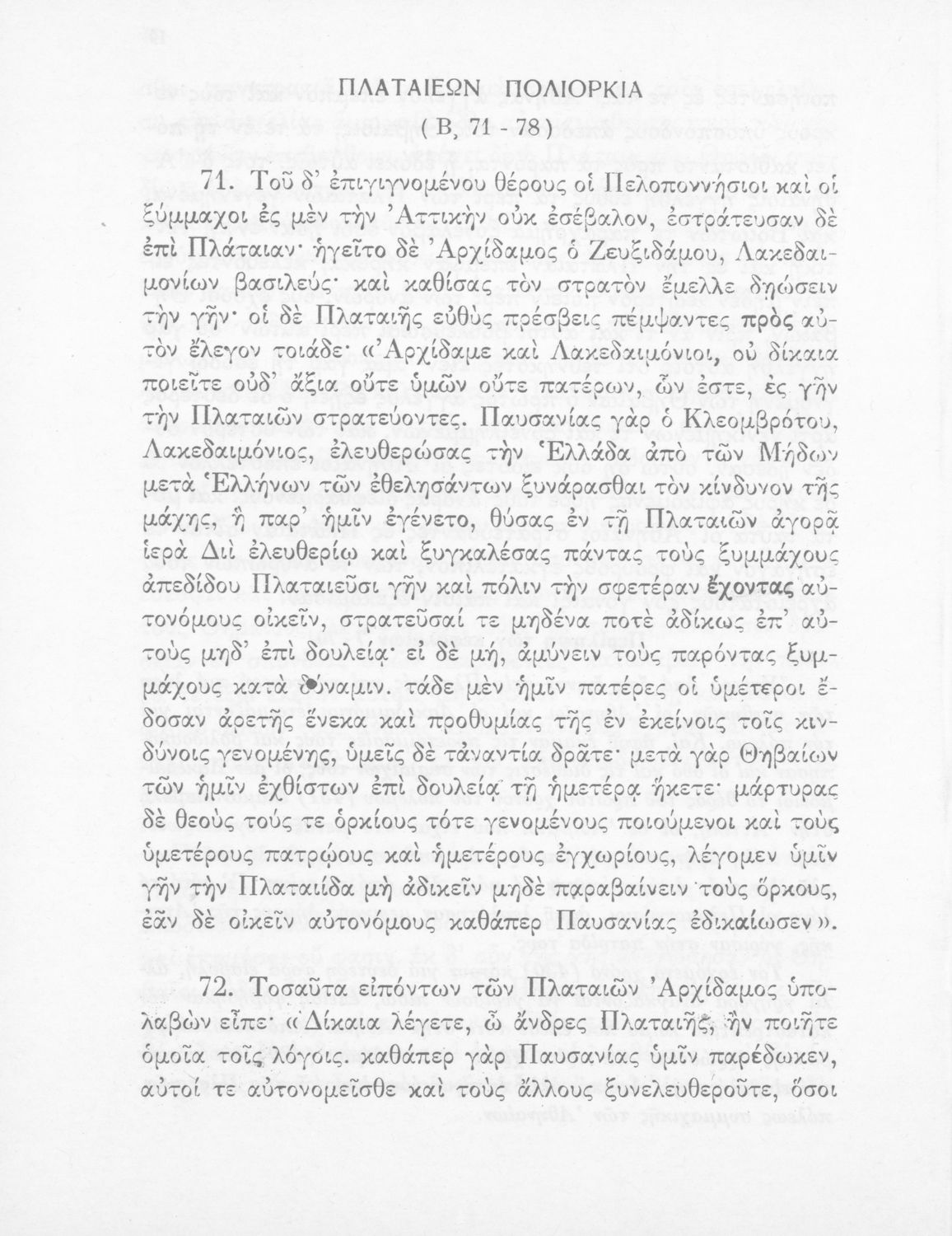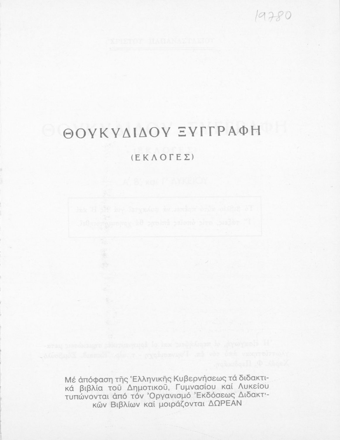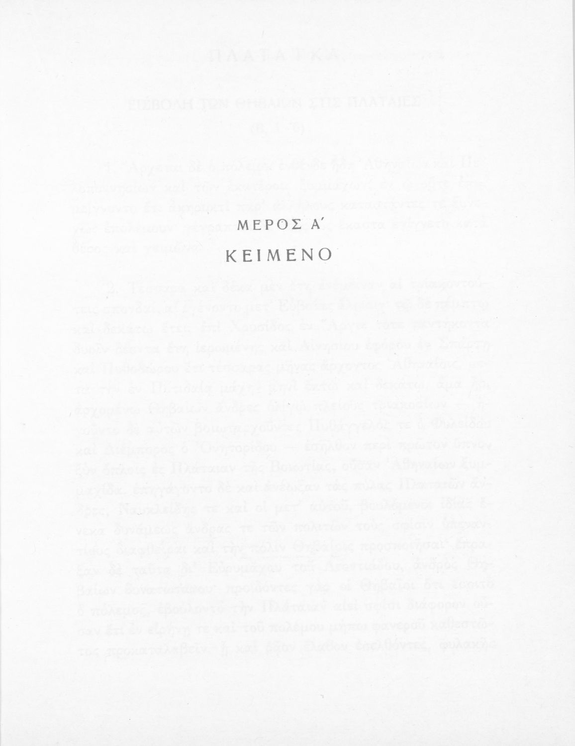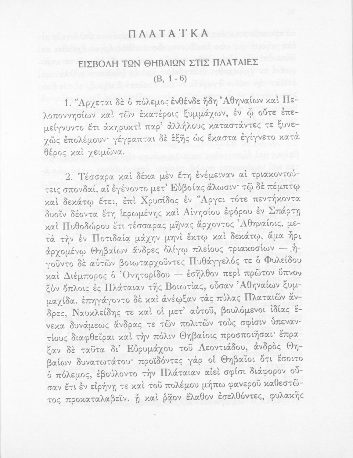 Σχολικό εγχειρίδιο Αρχαίων Ελληνικών για τις Δ΄, Ε΄ και ΣΤ΄ Γυμνασίου παλαιού τύπου που περιλαμβάνει σύντομο βιογραφικό σημείωμα του Θουκυδίδη, περιγραφή του ιστορικού πλαισίου, αποσπάσματα από τα Πλαταϊκά, τα