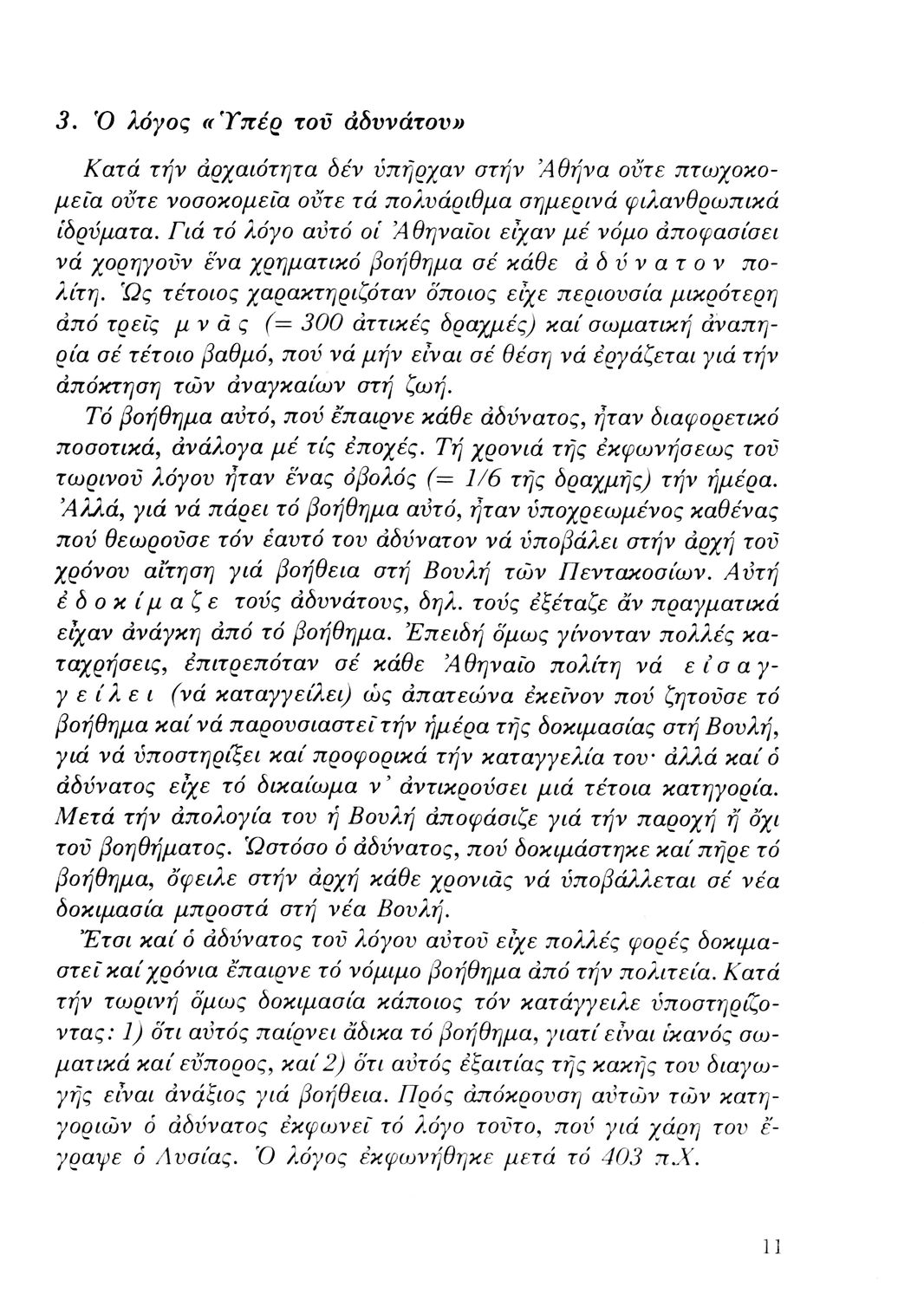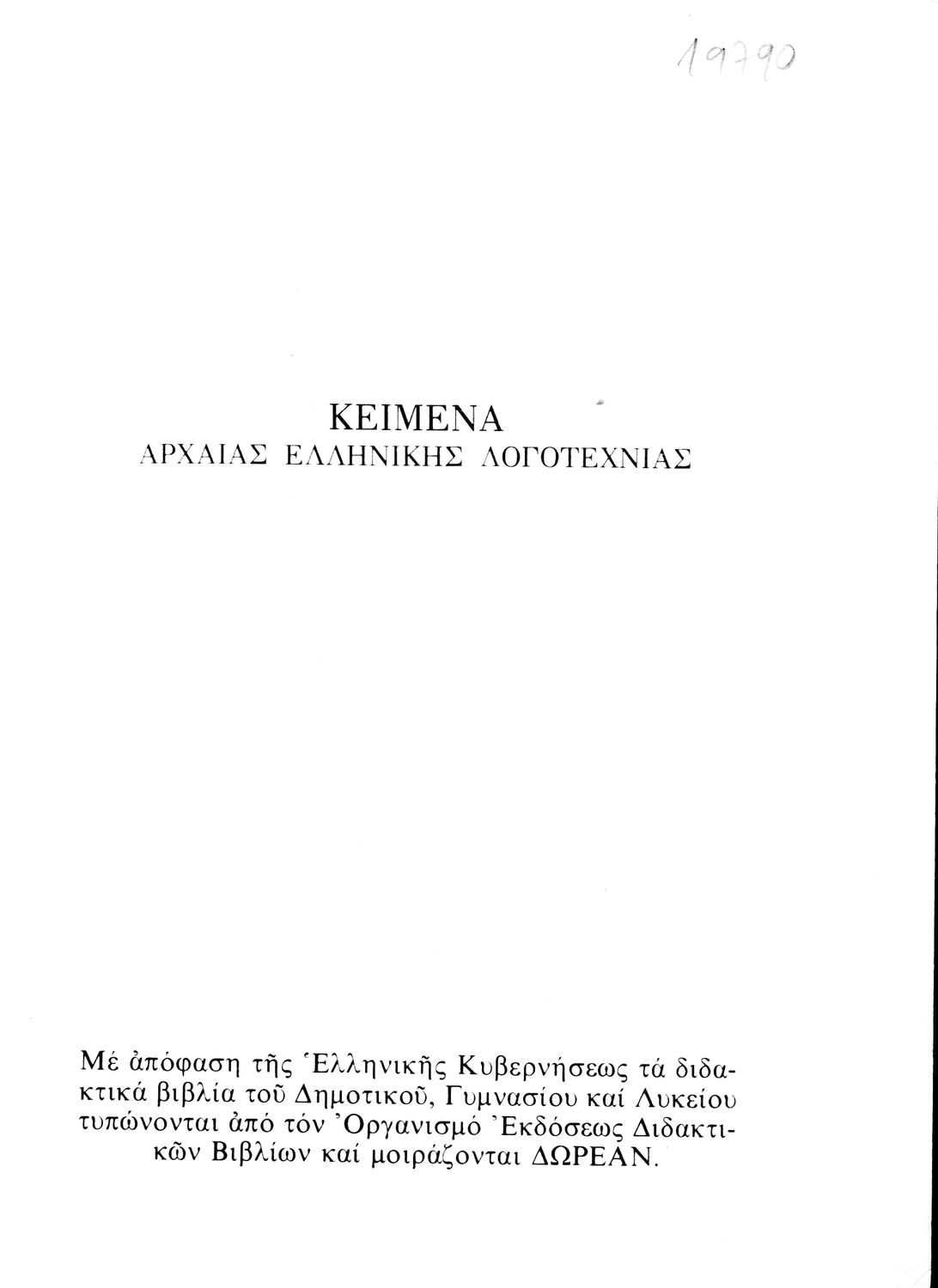 Σχολικό εγχειρίδιο Αρχαίων Ελληνικών Γ' Λυκείου που περιλαμβάνει αποσπάσματα από έργα αρχαίων Ελλήνων συγγραφέων και γραμματικές και ερμηνευτικές παρατηρήσεις.