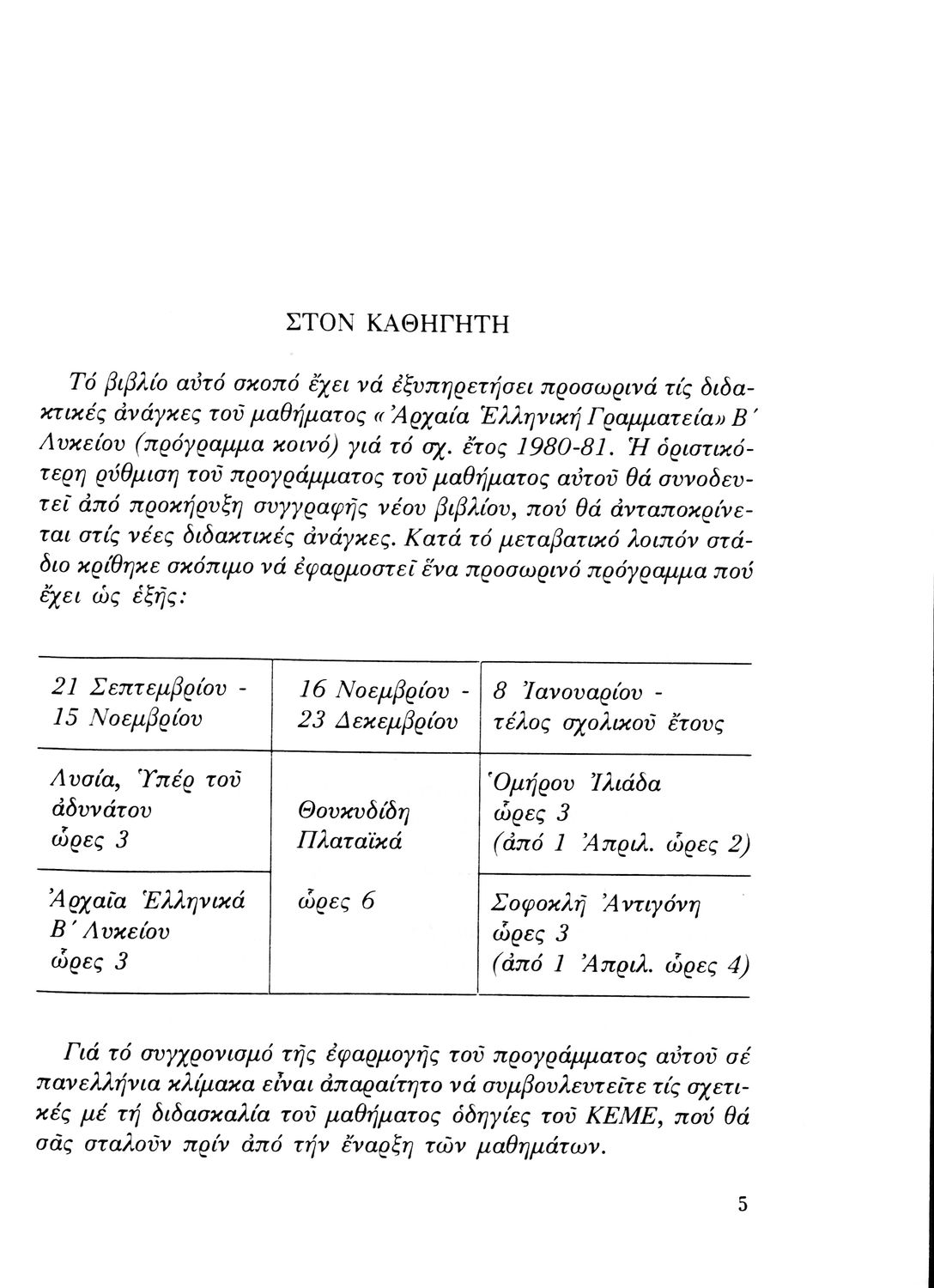 Σχολικό Εγχειρίδιο Αρχαίων Ελληνικών Α' και Β΄ Γυμνασίου που περιλαμβάνει κείμενα προσαρμοσμένα στη διδασκαλία των γραμματικών και συντακτικών φαινομένων, και ερμηνευτικές και λεξιλογικές σημειώσεις.