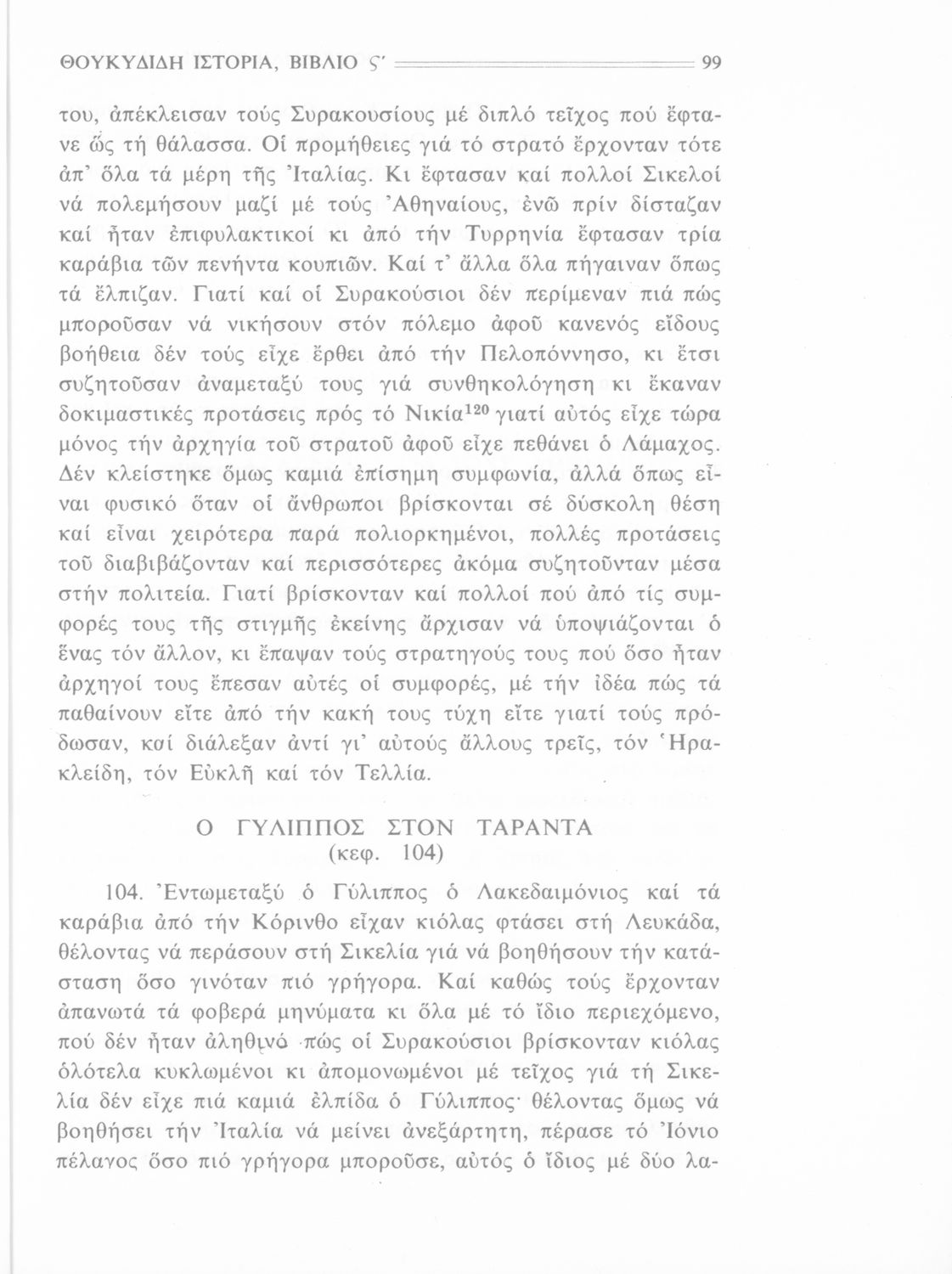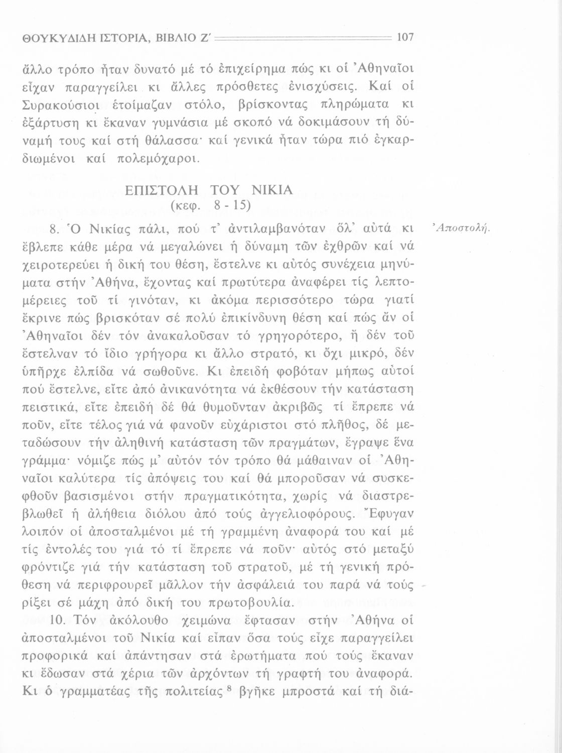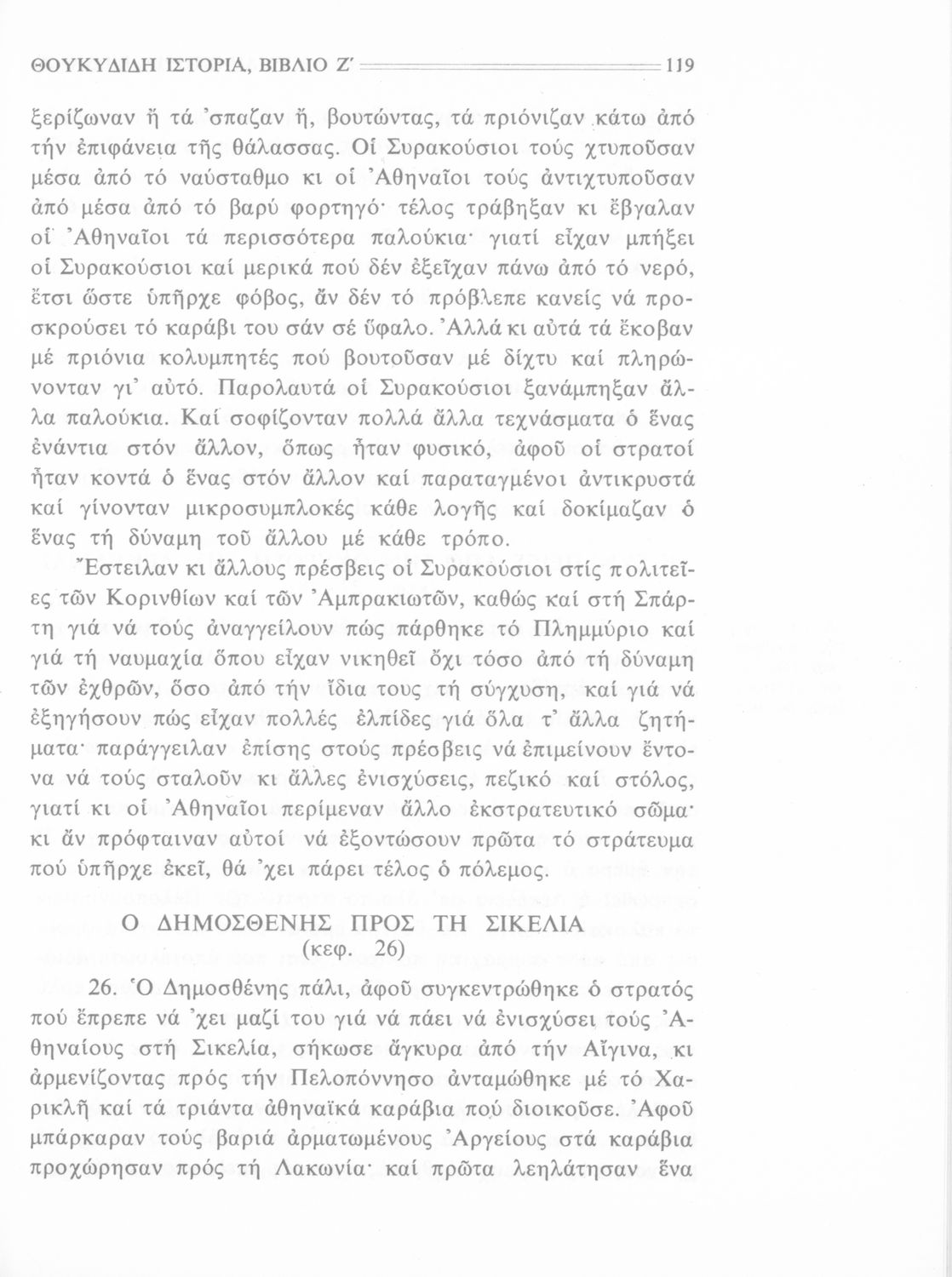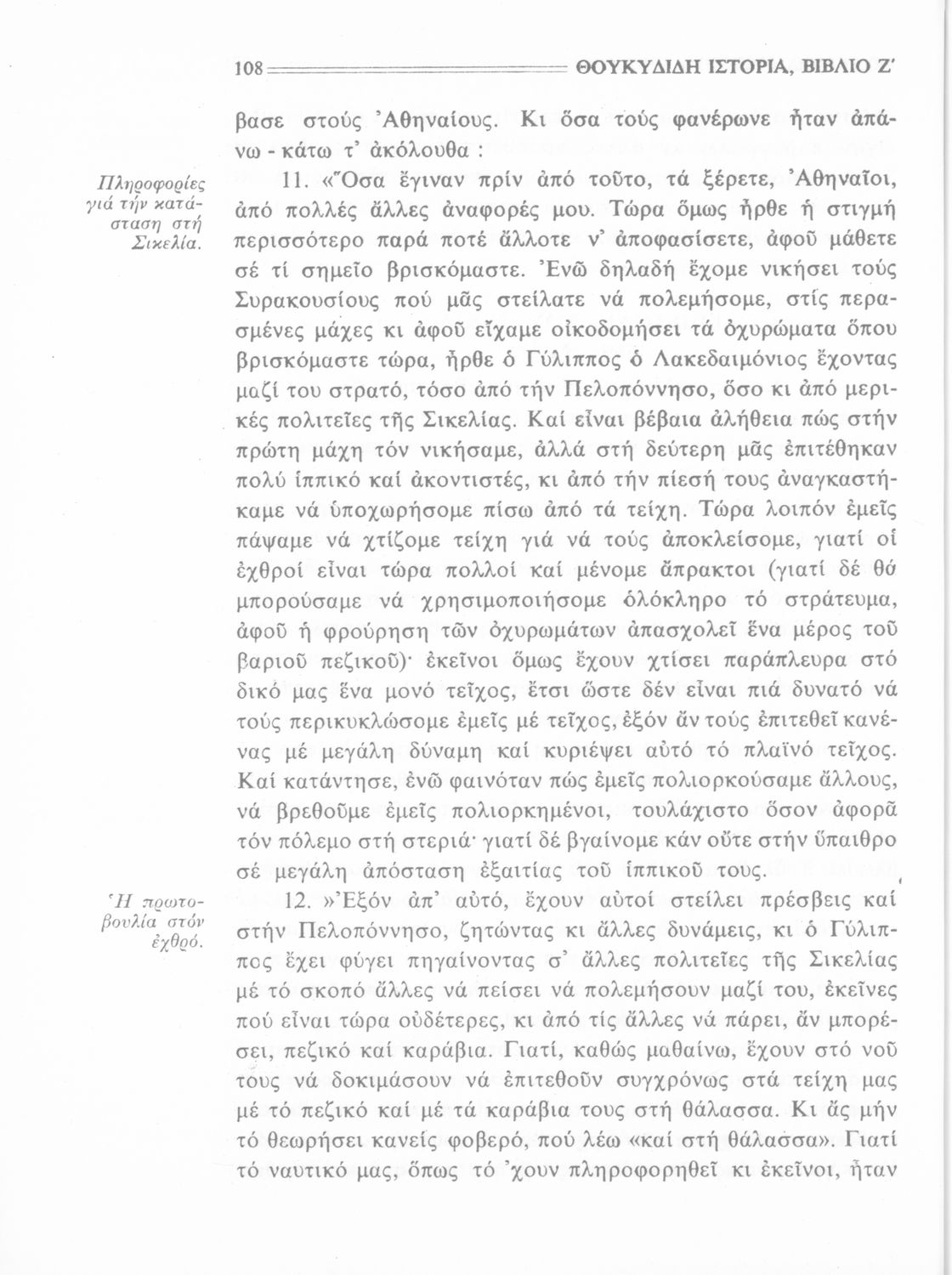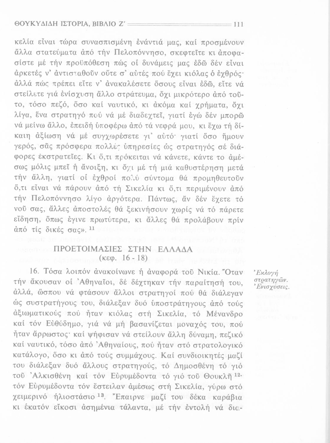 Σχολικό εγχειρίδιο Αρχαίων Ελληνικών Β΄ Γυμνασίου που περιλαμβάνει την μετάφραση των βιβλίων ΣΤ΄ και Ζ΄ της Ιστορίας του Θουκυδίδη, εισαγωγή στη ζωή και το έργο του, και ερμηνευτικά και πραγματολογικά σχόλια.