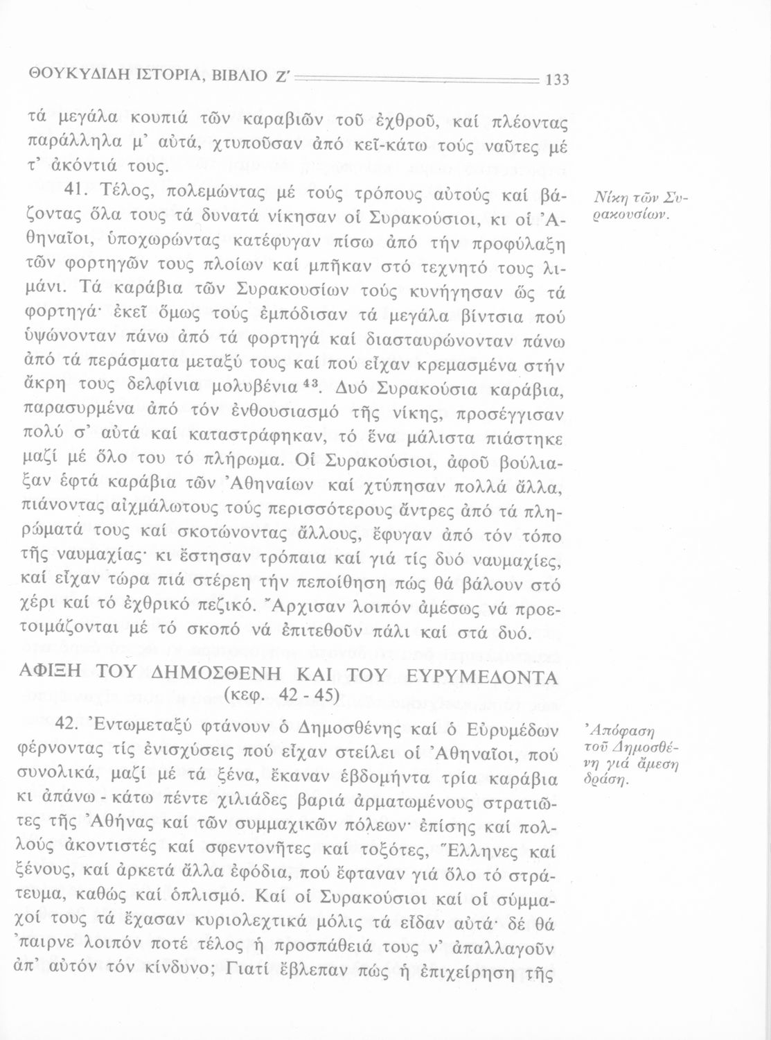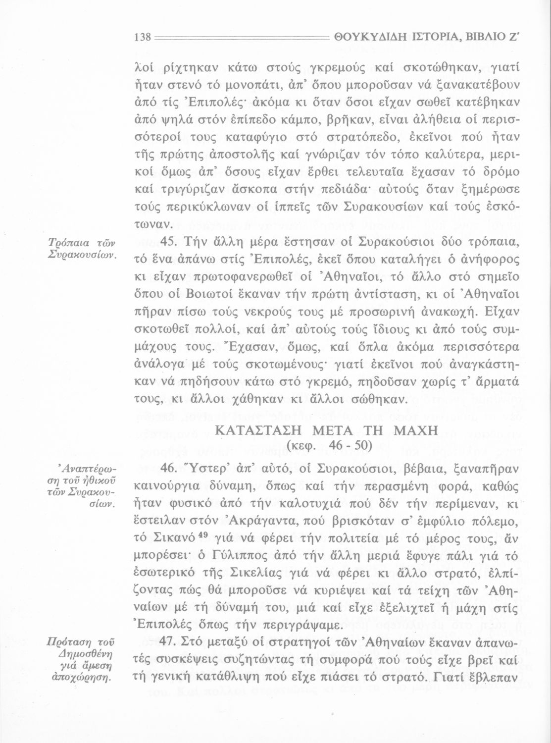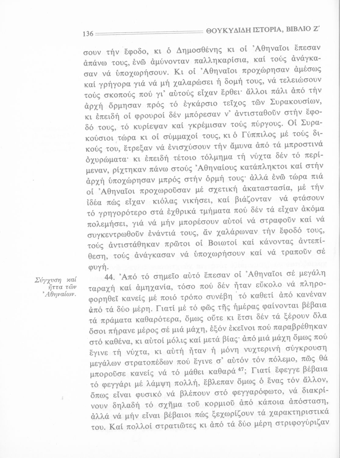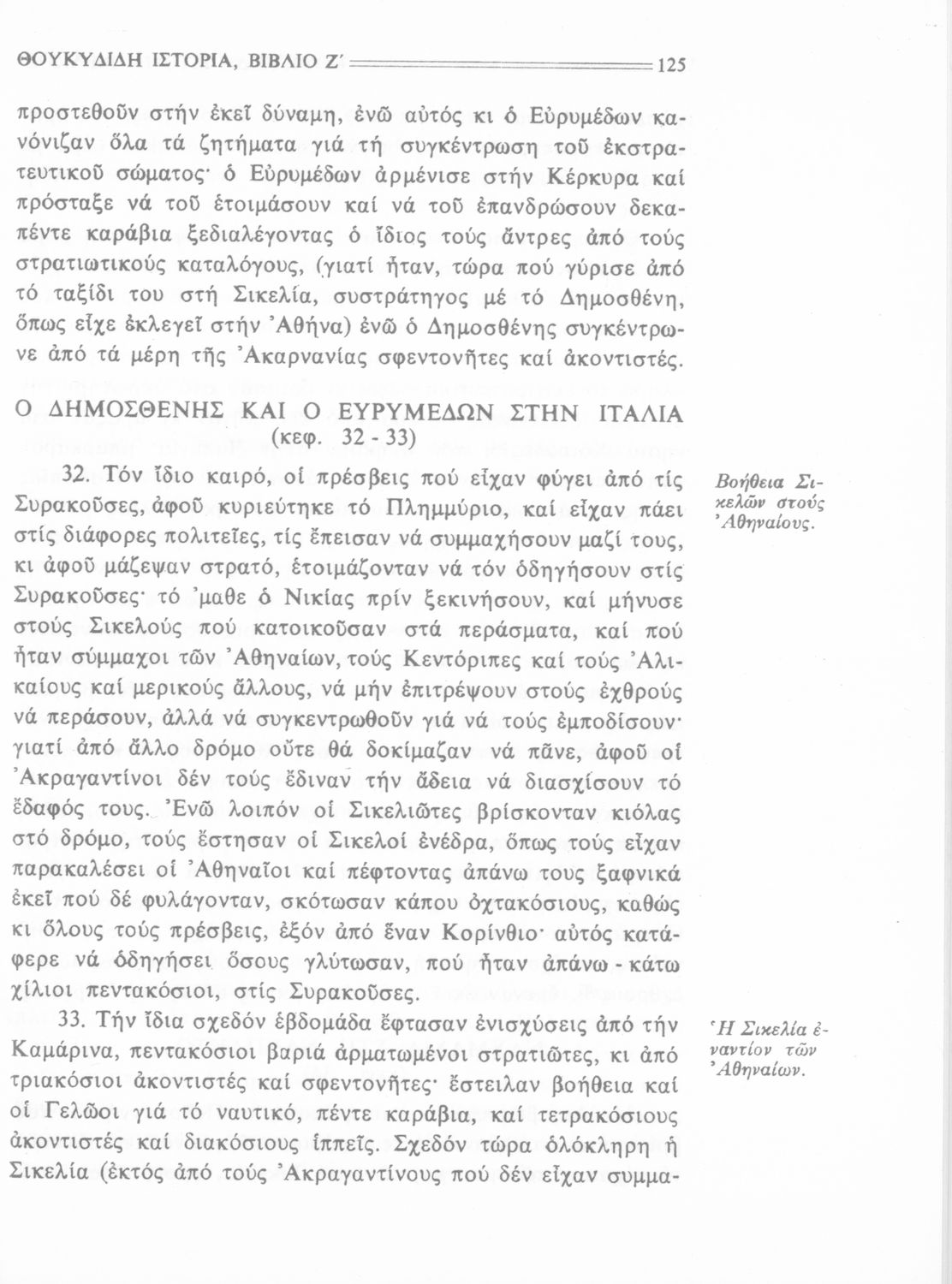 Σχολικό εγχειρίδιο Αρχαίων Ελληνικών Β΄ Γυμνασίου που περιλαμβάνει την μετάφραση των βιβλίων ΣΤ΄ και Ζ΄ της Ιστορίας του Θουκυδίδη, εισαγωγή στη ζωή και το έργο του, και ερμηνευτικά και πραγματολογικά σχόλια.