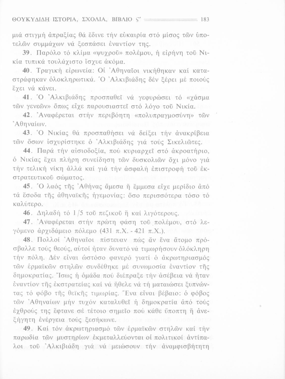 Σχολικό εγχειρίδιο Αρχαίων Ελληνικών Β΄ και Γ΄ Γυμνασίου που περιέχει αποσπάσματα από το έργο του Θουκυδίδη Ιστορία, και ερμηνευτικές και πραγματολογικές παρατηρήσεις.