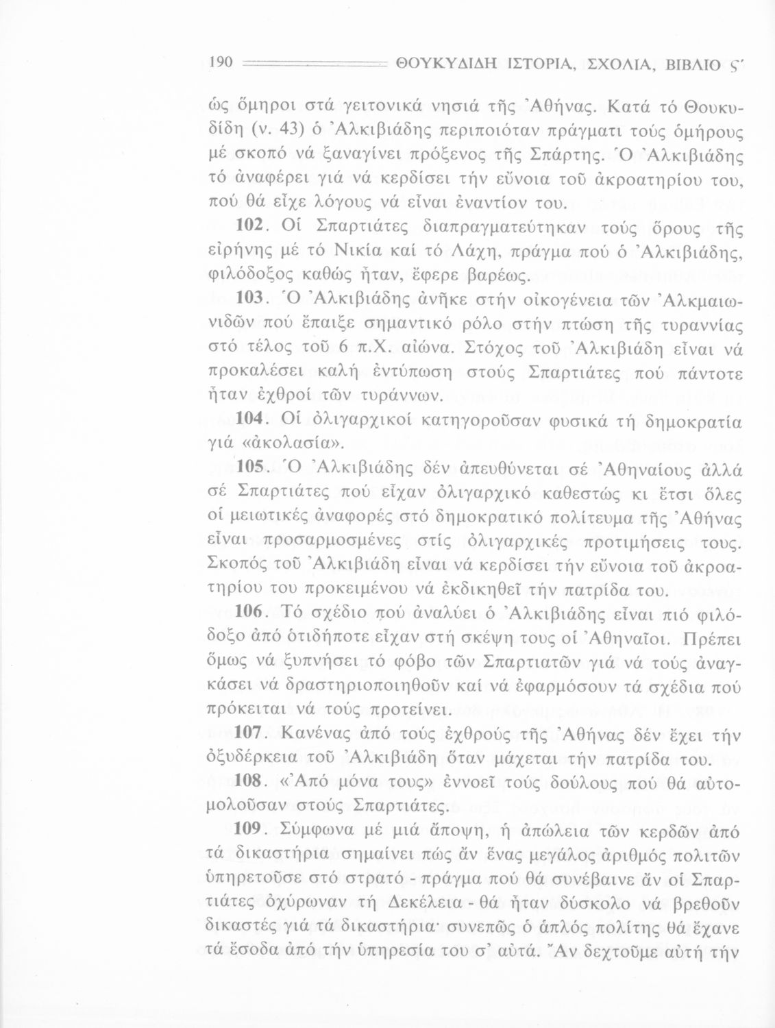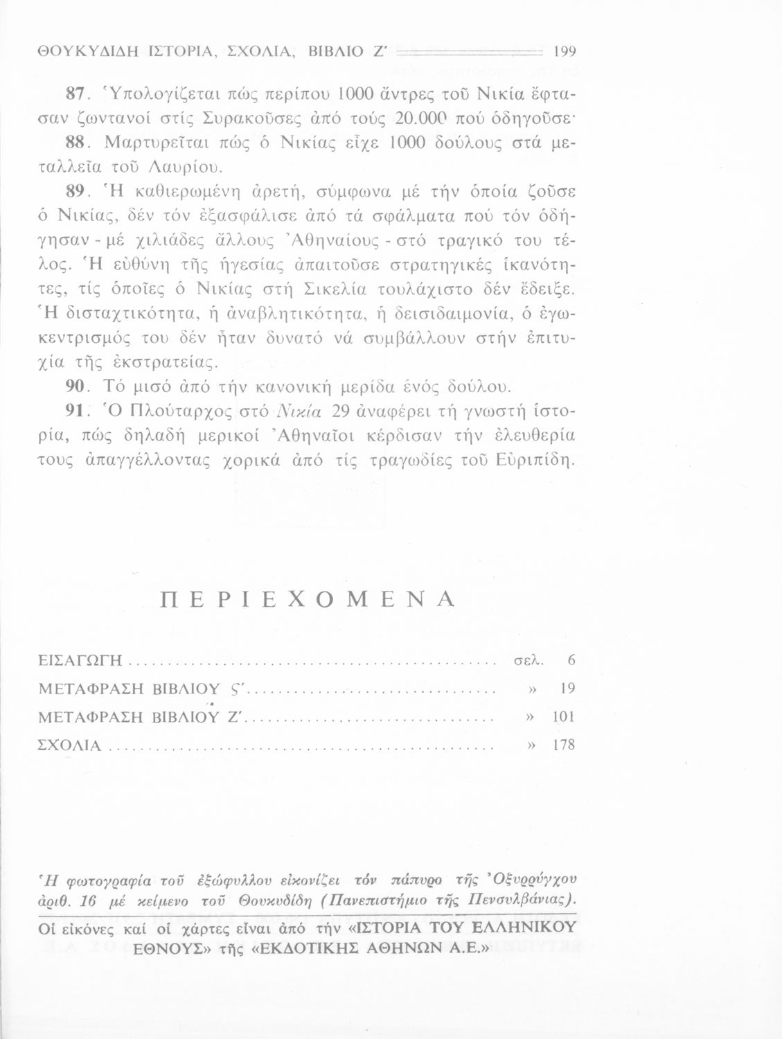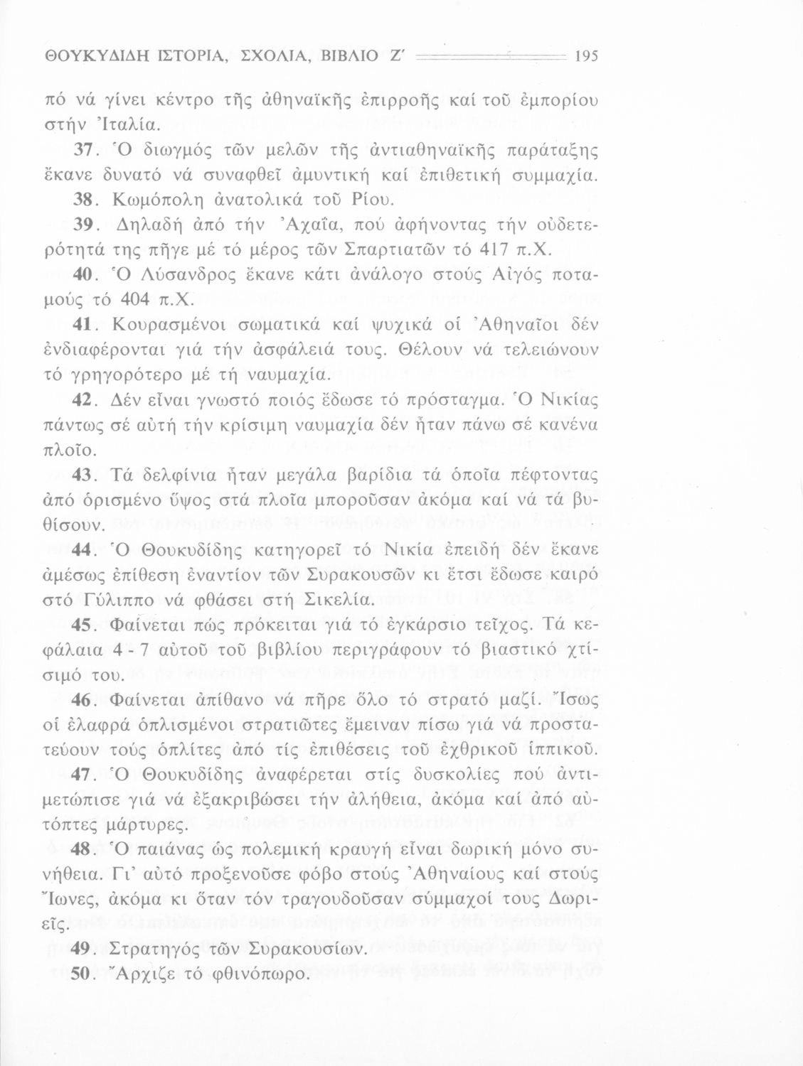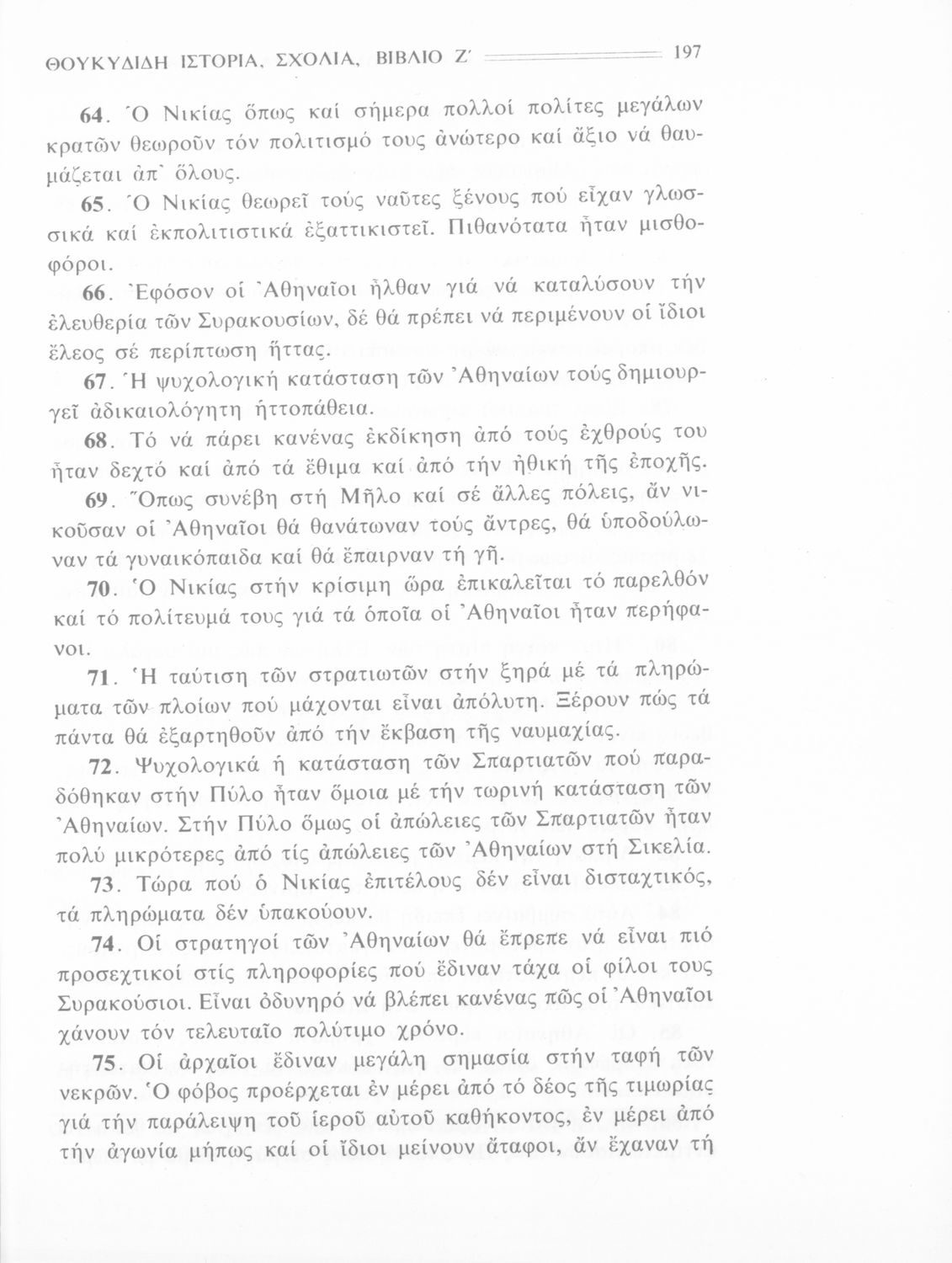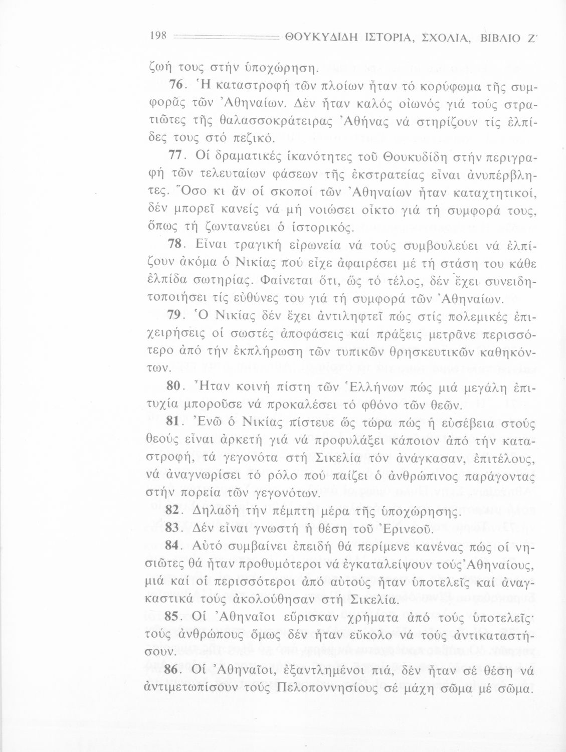 Σχολικό εγχειρίδιο Αρχαίων Ελληνικών Β΄ Γυμνασίου που περιλαμβάνει την μετάφραση των βιβλίων ΣΤ΄ και Ζ΄ της Ιστορίας του Θουκυδίδη, εισαγωγή στη ζωή και το έργο του, και ερμηνευτικά και πραγματολογικά σχόλια.