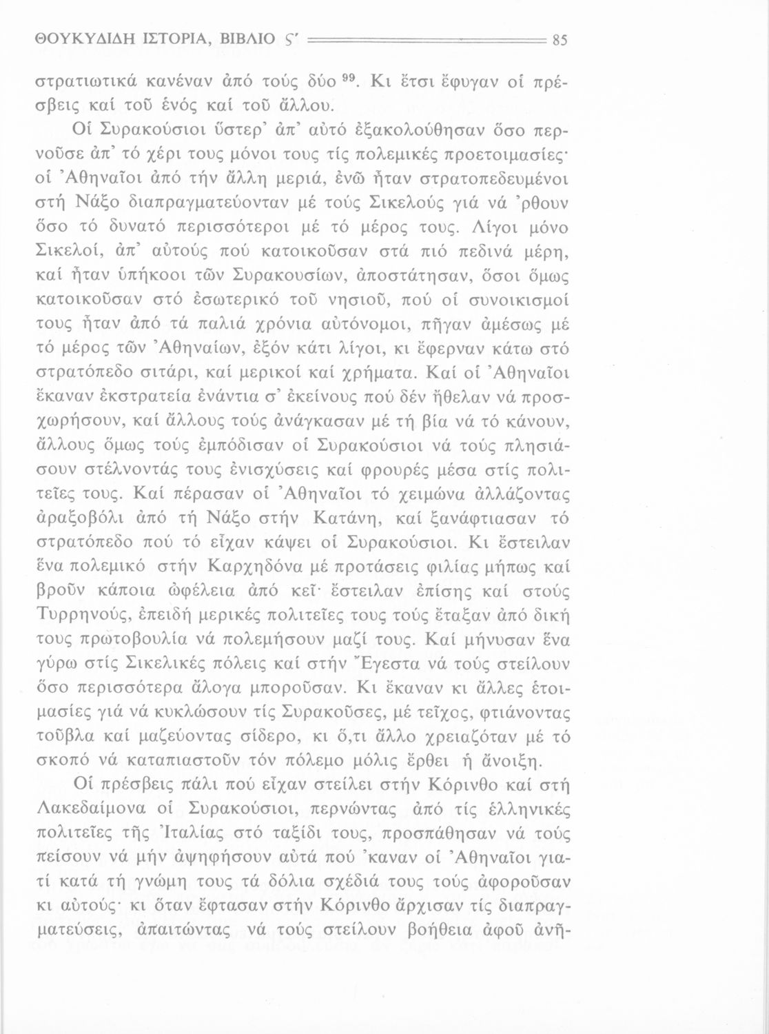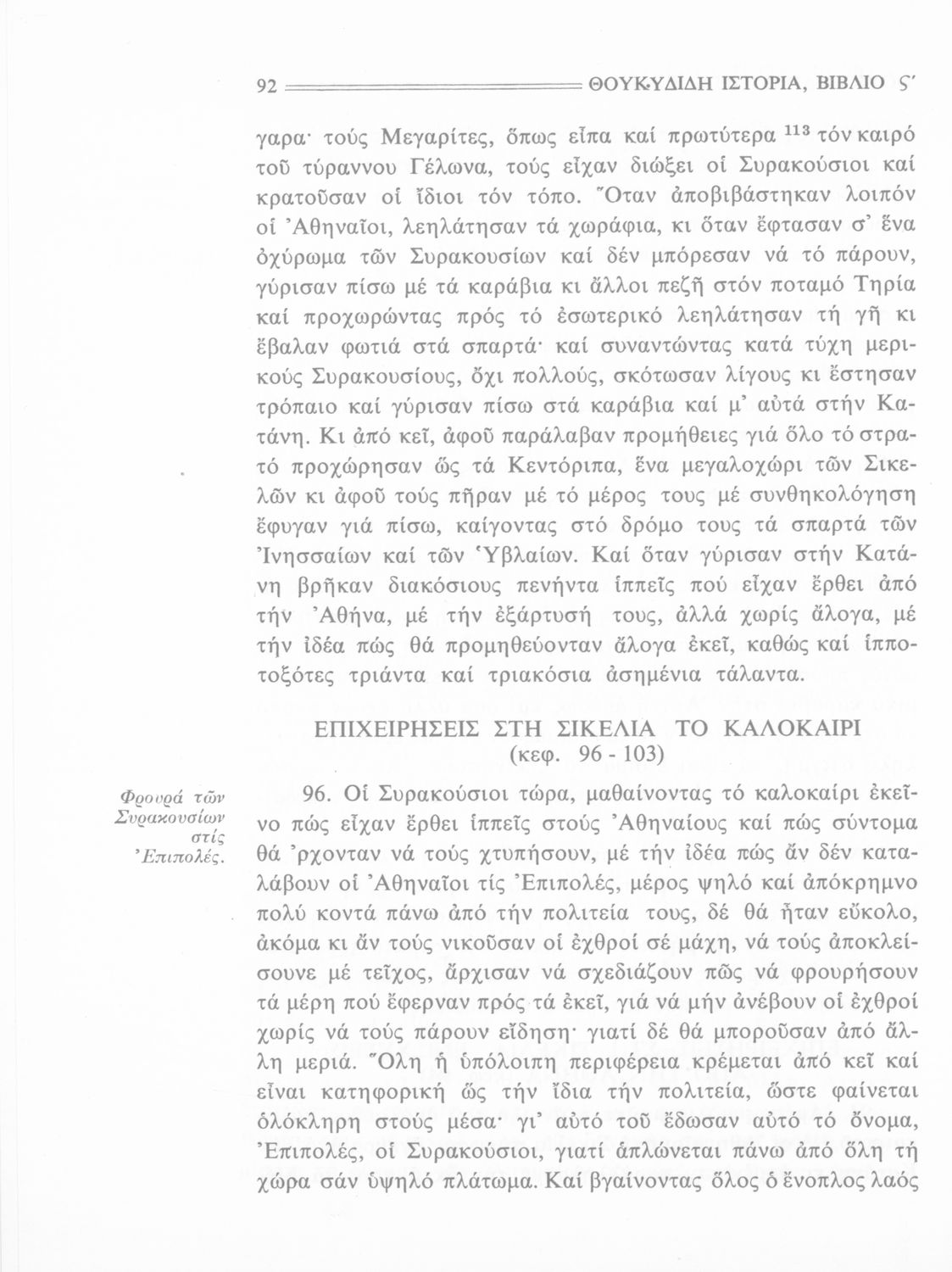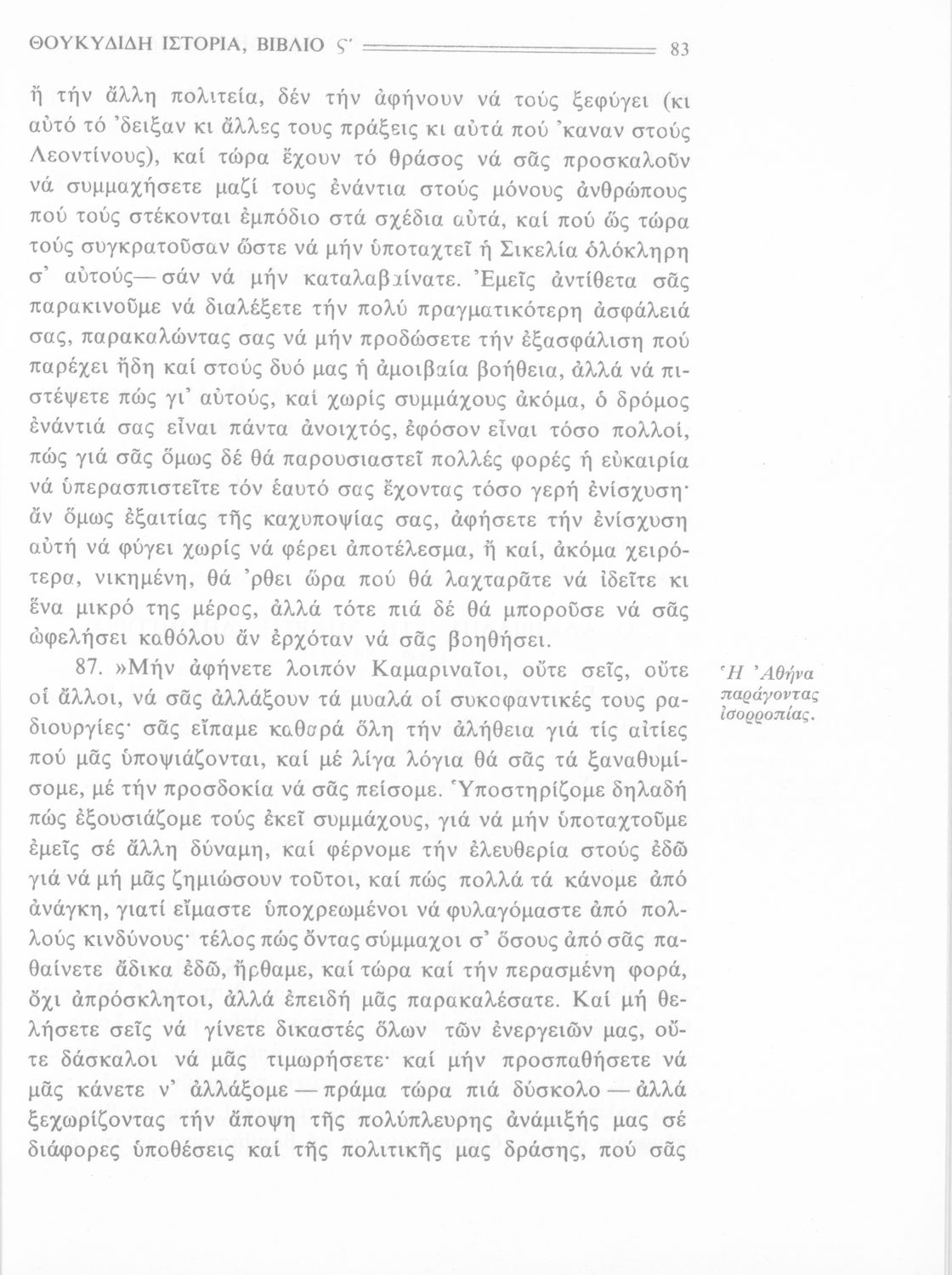 Σχολικό εγχειρίδιο Αρχαίων Ελληνικών Β΄ Γυμνασίου που περιλαμβάνει την μετάφραση των βιβλίων ΣΤ΄ και Ζ΄ της Ιστορίας του Θουκυδίδη, εισαγωγή στη ζωή και το έργο του, και ερμηνευτικά και πραγματολογικά σχόλια.