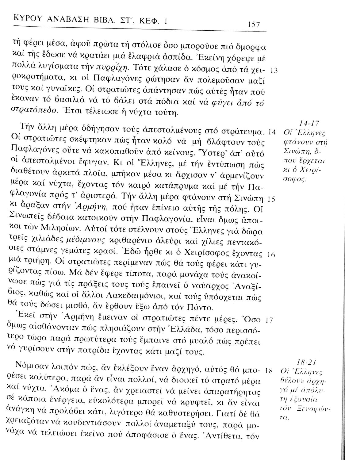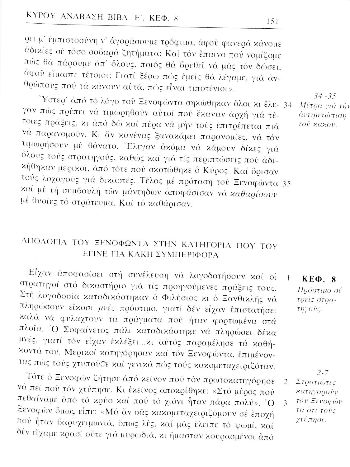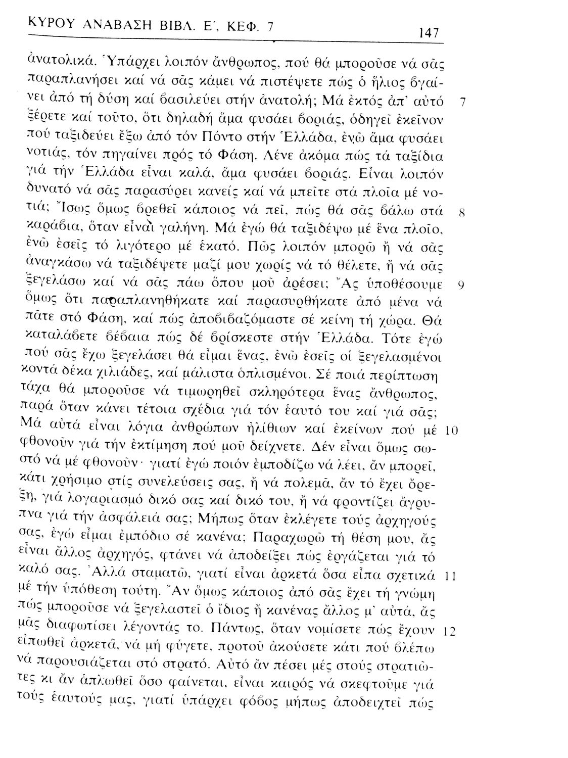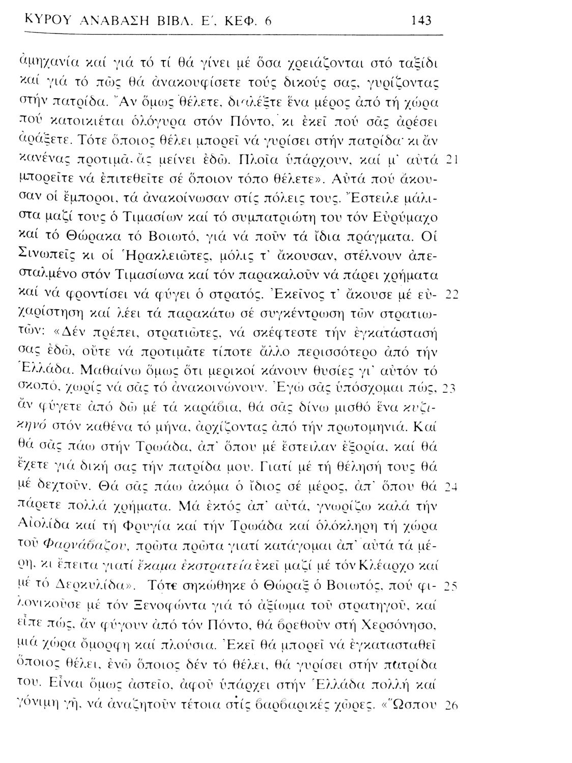 Σχολικό εγχειρίδιο Αρχαίων Ελληνικών α΄ Γυμνασίου που περιλαμβάνει μετάφραση του έργου του Ξενοφώντα Κύρου Ανάβασις, εισαγωγικά σχόλια για τη ζωή και το έργο του, και ερμηνευτικές παρατηρήσεις.