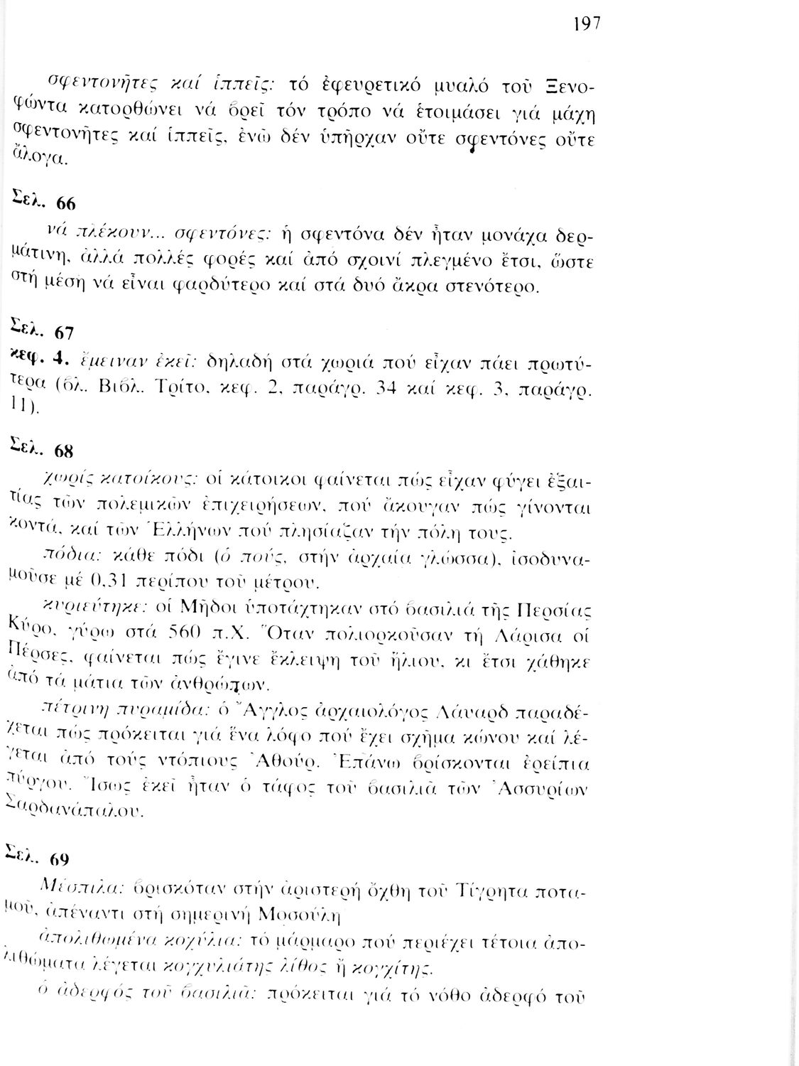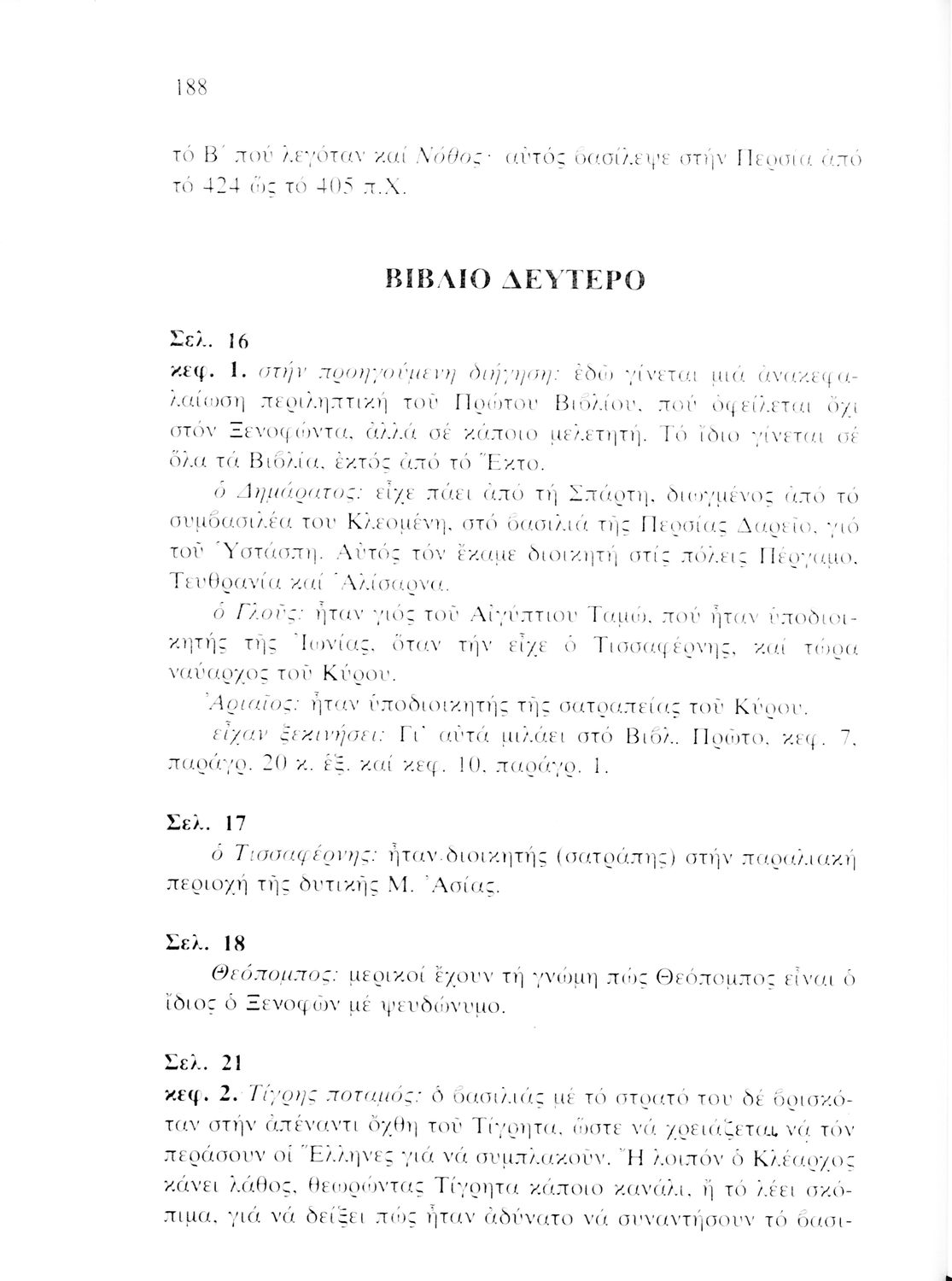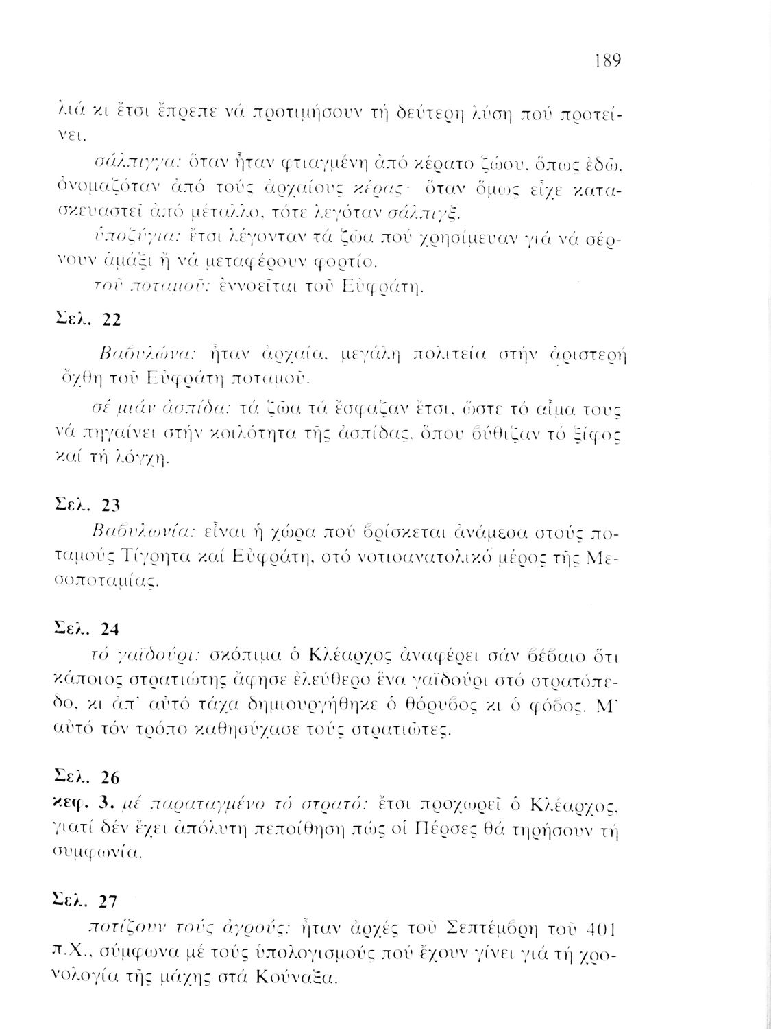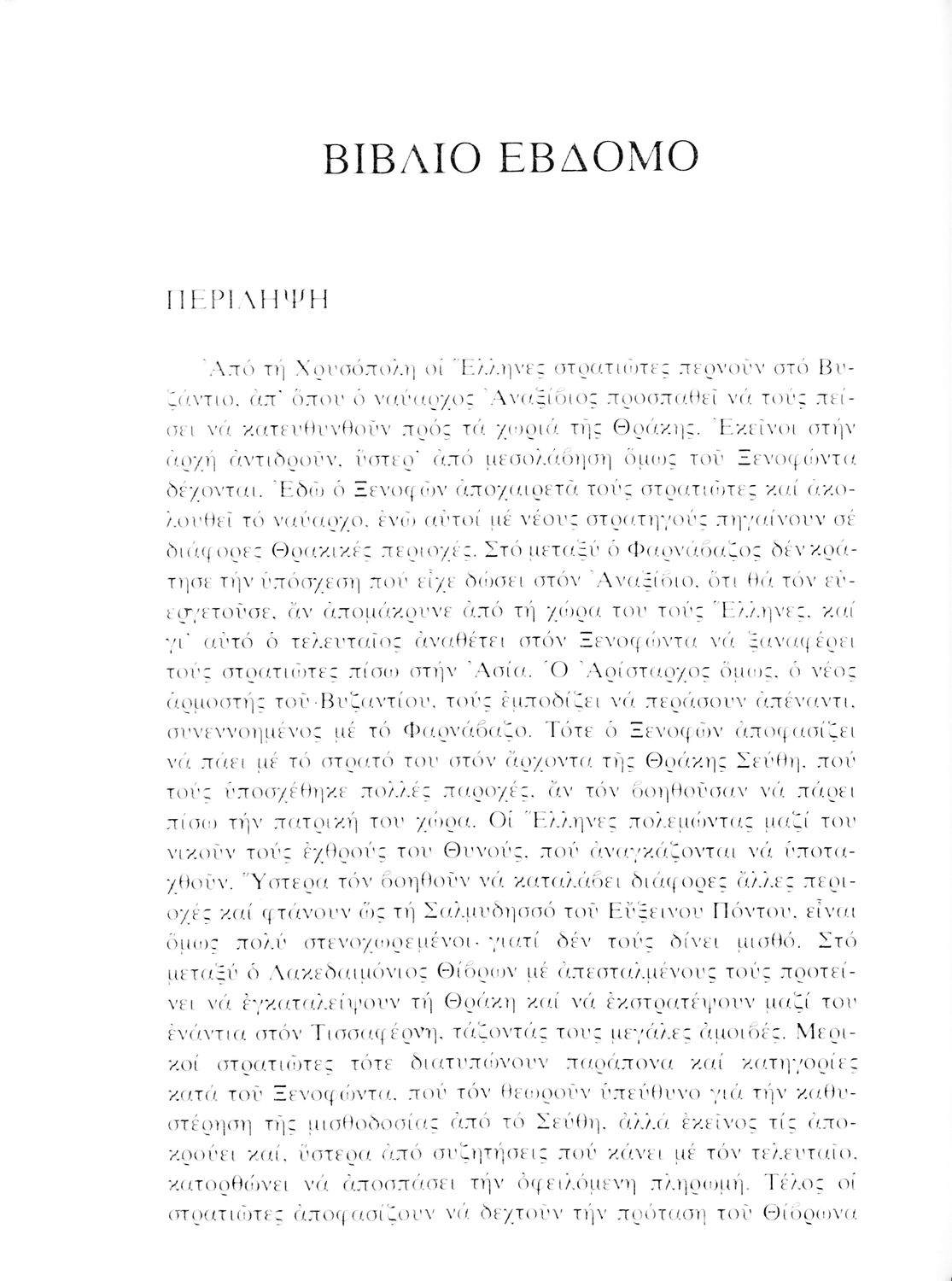 Σχολικό εγχειρίδιο Αρχαίων Ελληνικών. Το βιβλίο περιλαμβάνει εισαγωγή σχετικά με τη ζωή και το έργο του Ξενοφώντα. Ακολουθούν τα εφτά βιβλία της "Κύρου Ανάβασις" εκ των οποίων το Πρώτο και Έβδομο παρατίθενται περιληπτικά. Το βιβλίο φέρει σημειώσεις και σχέδια της μαθήτριας στην οποία ανήκε.