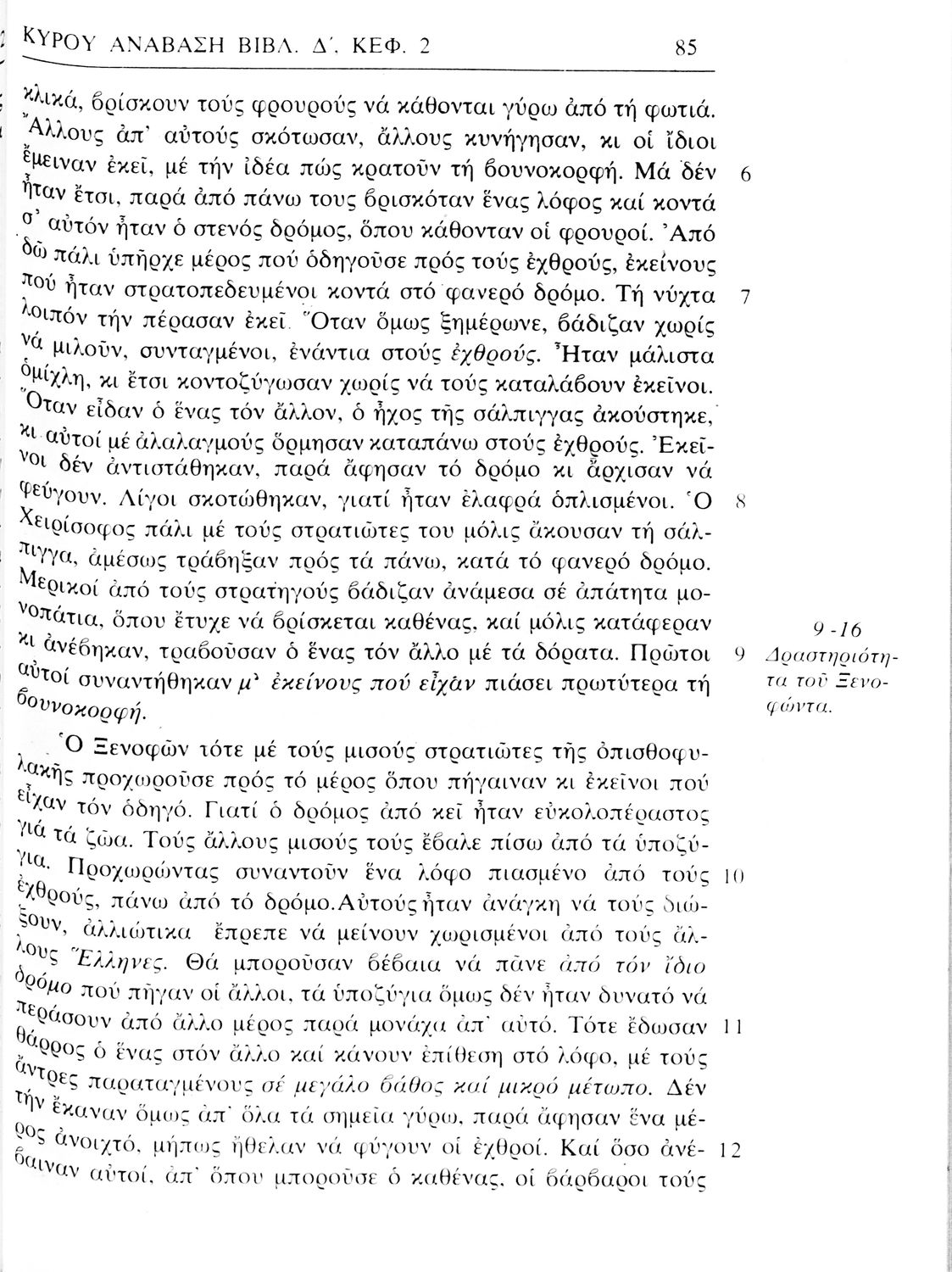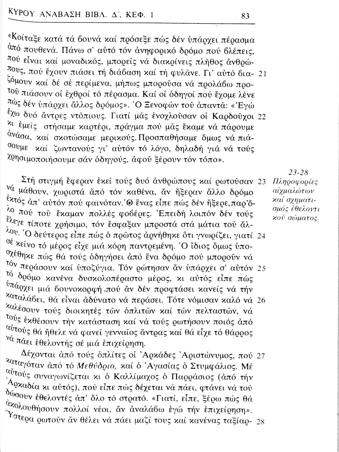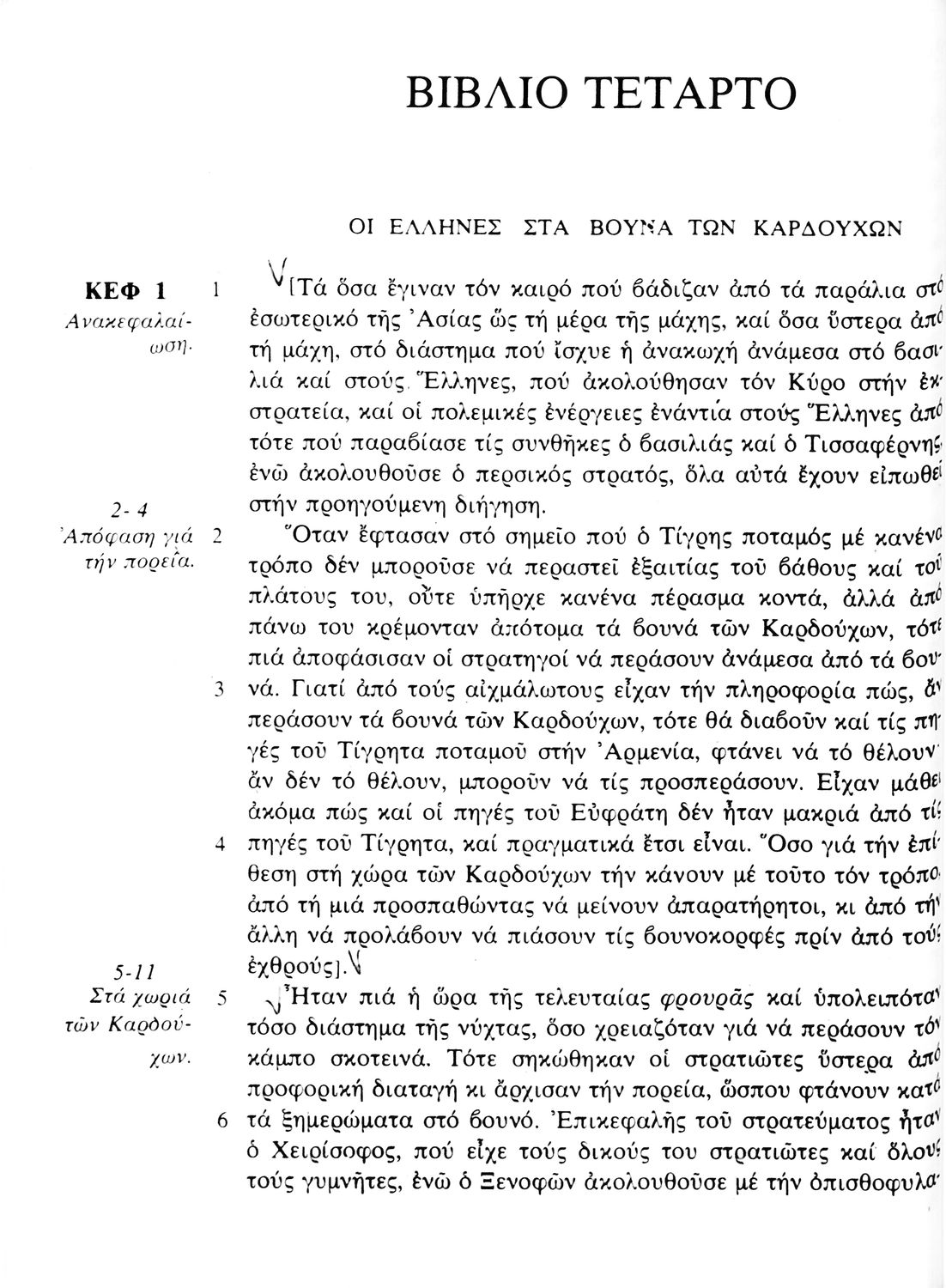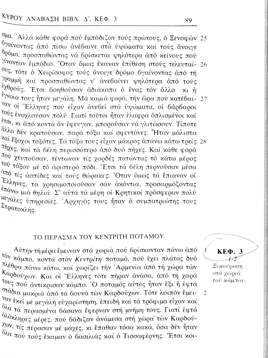 Σχολικό εγχειρίδιο Αρχαίων Ελληνικών. Το βιβλίο περιλαμβάνει εισαγωγή σχετικά με τη ζωή και το έργο του Ξενοφώντα. Ακολουθούν τα εφτά βιβλία της "Κύρου Ανάβασις" εκ των οποίων το Πρώτο και Έβδομο παρατίθενται περιληπτικά. Το βιβλίο φέρει σημειώσεις και σχέδια της μαθήτριας στην οποία ανήκε.
