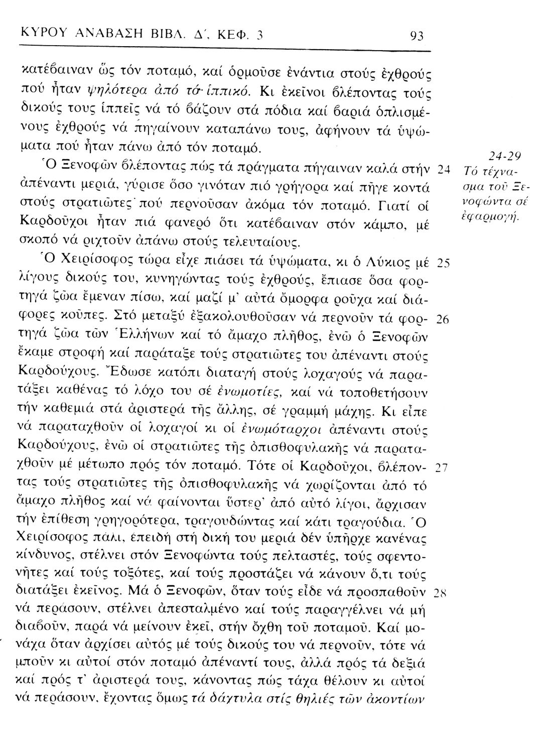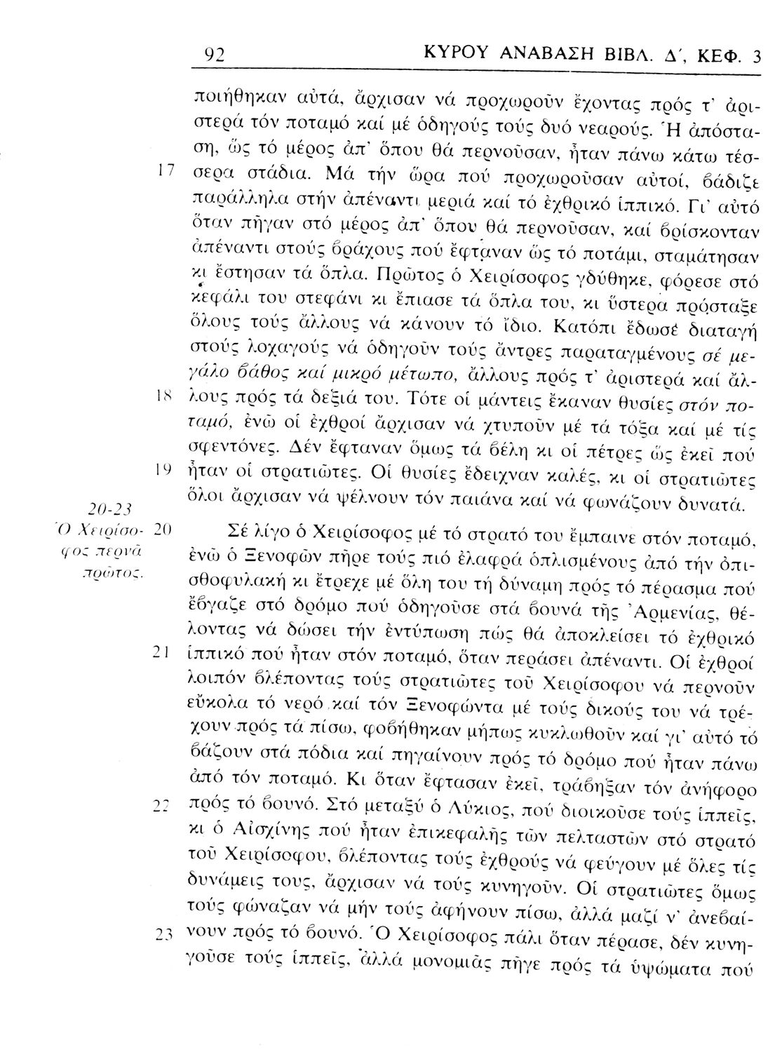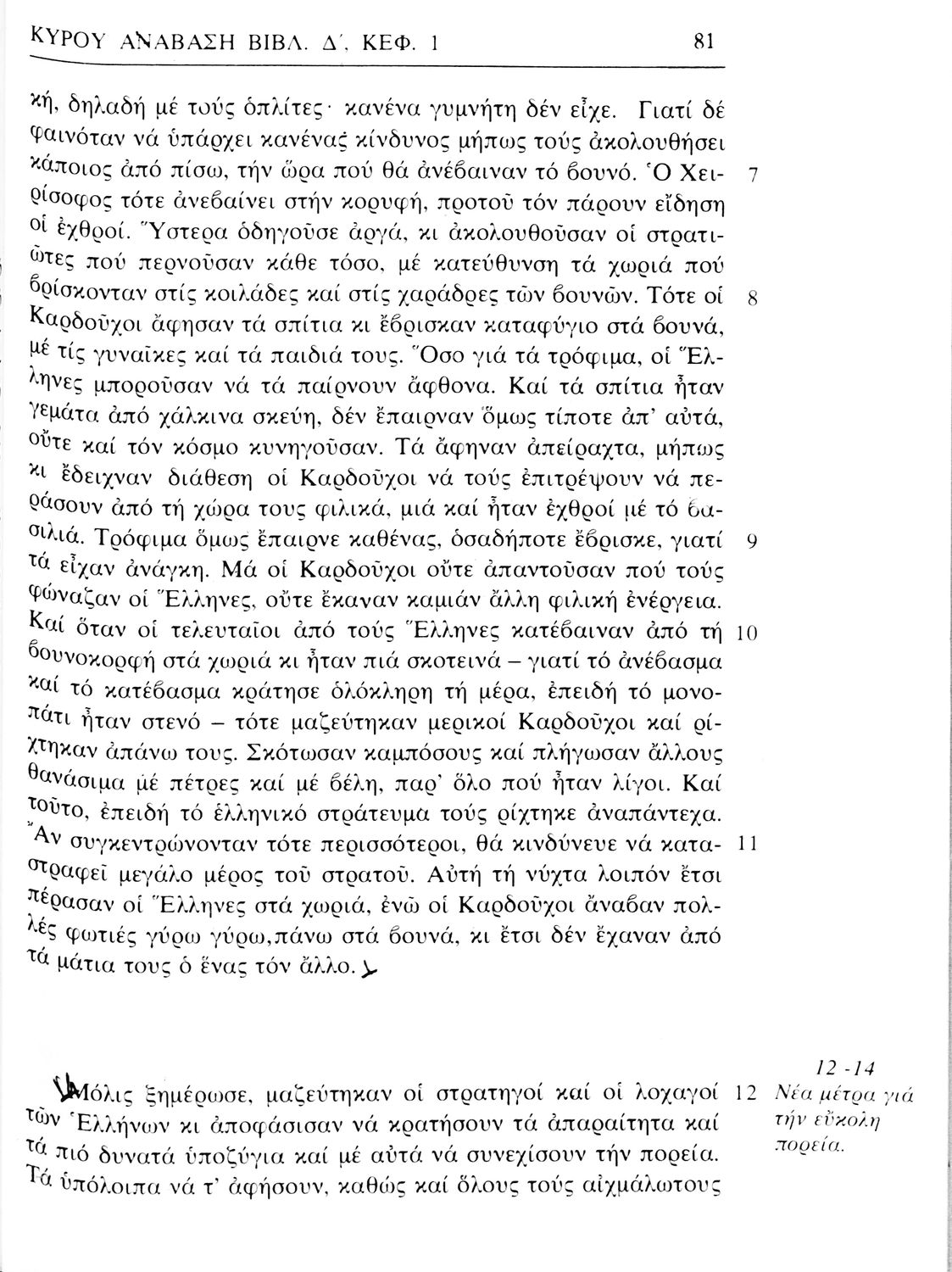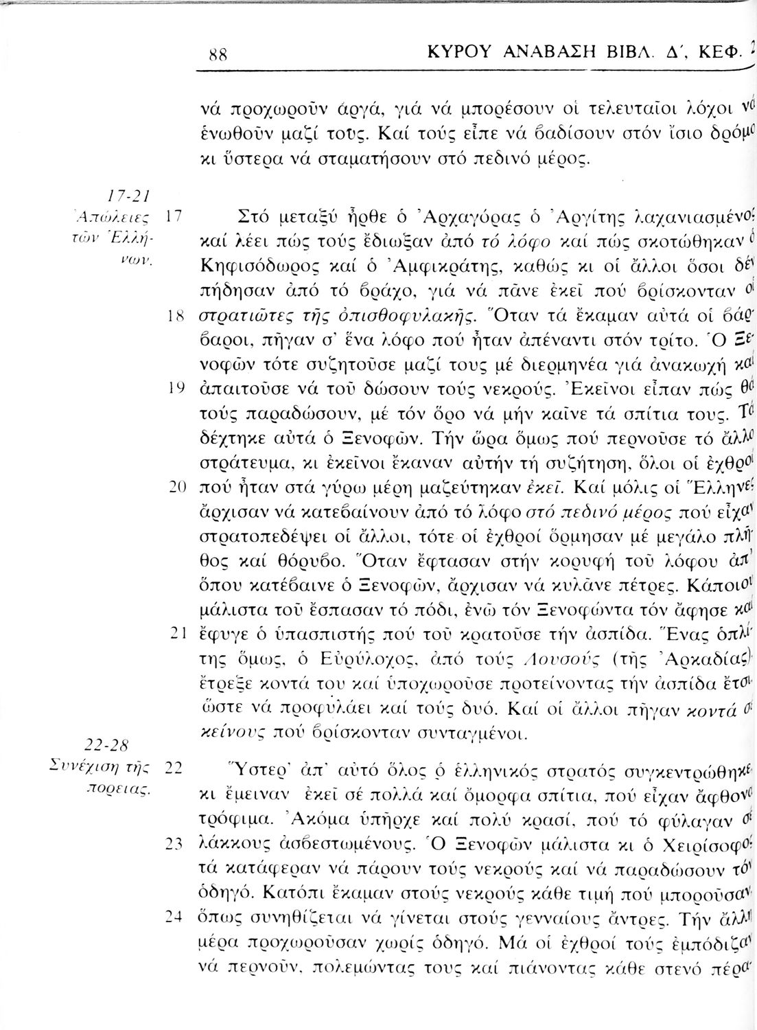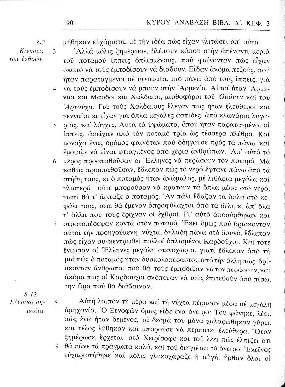 Σχολικό εγχειρίδιο Αρχαίων Ελληνικών. Το βιβλίο περιλαμβάνει εισαγωγή σχετικά με τη ζωή και το έργο του Ξενοφώντα. Ακολουθούν τα εφτά βιβλία της "Κύρου Ανάβασις" εκ των οποίων το Πρώτο και Έβδομο παρατίθενται περιληπτικά. Το βιβλίο φέρει σημειώσεις και σχέδια της μαθήτριας στην οποία ανήκε.