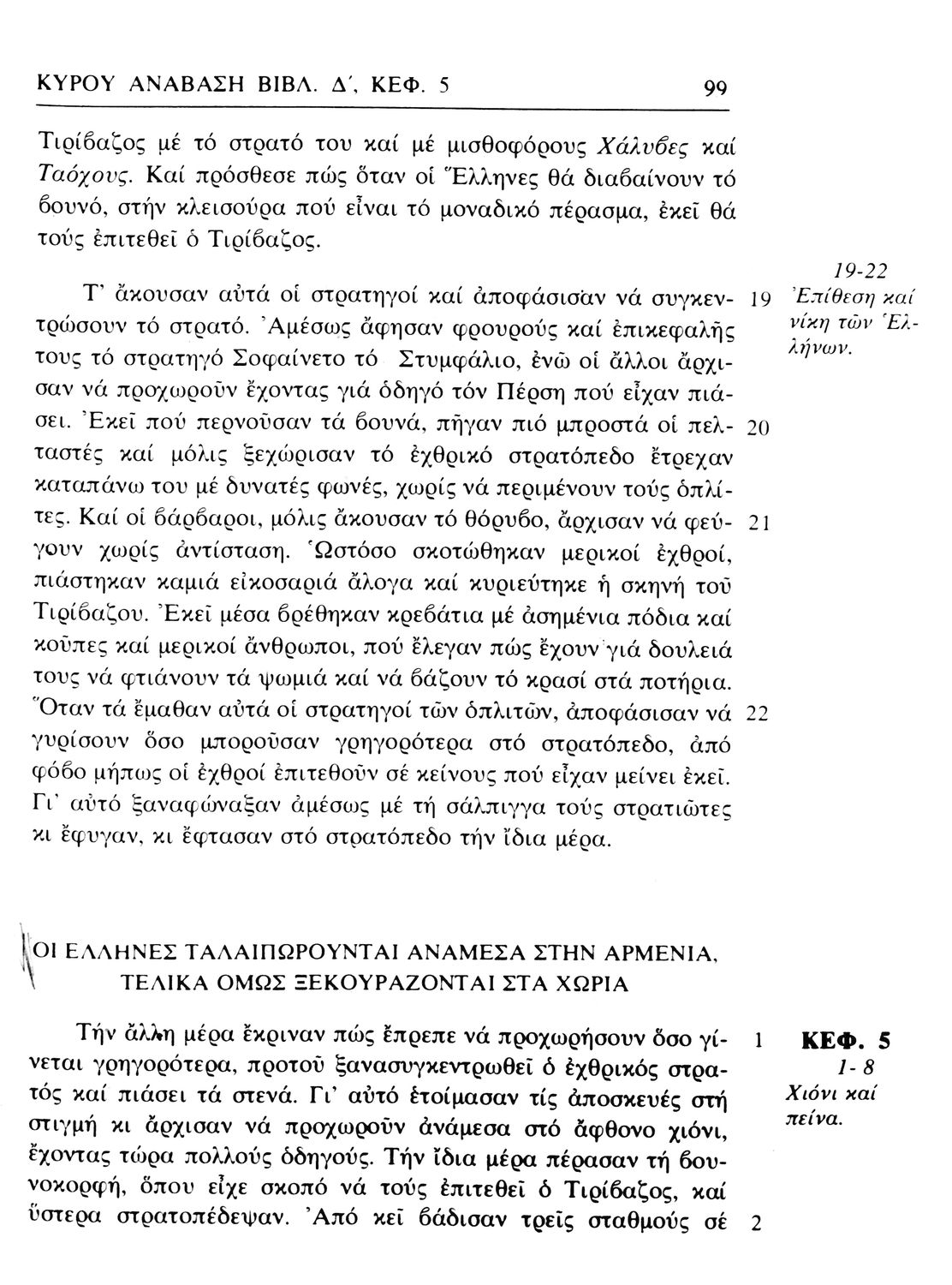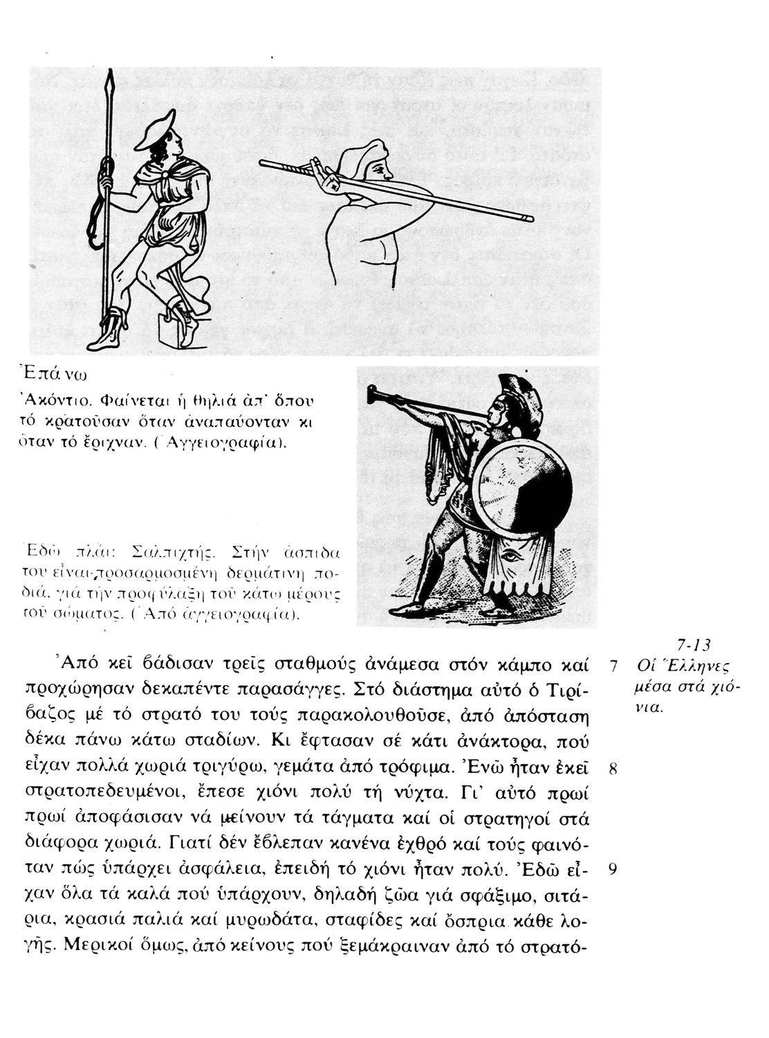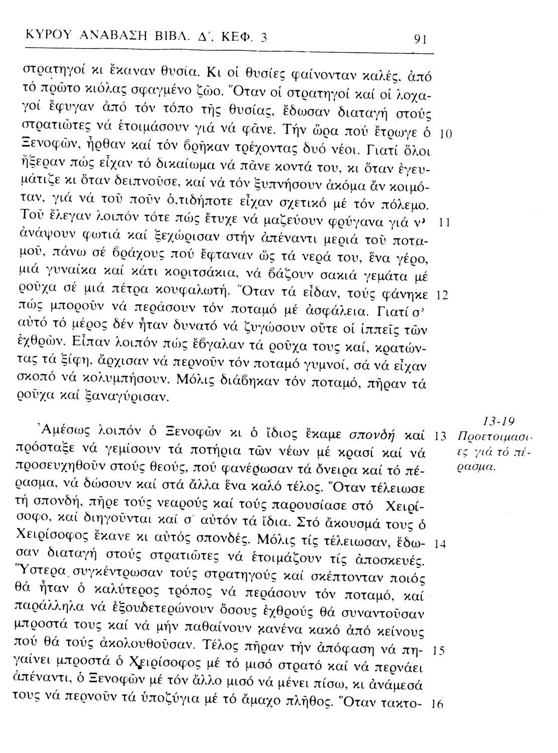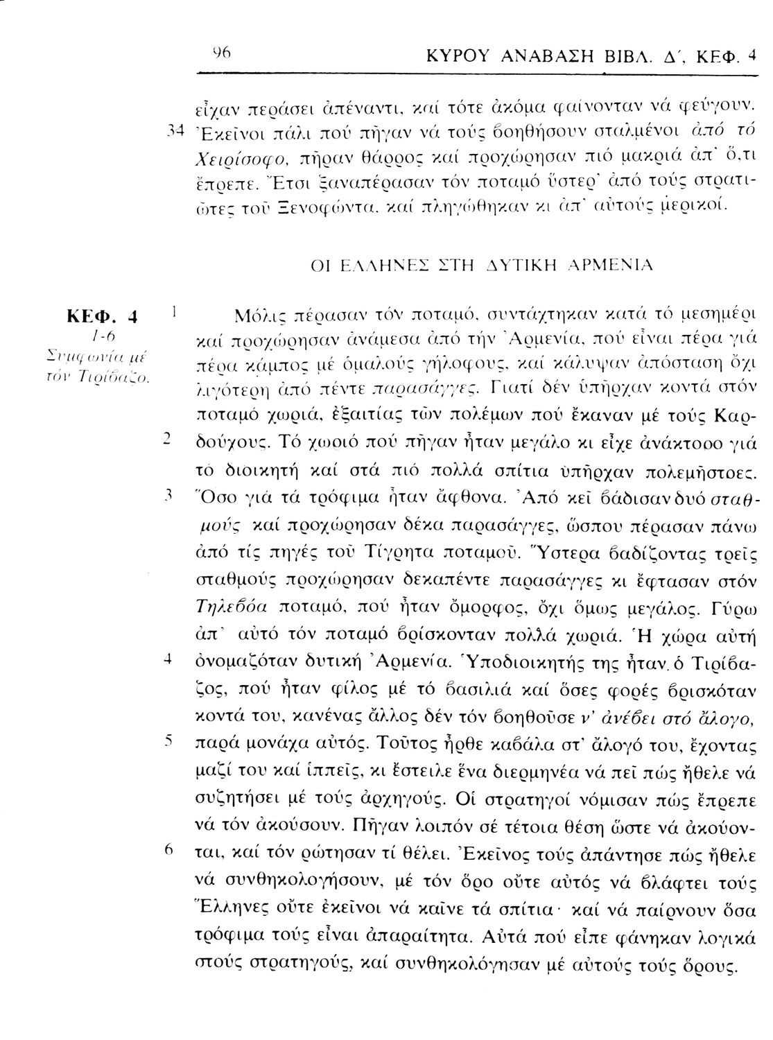 Σχολικό εγχειρίδιο Αρχαίων Ελληνικών. Το βιβλίο περιλαμβάνει εισαγωγή σχετικά με τη ζωή και το έργο του Ξενοφώντα. Ακολουθούν τα εφτά βιβλία της "Κύρου Ανάβασις" εκ των οποίων το Πρώτο και Έβδομο παρατίθενται περιληπτικά. Το βιβλίο φέρει σημειώσεις και σχέδια της μαθήτριας στην οποία ανήκε.