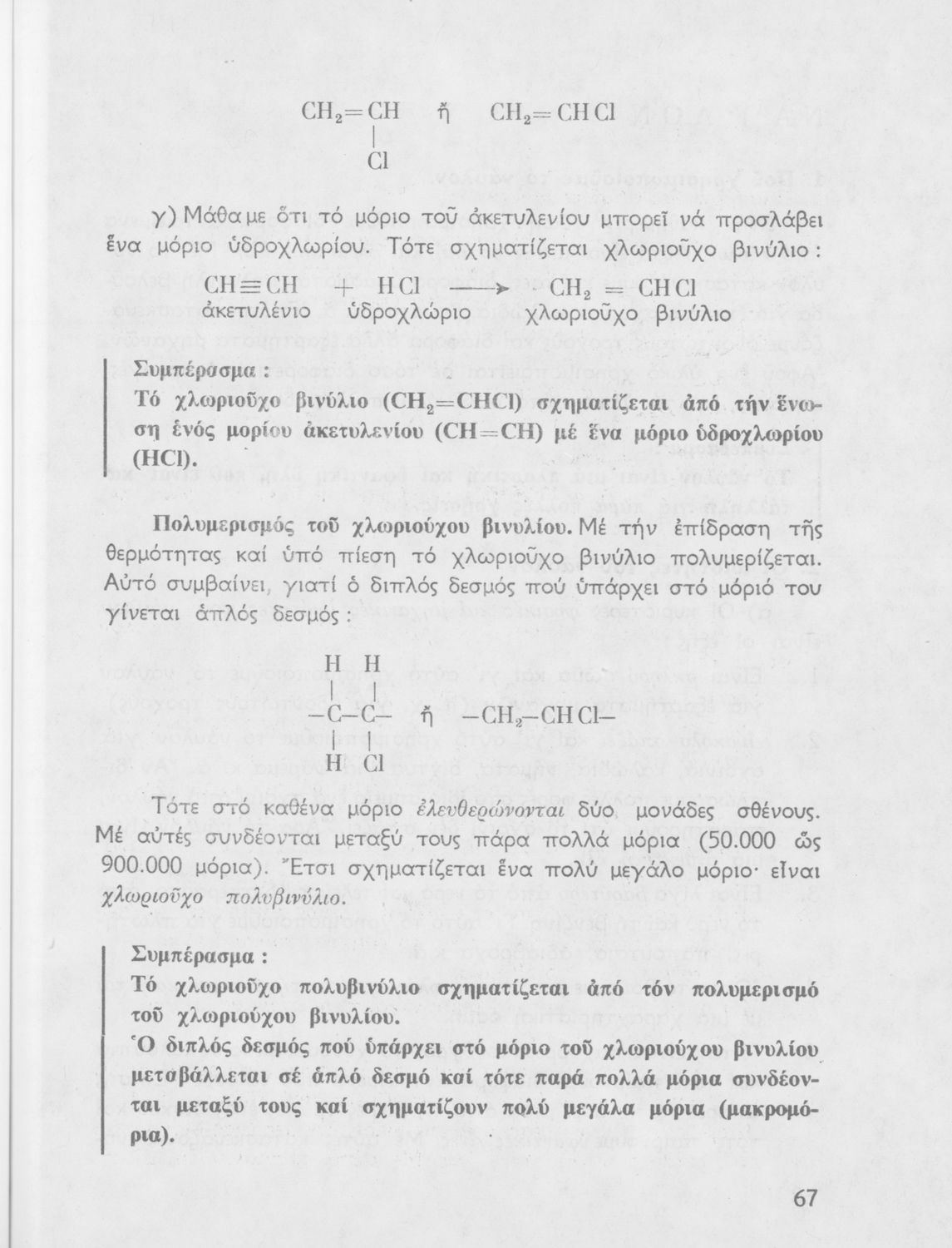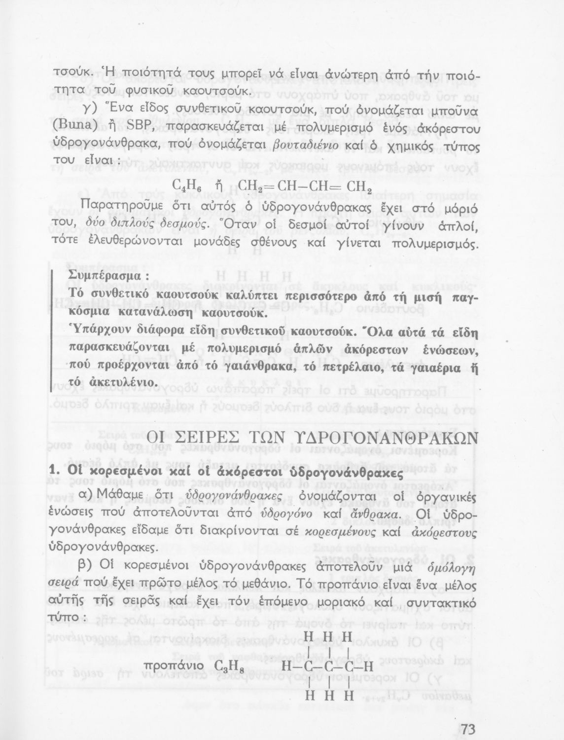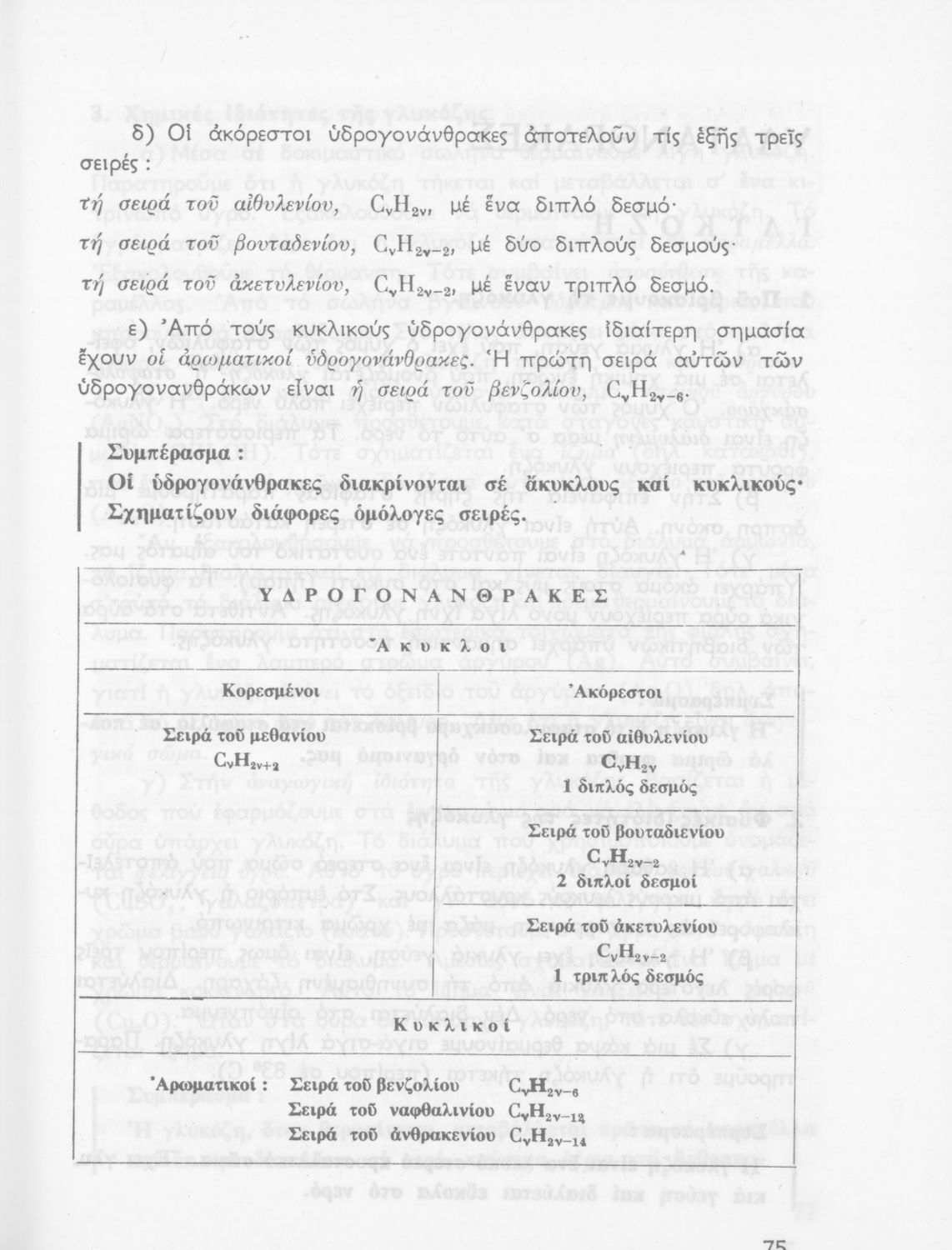 Σχολικό εγχειρίδιο Χημείας Γ΄ Γυμνασίου που περιέχει εισαγωγή στην οργανική χημεία και εστιάζει στους υδρογονάνθρακες, τα σάκχαρα και τα λιπαρά σώματα. Φέρει το σύμβολο της δικτατορίας.