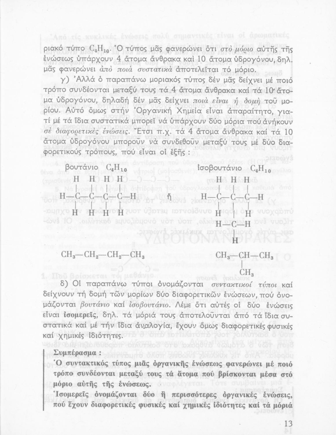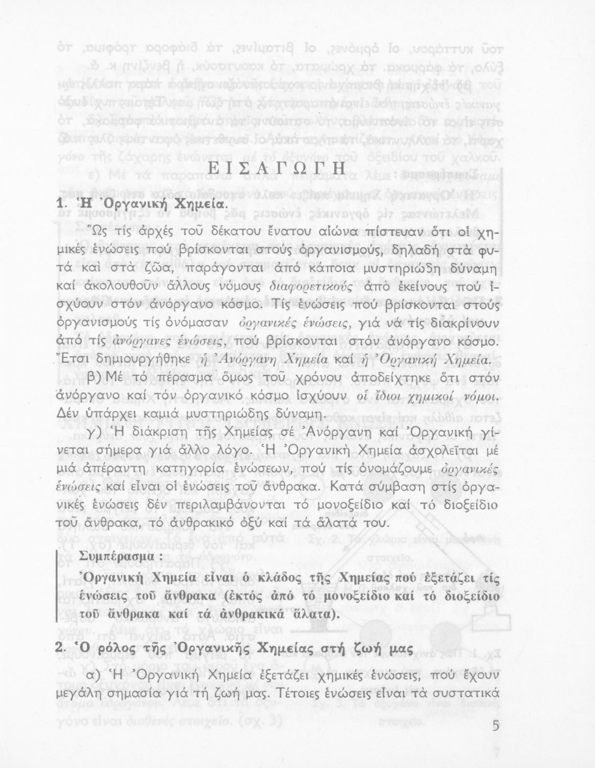 Σχολικό εγχειρίδιο Χημείας Γ΄ Γυμνασίου που περιέχει εισαγωγή στην οργανική χημεία και εστιάζει στους υδρογονάνθρακες, τα σάκχαρα και τα λιπαρά σώματα. Φέρει το σύμβολο της δικτατορίας.