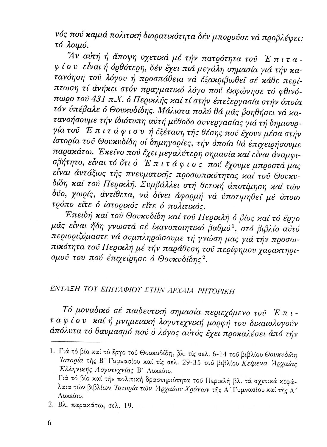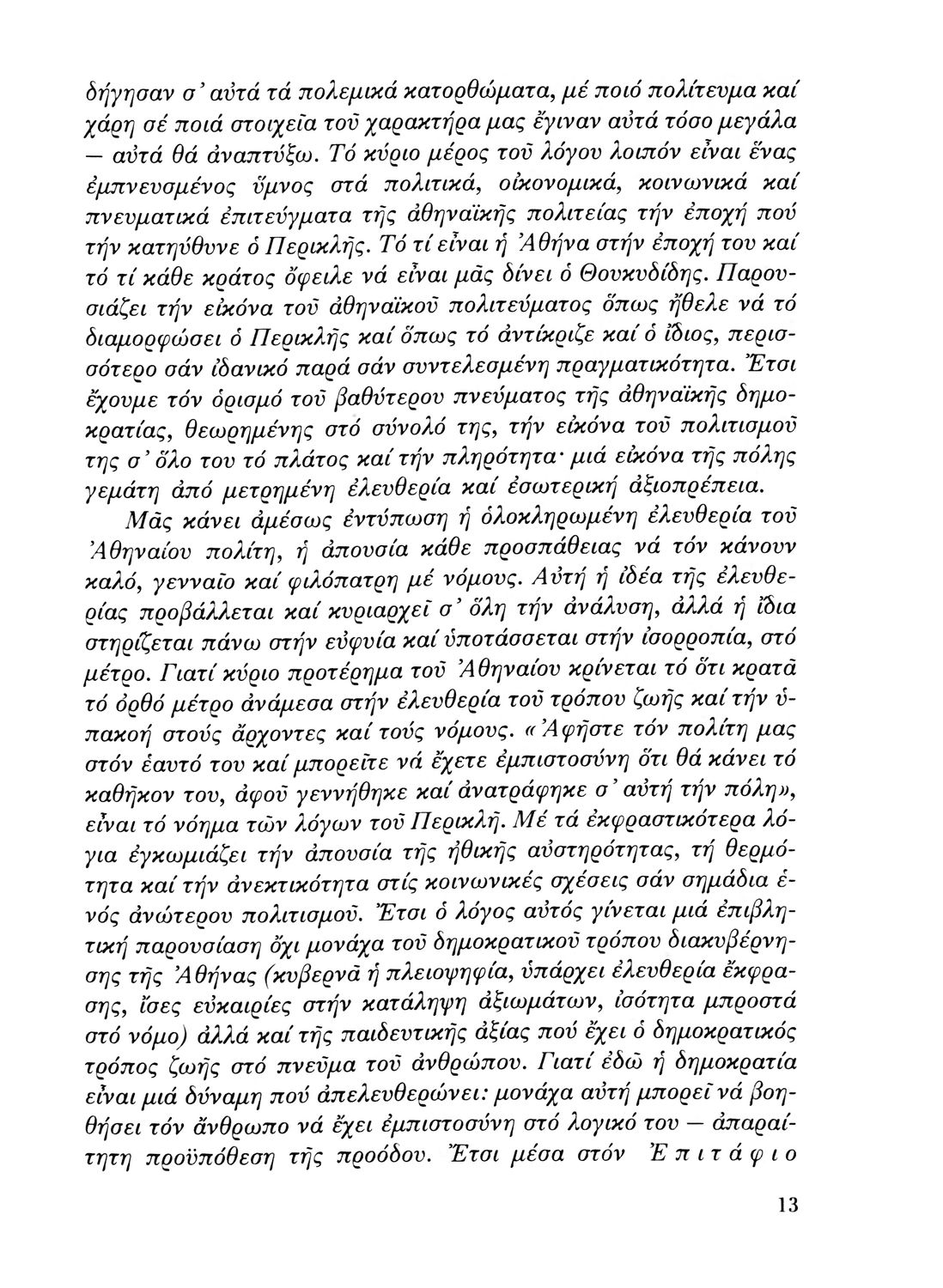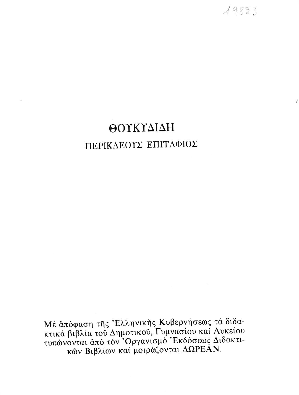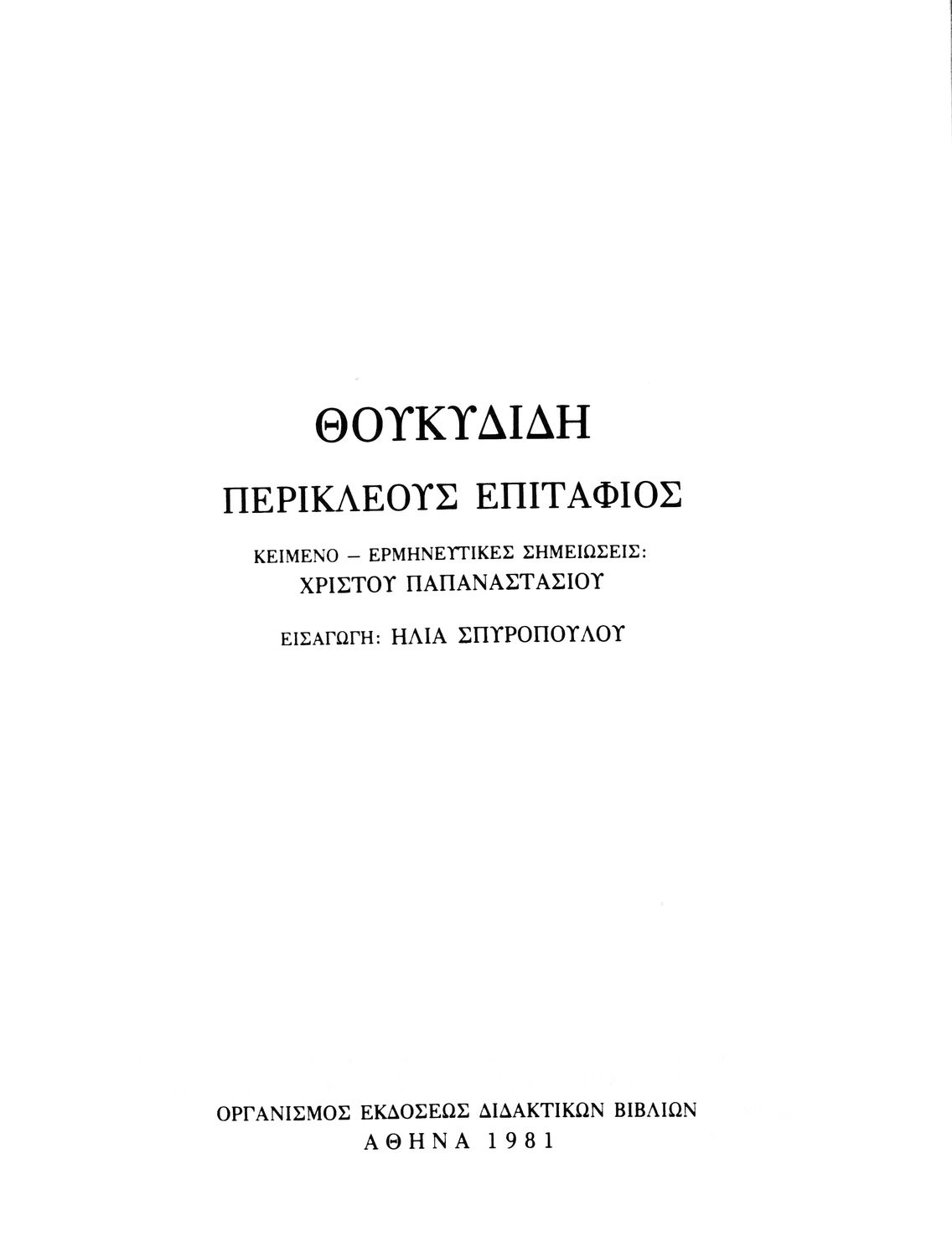 Βαθμίδα εκπαίδευσης: Δευτεροβάθμια Τάξη: Γ' Λυκείου Μάθημα: Αρχαία Ελληνικά Γλώσσα: Δημοτική Παρουσίαση περιεχομένου: Σχολικό εγχειρίδιο Αρχαίων Ελληνικών Γ΄ Λυκείου που περιλαμβάνει τον Επιτάφιο του Περικλή, εισαγωγή στη ζωή και το έργο του Θουκυδίδη και ερμηνευτικές σημειώσεις. |