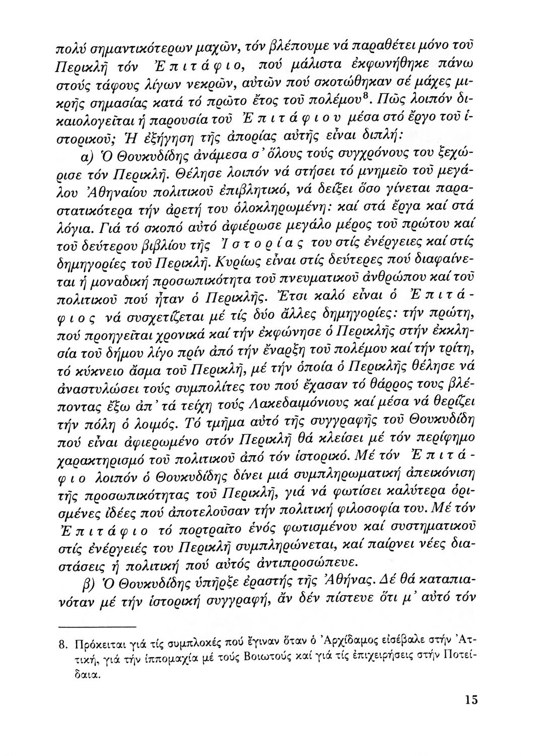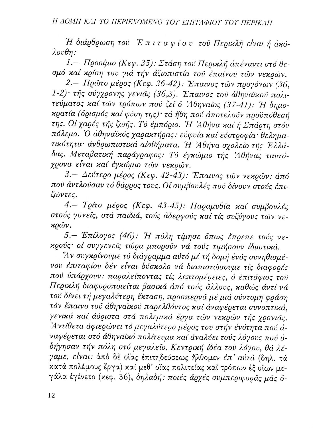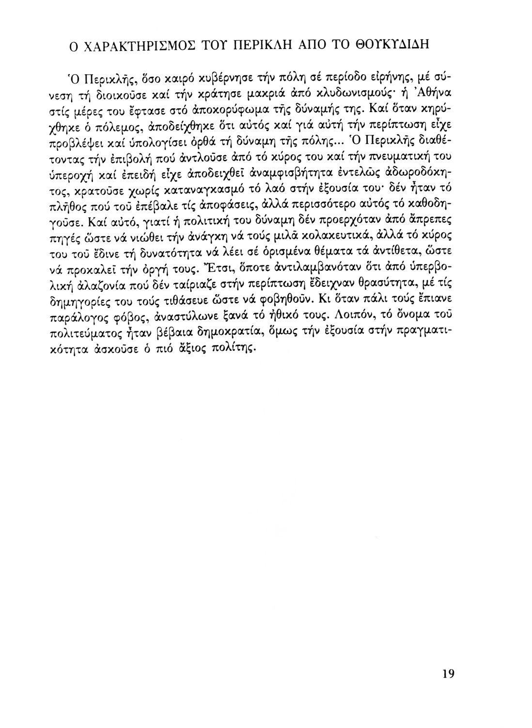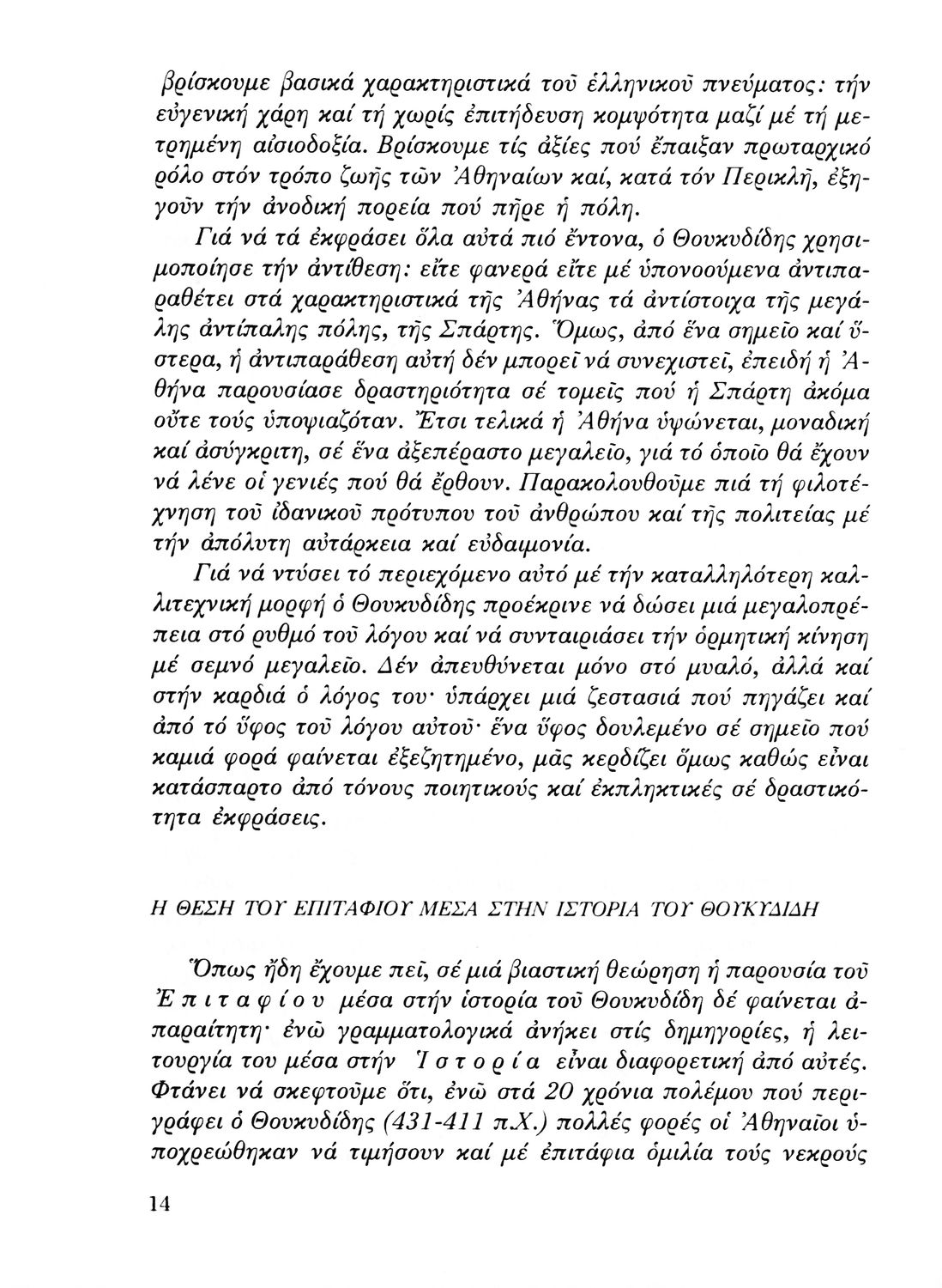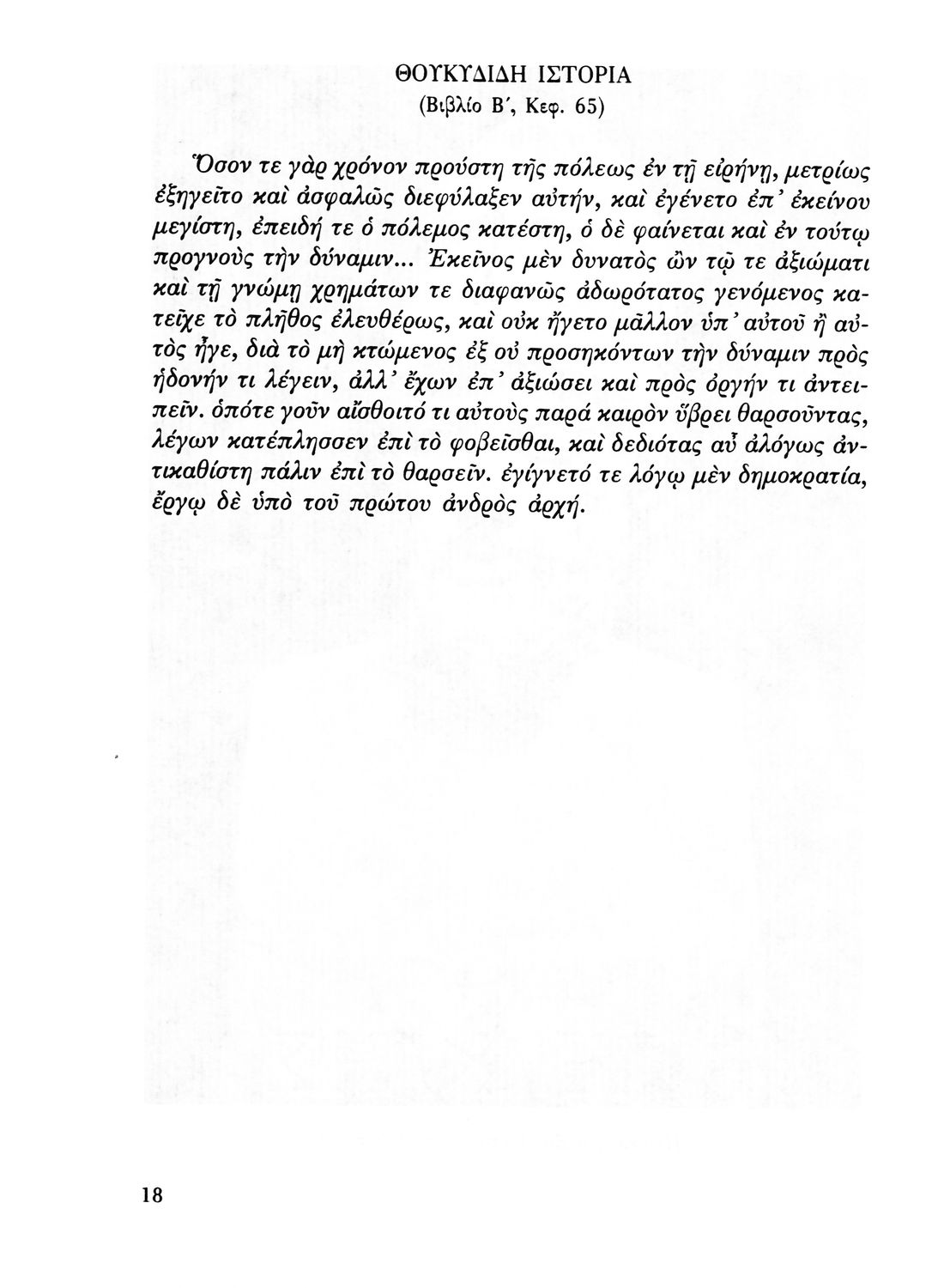 Βαθμίδα εκπαίδευσης: Δευτεροβάθμια Τάξη: Γ' Λυκείου Μάθημα: Αρχαία Ελληνικά Γλώσσα: Δημοτική Παρουσίαση περιεχομένου: Σχολικό εγχειρίδιο Αρχαίων Ελληνικών Γ΄ Λυκείου που περιλαμβάνει τον Επιτάφιο του Περικλή, εισαγωγή στη ζωή και το έργο του Θουκυδίδη και ερμηνευτικές σημειώσεις. |