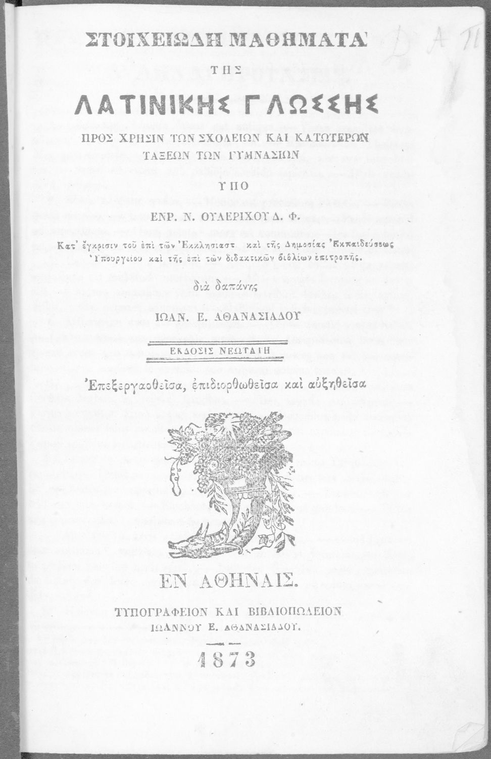 Εκδότης: Ιωάννης Ε. Αθανασιάδης Έτος έκδοσης: 1873 Τόπος έκδοσης: Αθήνα |