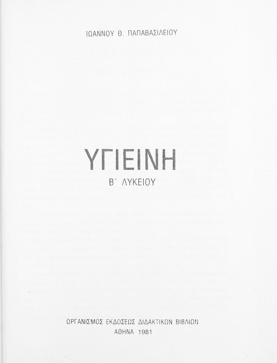 Σχολικό εγχειρίδιο Υγιεινής για τη Β΄ Λυκείου που εστιάζει περιβαντολλογική διάσταση της υγιεινής, τα λοιμώδη νοσήματα, και την κοινωνική υγιεινή.
