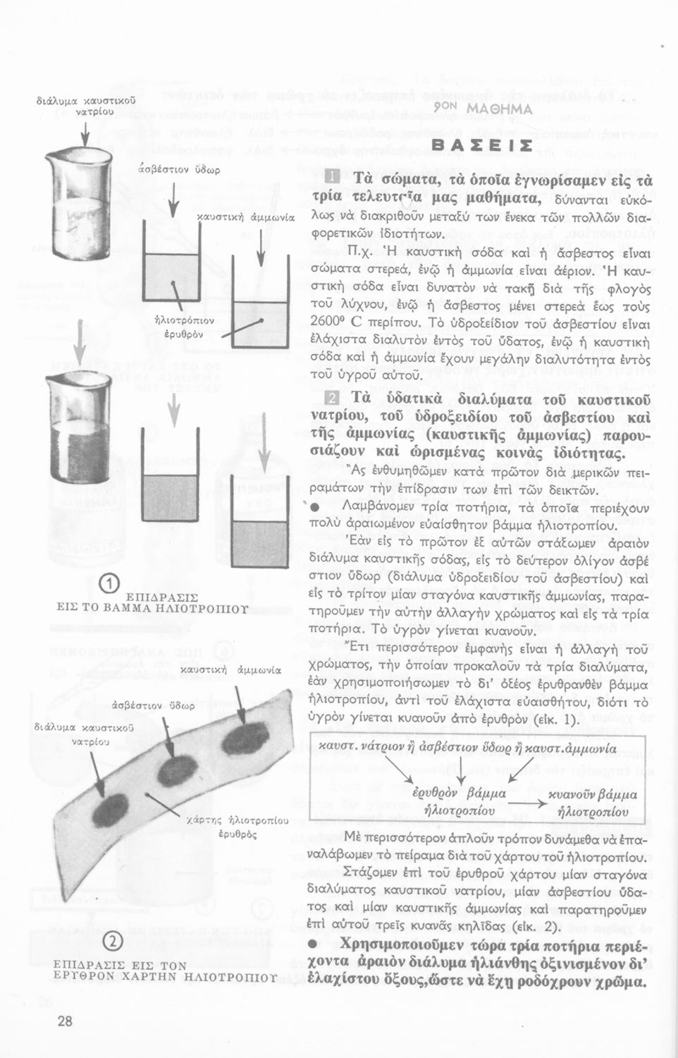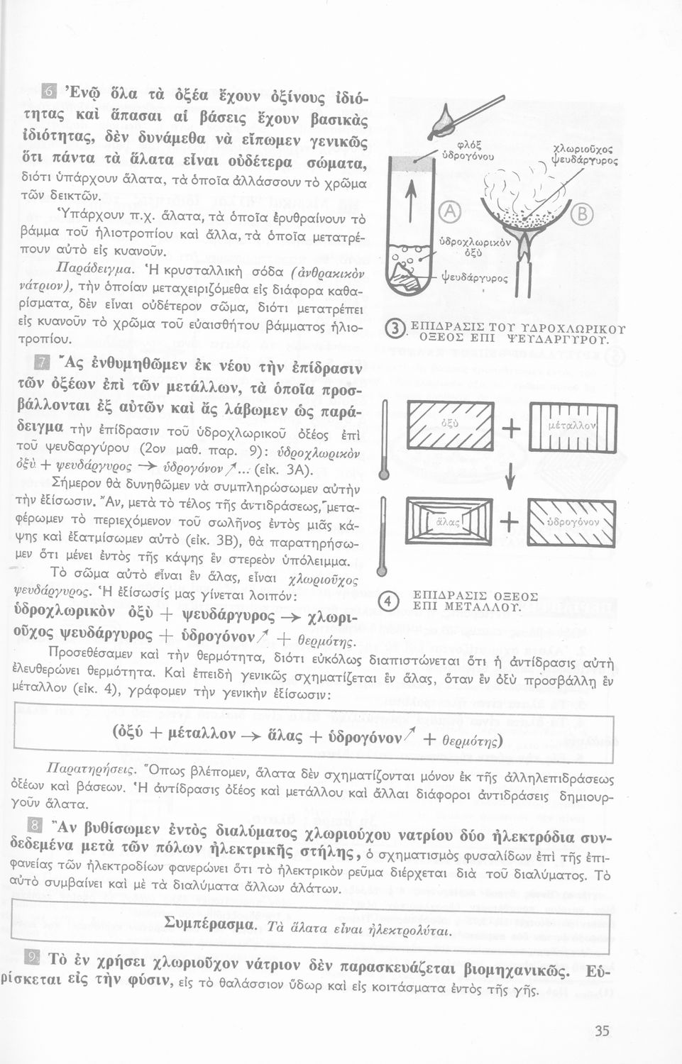 Παρουσίαση περιεχομένου: Σχολικό εγχειρίδιο Χημείας Β' Γυμνασίου που αναλύει τα χαρακτηριστικά και τις ιδιότητες των οξέων, βάσεων, αλάτων και περιέχει χημικές εξισώσεις, ασκήσεις και θεωρία.