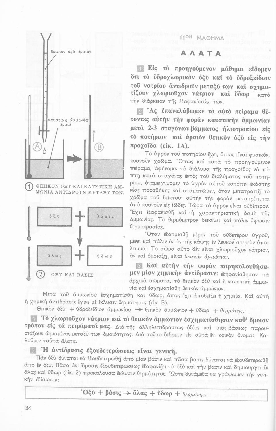 Σχολικό εγχειρίδιο Χημείας Β' Γυμνασίου που αναλύει τα χαρακτηριστικά και τις ιδιότητες των οξέων, βάσεων, αλάτων και περιέχει χημικές εξισώσεις, ασκήσεις και θεωρία.