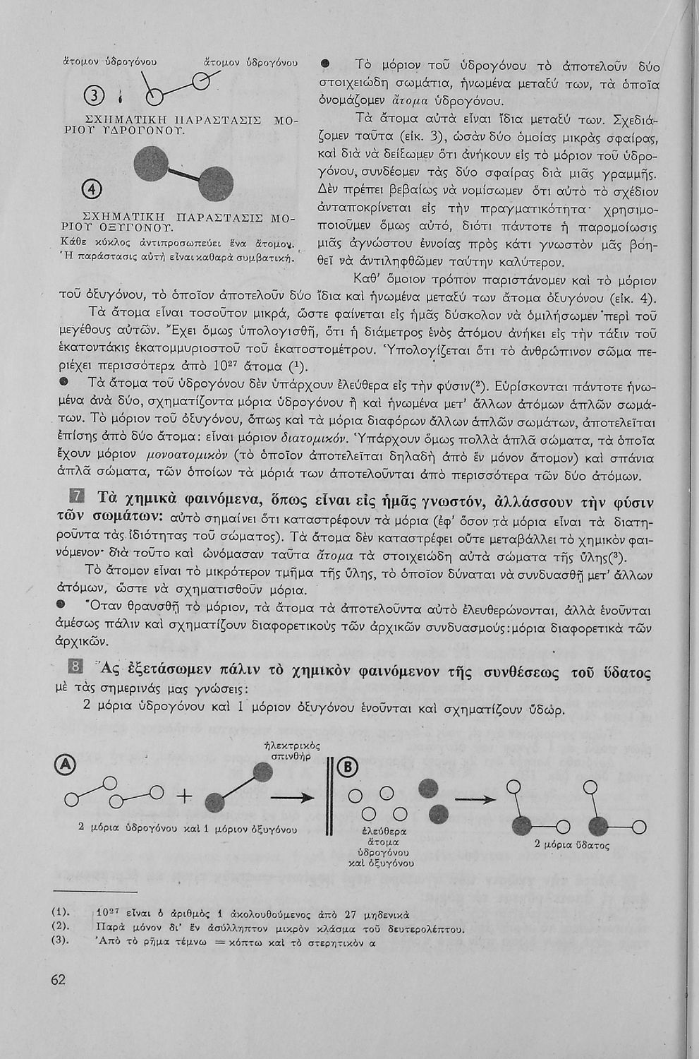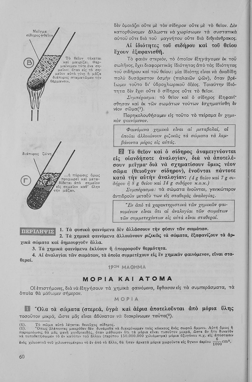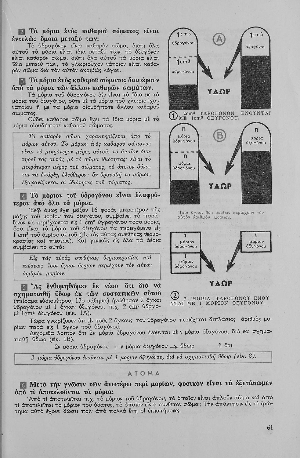 Σχολικό εγχειρίδιο Χημείας Β΄ Γυμνασίου που περιγράφει τη δομή των μορίων και των ατόμων, τις χημικές ενώσεις και εξισώσεις, και τις ομάδες του περιοδικού συστήματος. Περιέχει και στοιχεία ορυκτολογίας.