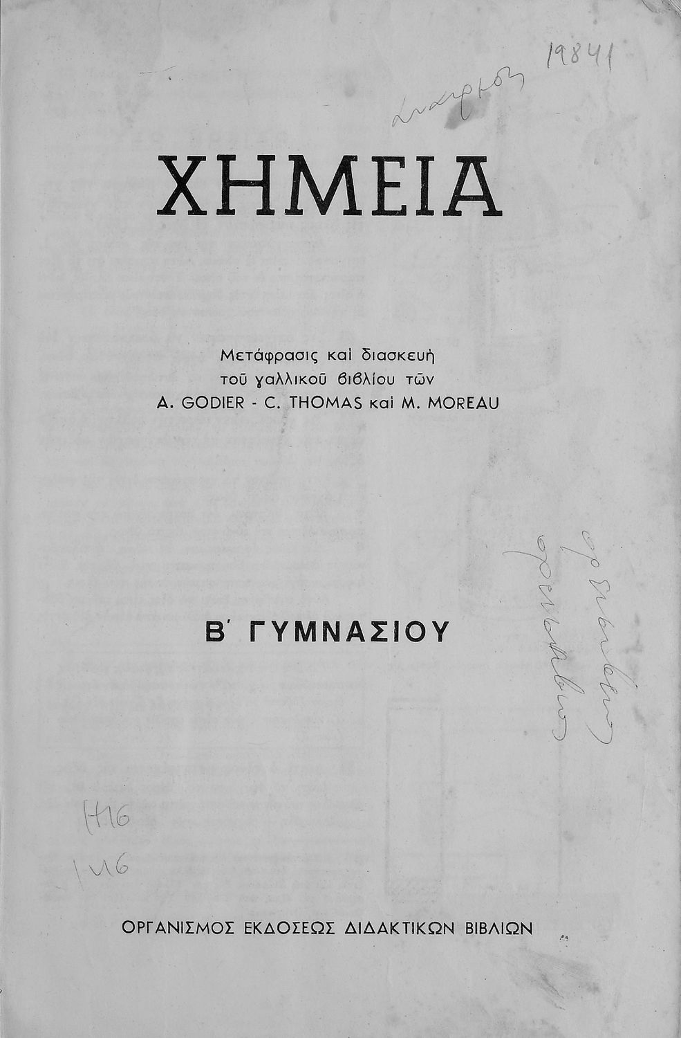 Κωδικός αναγνώρισης: 01-19841 Τίτλος: Χημεία Β΄ Γυμνασίου Συγγραφέας: A. Godier, C. Thomas, M. Moreau Εικονογράφος: Λουΐζα Μοντεσάντου Μέγεθος και υπόστρωμα: Σχολικό εγχειρίδιο, μαλακό εξώφυλλο, 111 σελίδες. Σχέδια και σχήματα (έγχρωμα). |