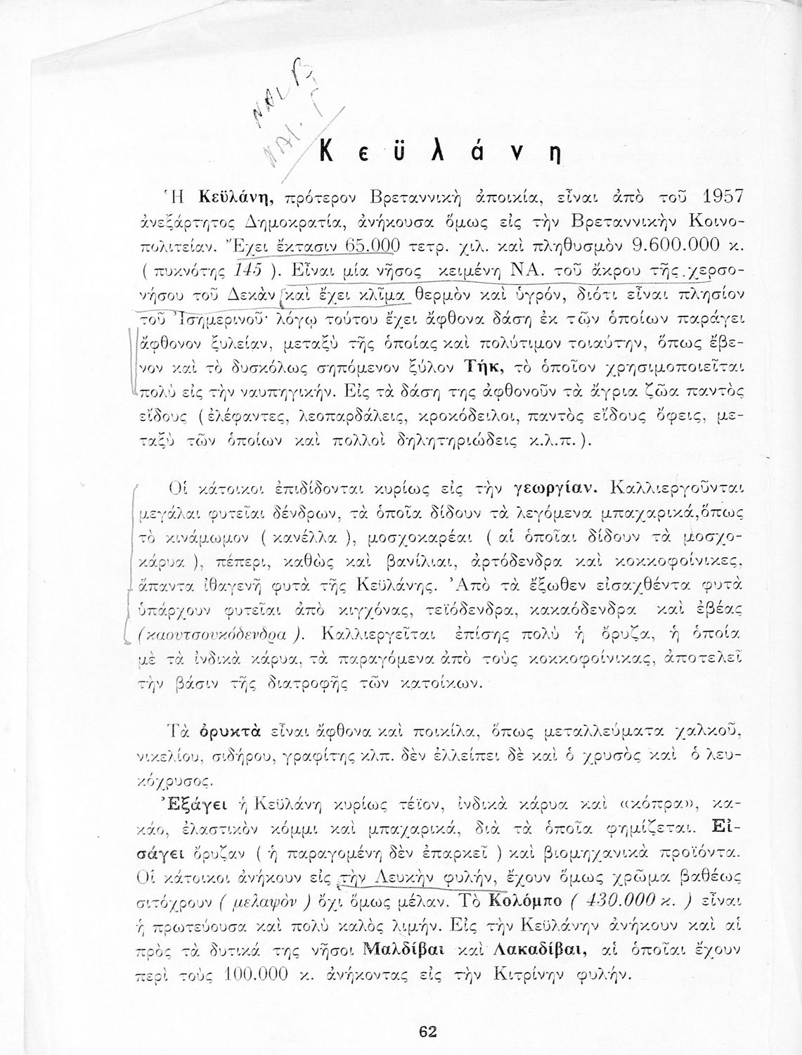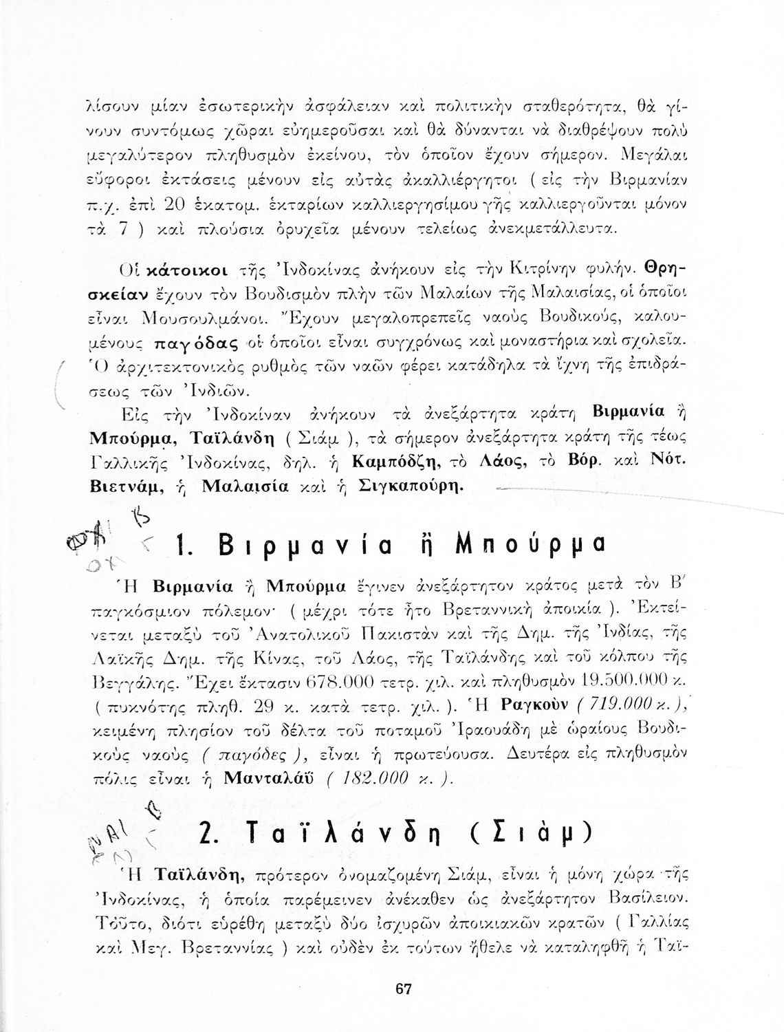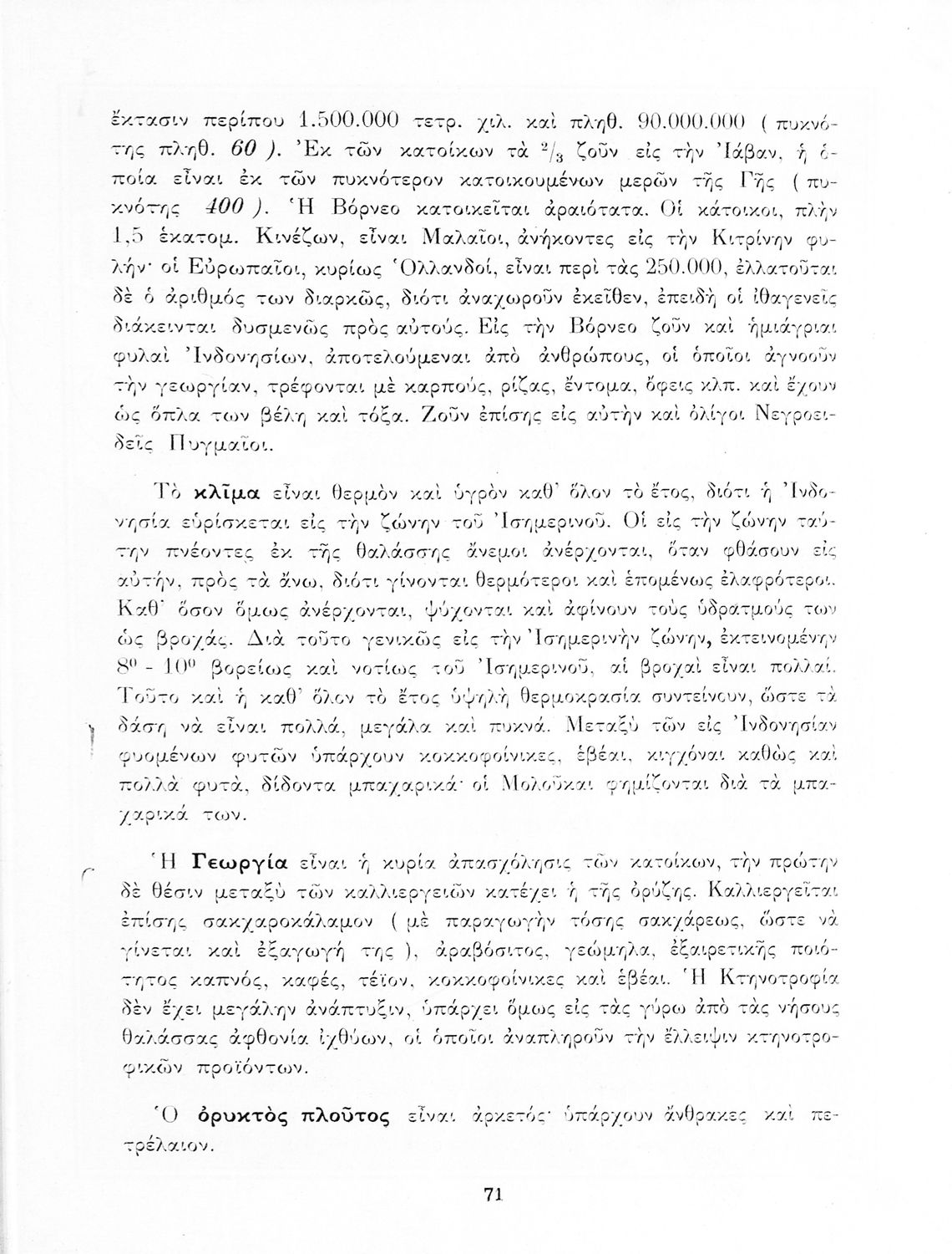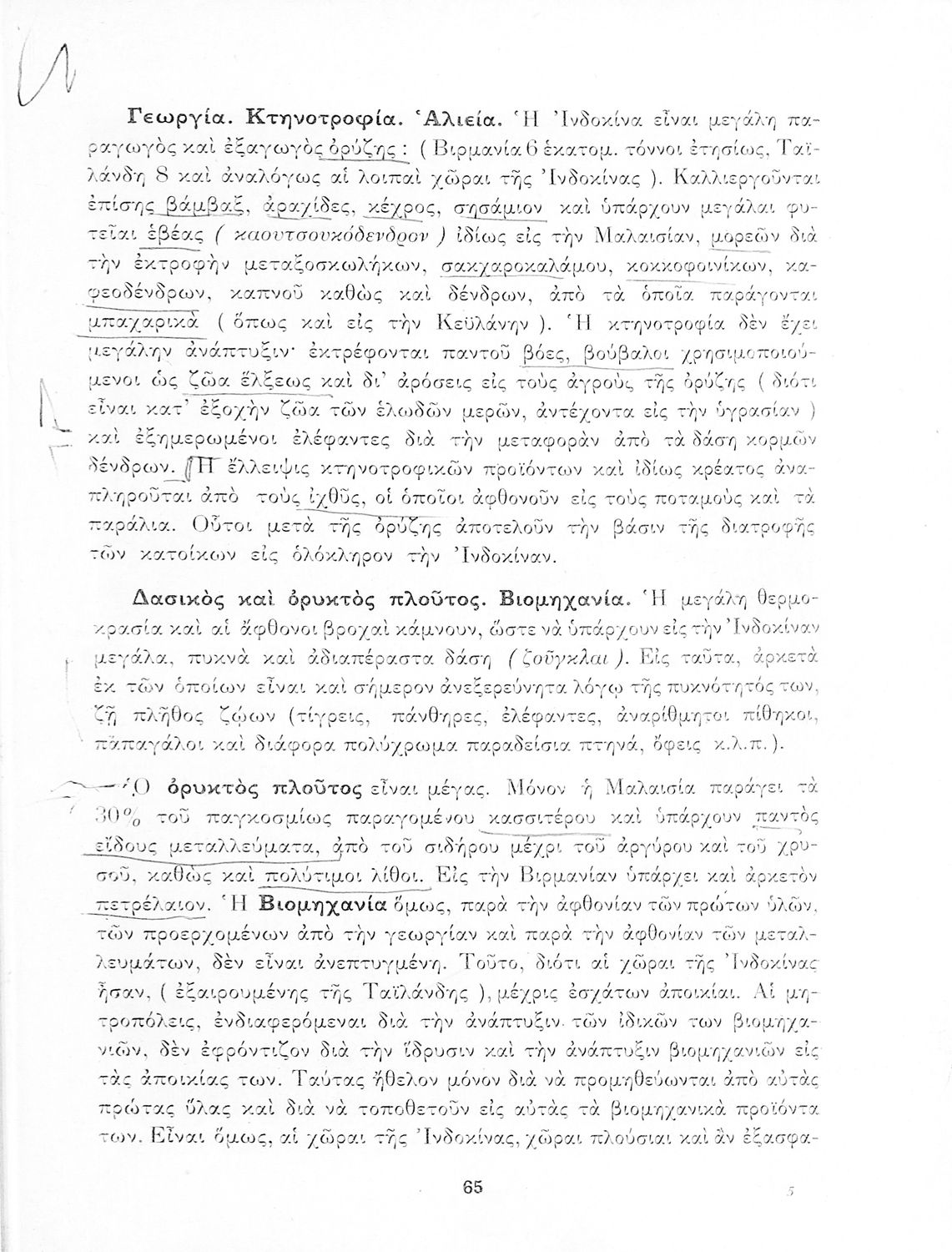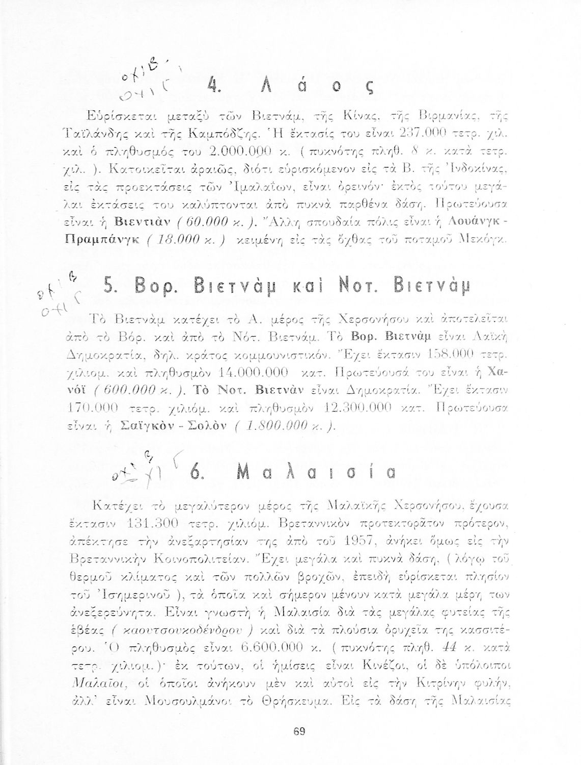 Σχολικό εγχειρίδιο Γεωγραφίας που εξετάζει ενδεικτικές χώρες και περιοχές από τις πέντε ηπείρους εκτός της Ευρώπης από γεωφυσική και οικονομική πλευρά. Φέρει το σύμβολο της δικτατορίας.