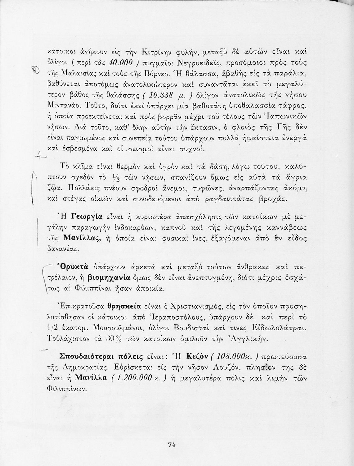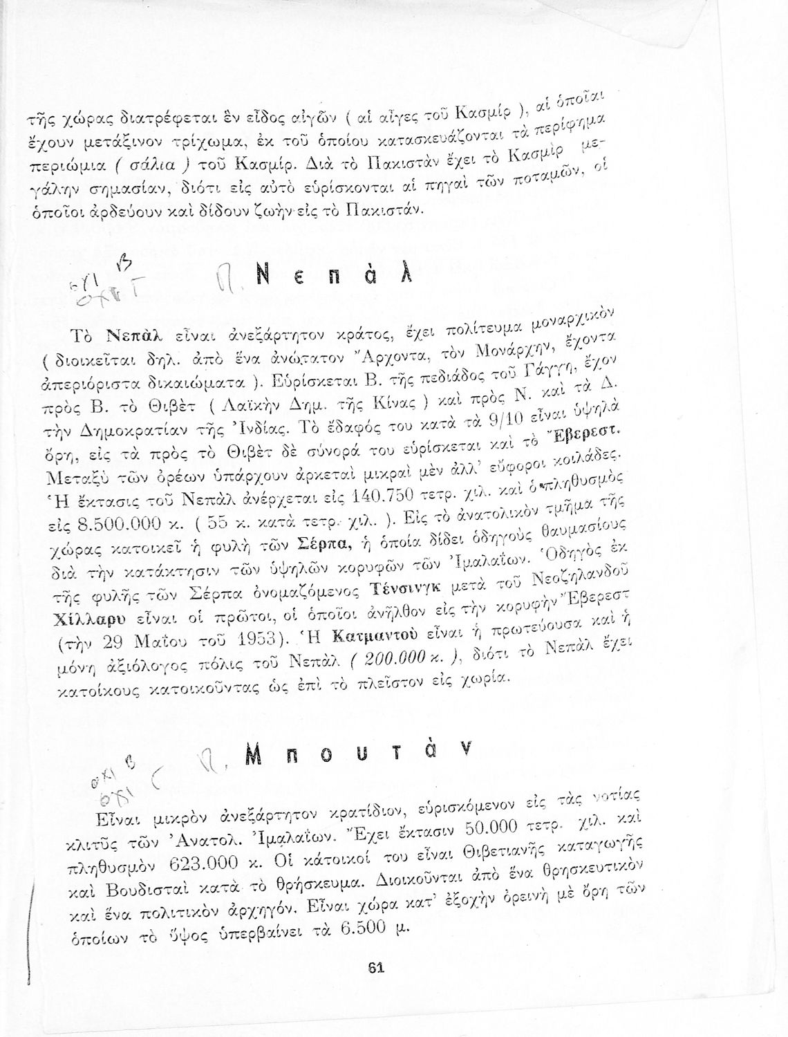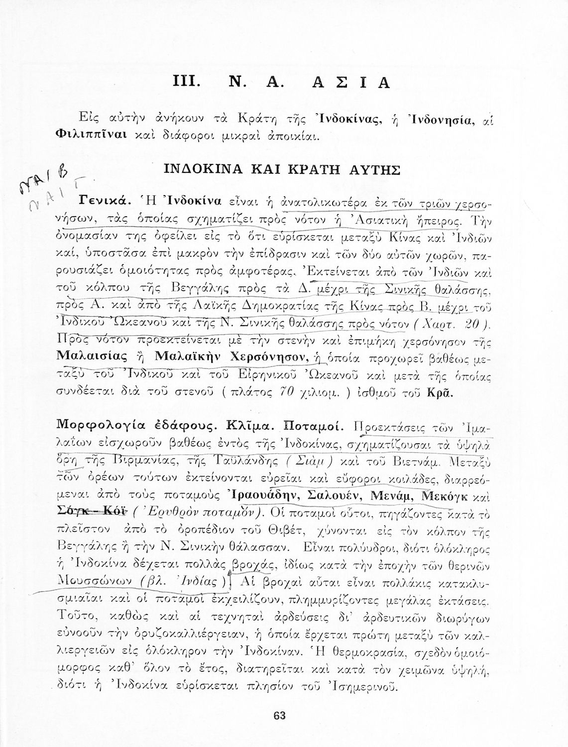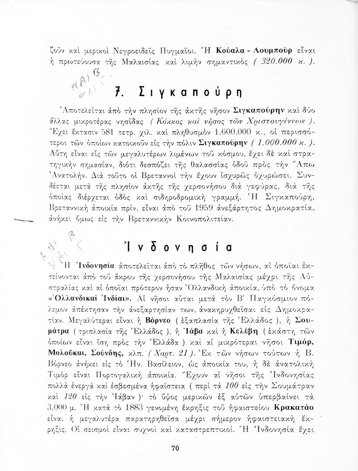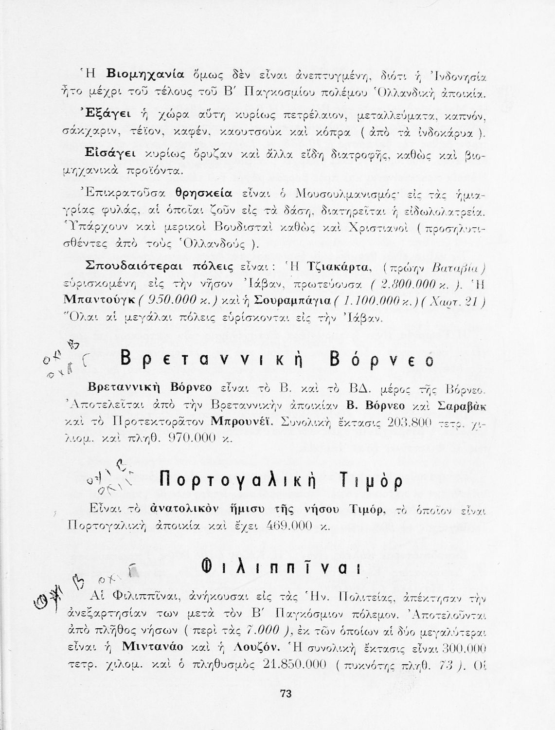 Σχολικό εγχειρίδιο Γεωγραφίας που εξετάζει ενδεικτικές χώρες και περιοχές από τις πέντε ηπείρους εκτός της Ευρώπης από γεωφυσική και οικονομική πλευρά. Φέρει το σύμβολο της δικτατορίας.
