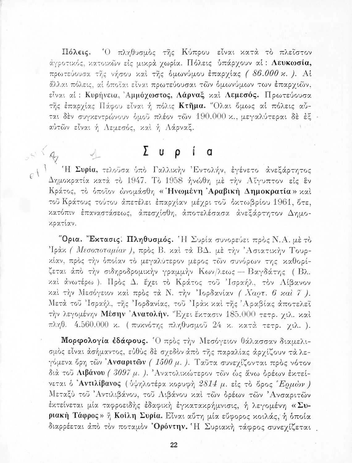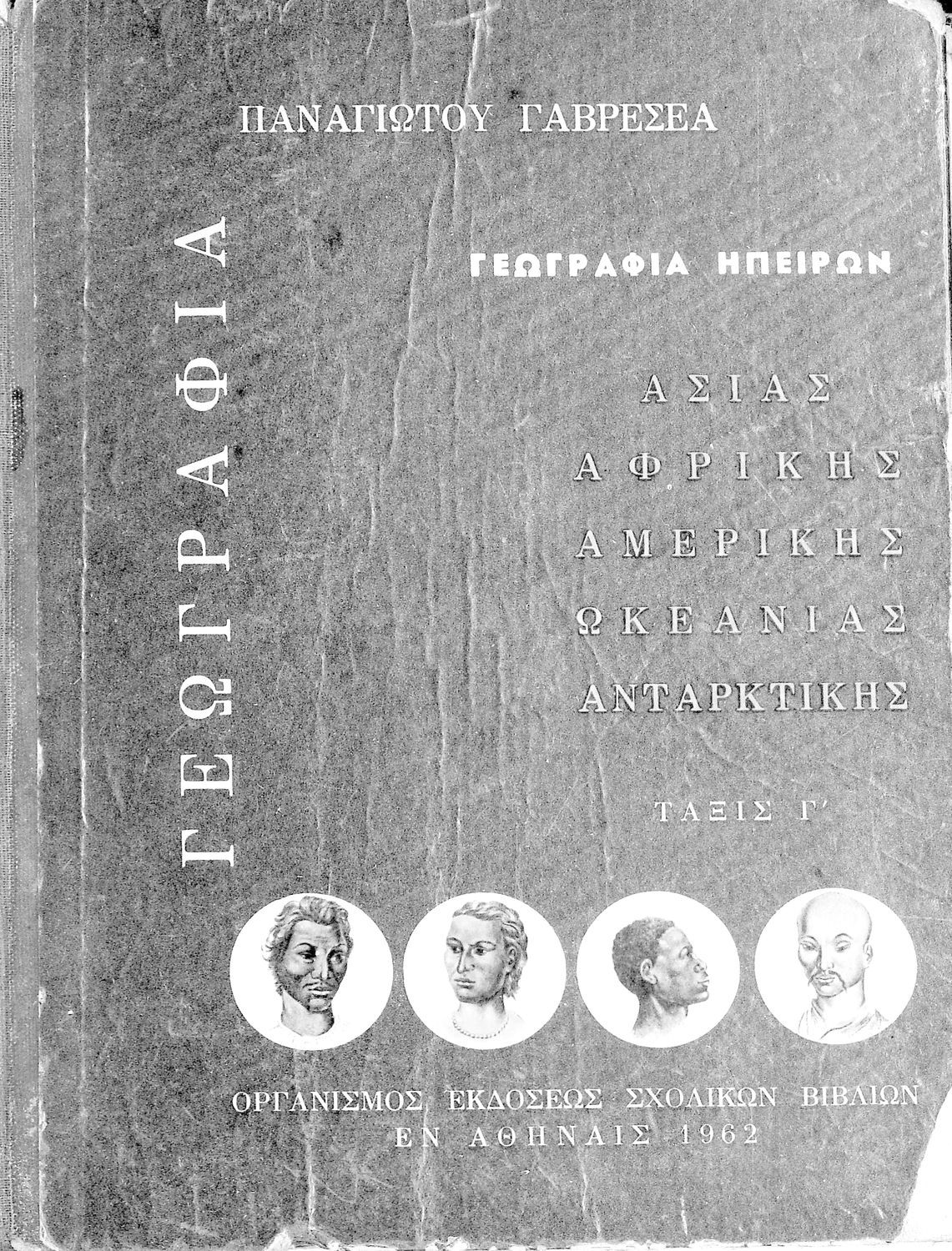 Σχολικό εγχειρίδιο Γεωγραφίας που εξετάζει ενδεικτικές χώρες και περιοχές από τις πέντε ηπείρους εκτός της Ευρώπης από γεωφυσική και οικονομική πλευρά. Φέρει το σύμβολο της δικτατορίας.