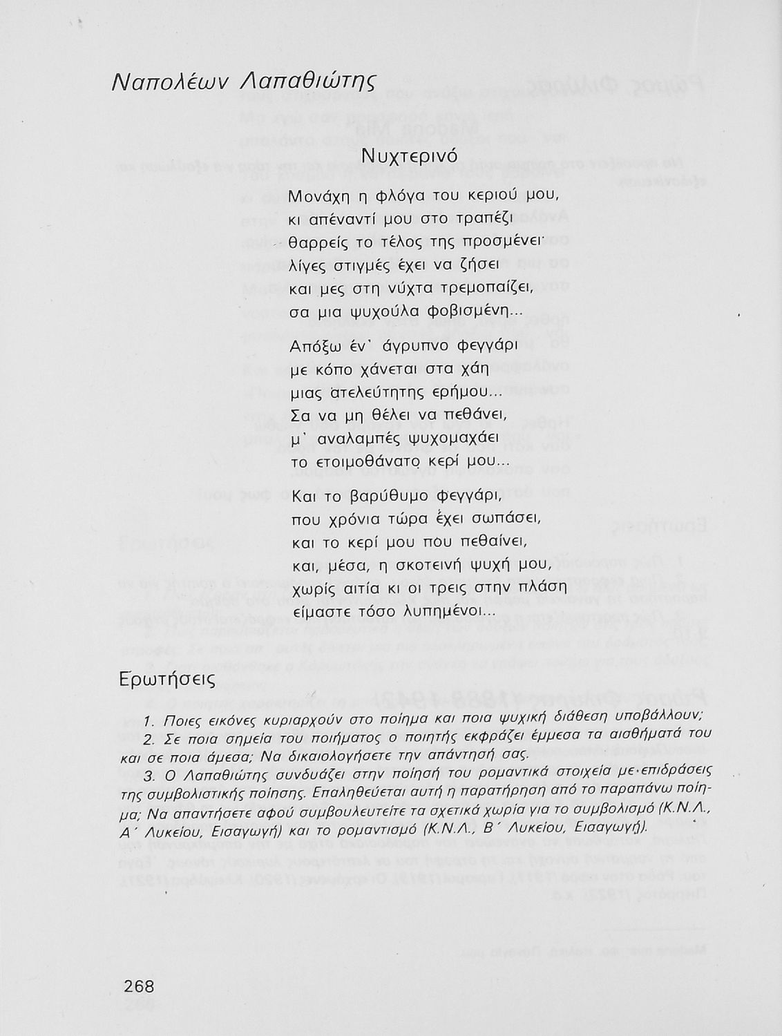 Σχολικό εγχειρίδιο Νέων Ελληνικών Β΄ Λυκείου που περιλαμβάνει πεζά και ποιήματα Ελλήνων συγγραφέων της επτανησιακής και ρομαντικής σχολής, και της νεότερης και μεταπολεμικής λογοτεχνίας και δοκίμια. Περιέχει και έργα κλασσικών ευρωπαίων συγγραφέων και εισαγωγικά σημειώματα.