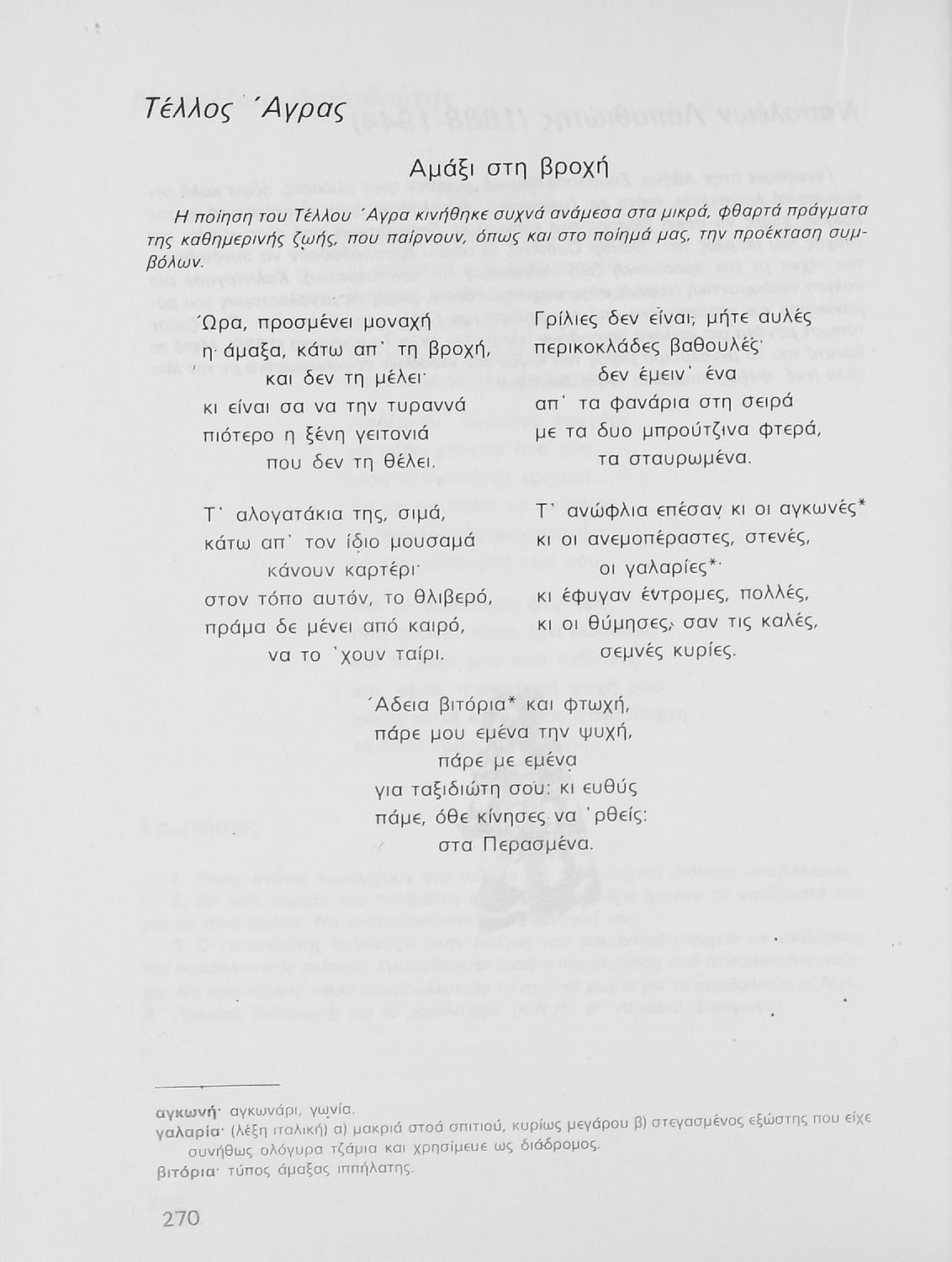 Σχολικό εγχειρίδιο Νέων Ελληνικών Α΄ Λυκείου που περιλαμβάνει πεζά, ποιήματα, δοκίμια και θεατρικά έργα σύγχρονων Ελλήνων και κλασσικών ξένων συγγραφέων, ερωτήσεις και βιογραφικά σημειώματα