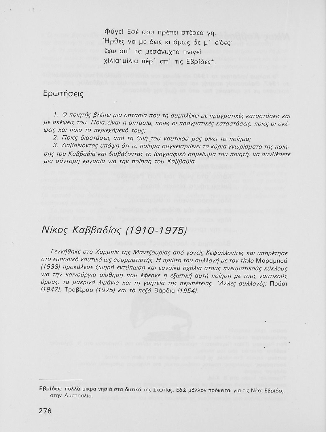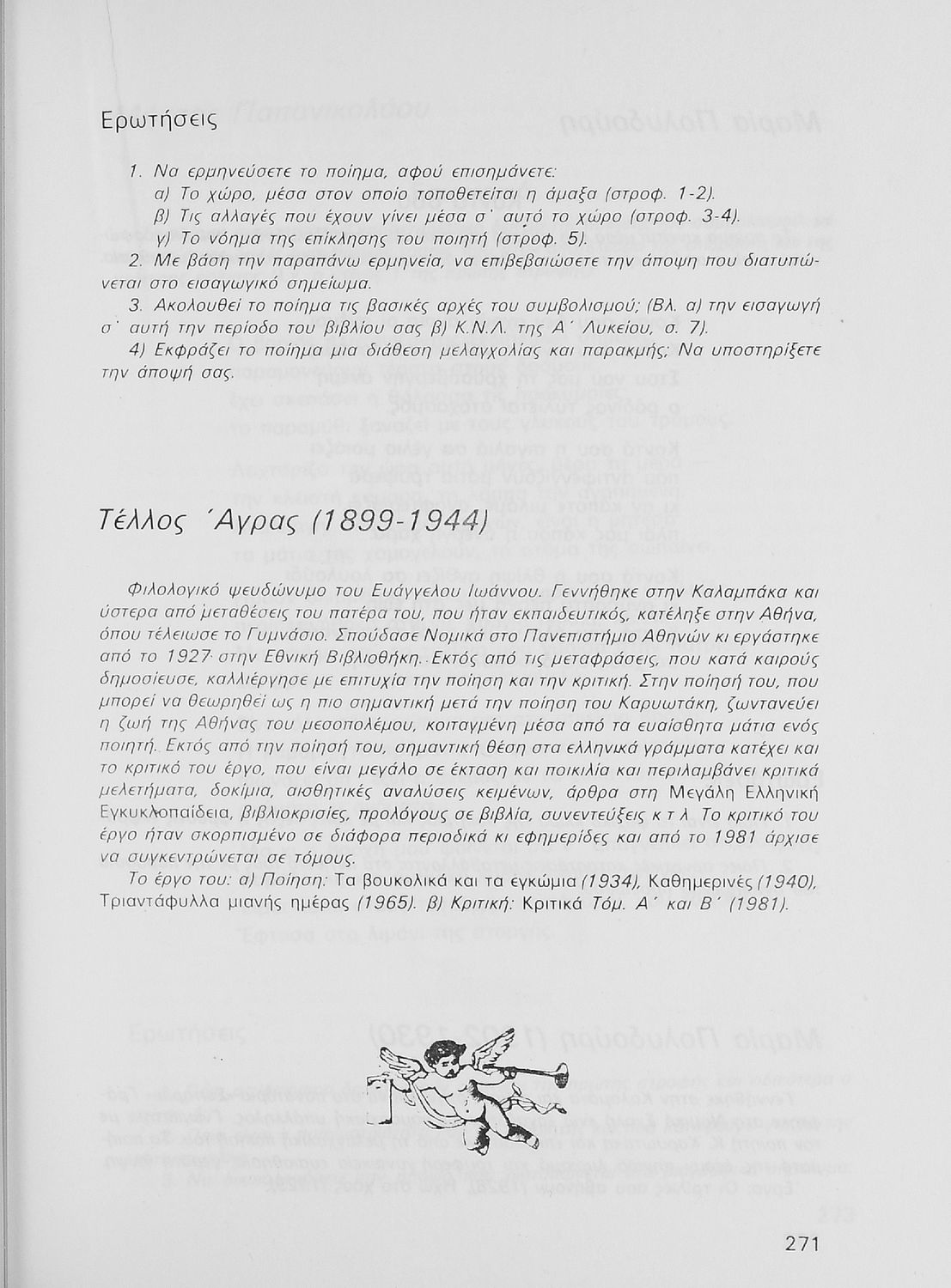 Σχολικό εγχειρίδιο Νέων Ελληνικών Α΄ Γυμνασίου που περιλαμβάνει δοκίμια, πεζά και ποιήματα Ελλήνων συγγραφέων και δημοτικά τραγούδια εμπνευσμένα από τη θρησκευτική, εθνική και κοινωνική ζωή, τη "δοκιμασία της ...