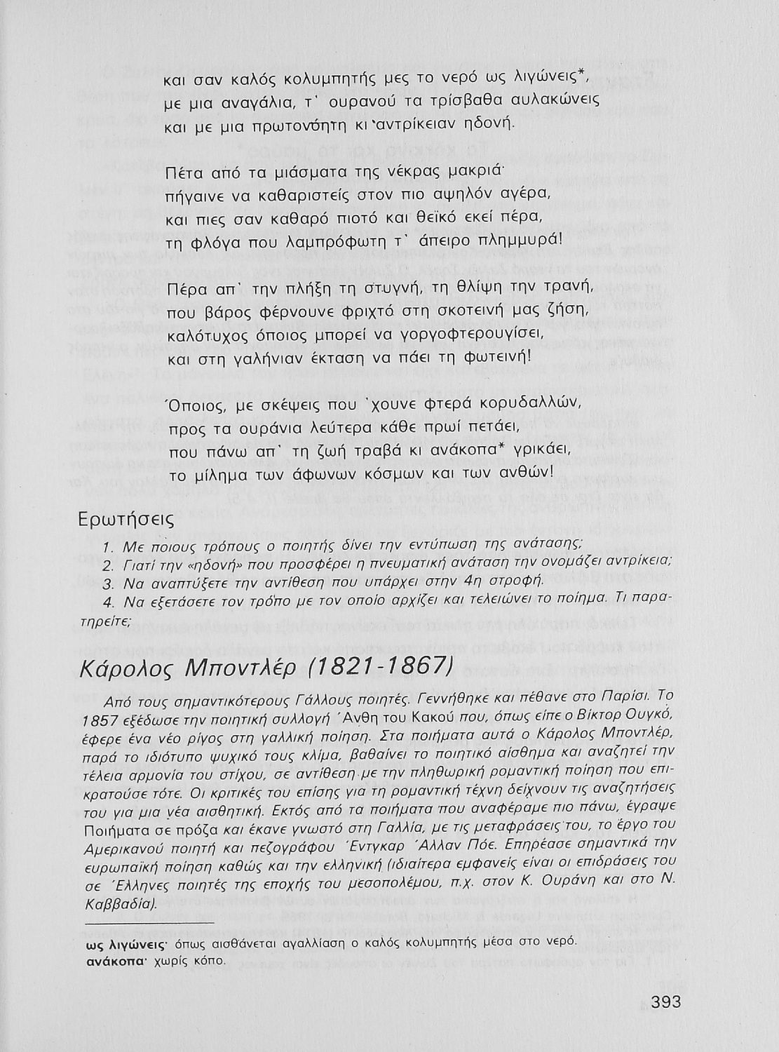 Σχολικό εγχειρίδιο Νέων Ελληνικών Β΄ Λυκείου που περιλαμβάνει πεζά και ποιήματα Ελλήνων συγγραφέων της επτανησιακής και ρομαντικής σχολής, και της νεότερης και μεταπολεμικής λογοτεχνίας και δοκίμια. Περιέχει και έργα κλασσικών ευρωπαίων συγγραφέων και εισαγωγικά σημειώματα.