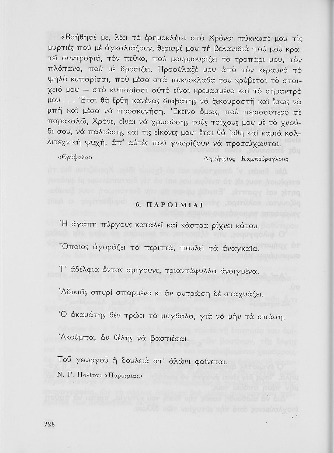 Σχολικό εγχειρίδιο Νέων Ελληνικών για τη ΣΤ΄ τάξη του Γυμνασίου με κείμενα και ποιήματα Ελλήνων και ξένων λογοτεχνών. Ο πεζός λόγος ανήκει στους ρητορικούς λόγους, στις διηγήσεις, στις περιγραφές και στα ευθυμογραφήματα. Η ποίηση περιλαμβάνει δημοτικά και έντεχνο ποιητικό λόγο ενώ υπάρχουν κείμενα από την ιταλική, γαλλική και αγγλική λογοτεχνία.