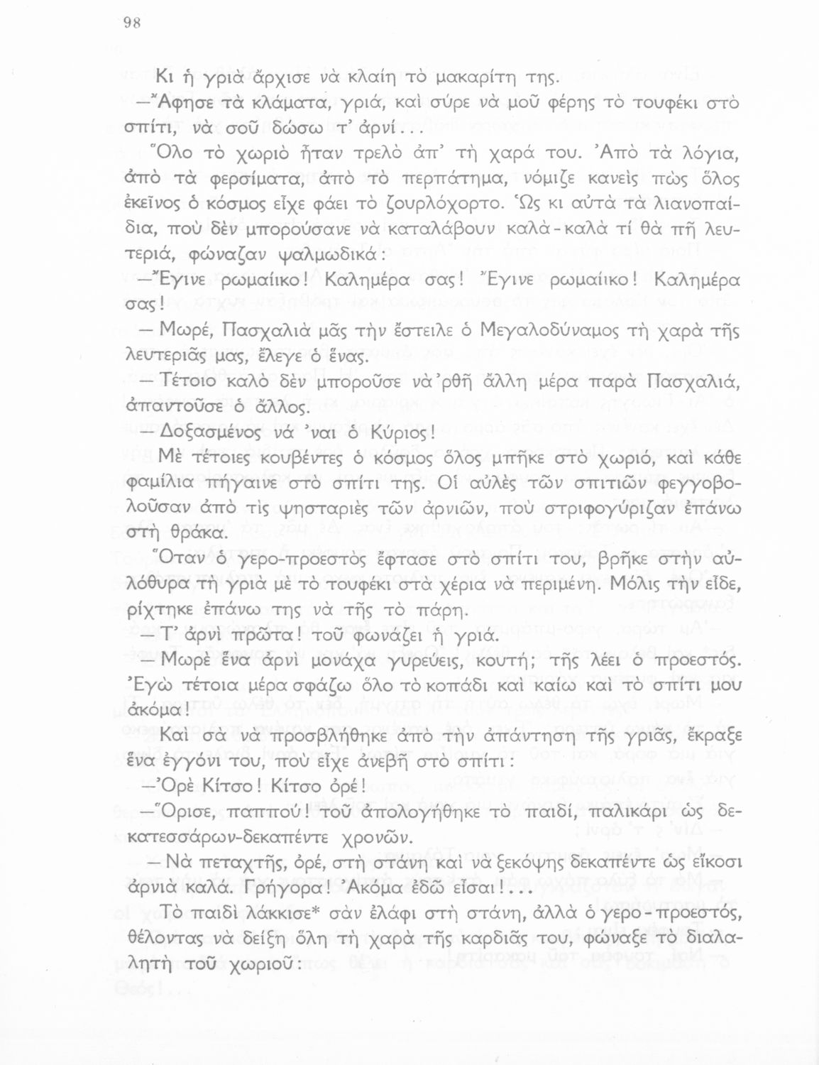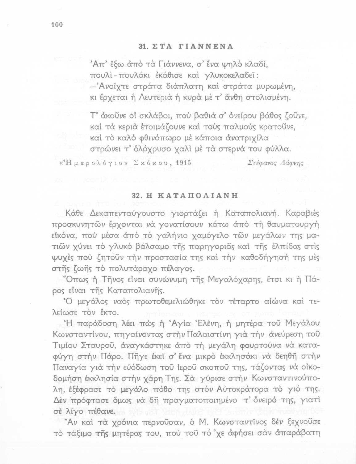 Σχολικό εγχειρίδιο Νέων Ελληνικών Δ΄ Γυμνασίου Θηλέων που περιλαμβάνει πεζά, ποιήματα και δημοτικά τραγούδια εμπνευσμένα από την σύγχρονη ελληνική ιστορία και την οικογενειακή και θρησκευτική ζωή. Περιέχει και