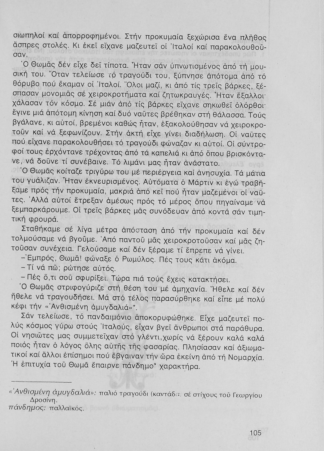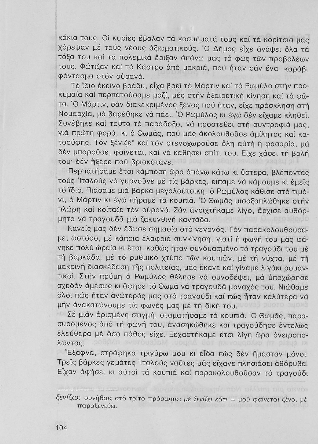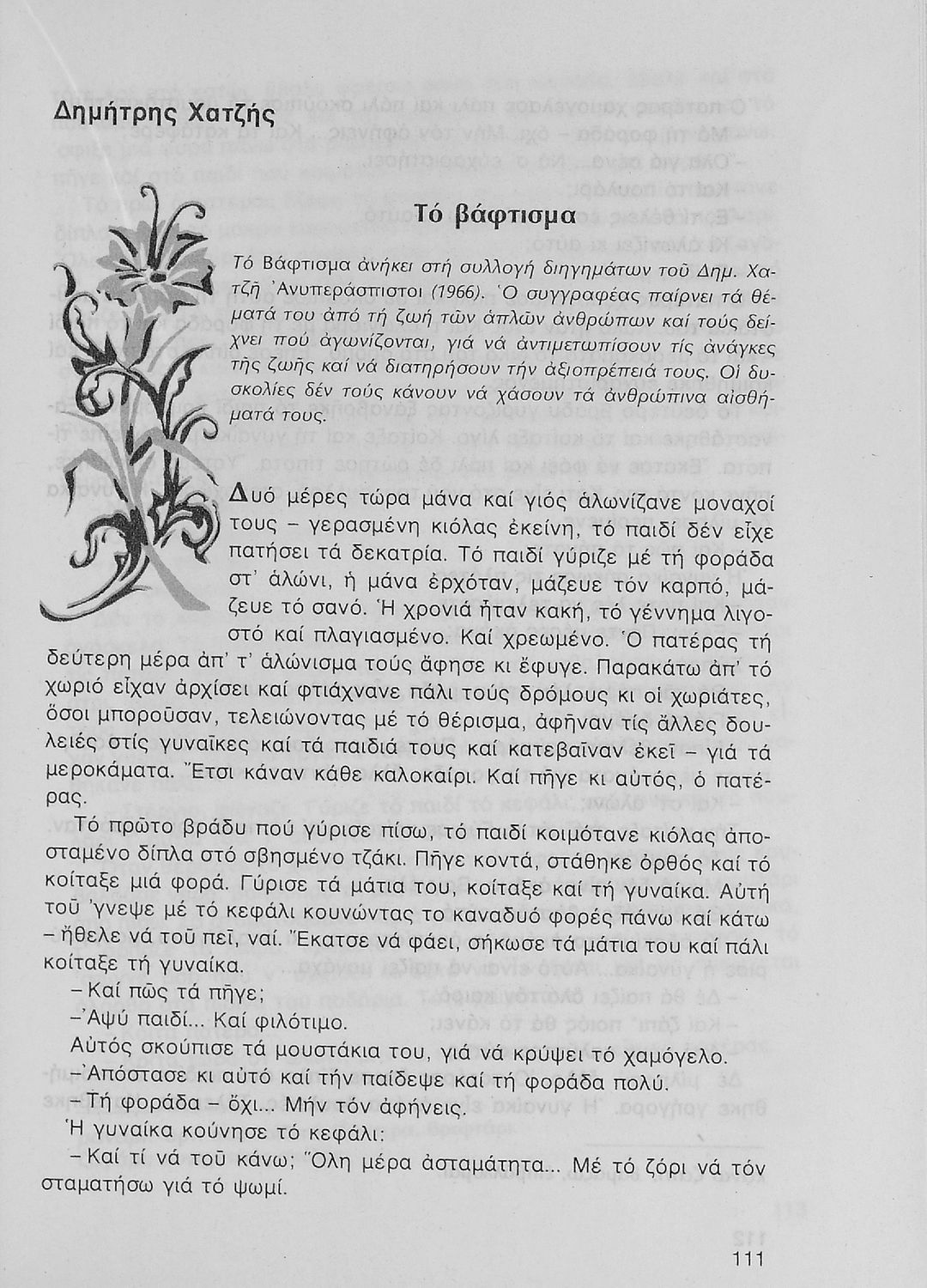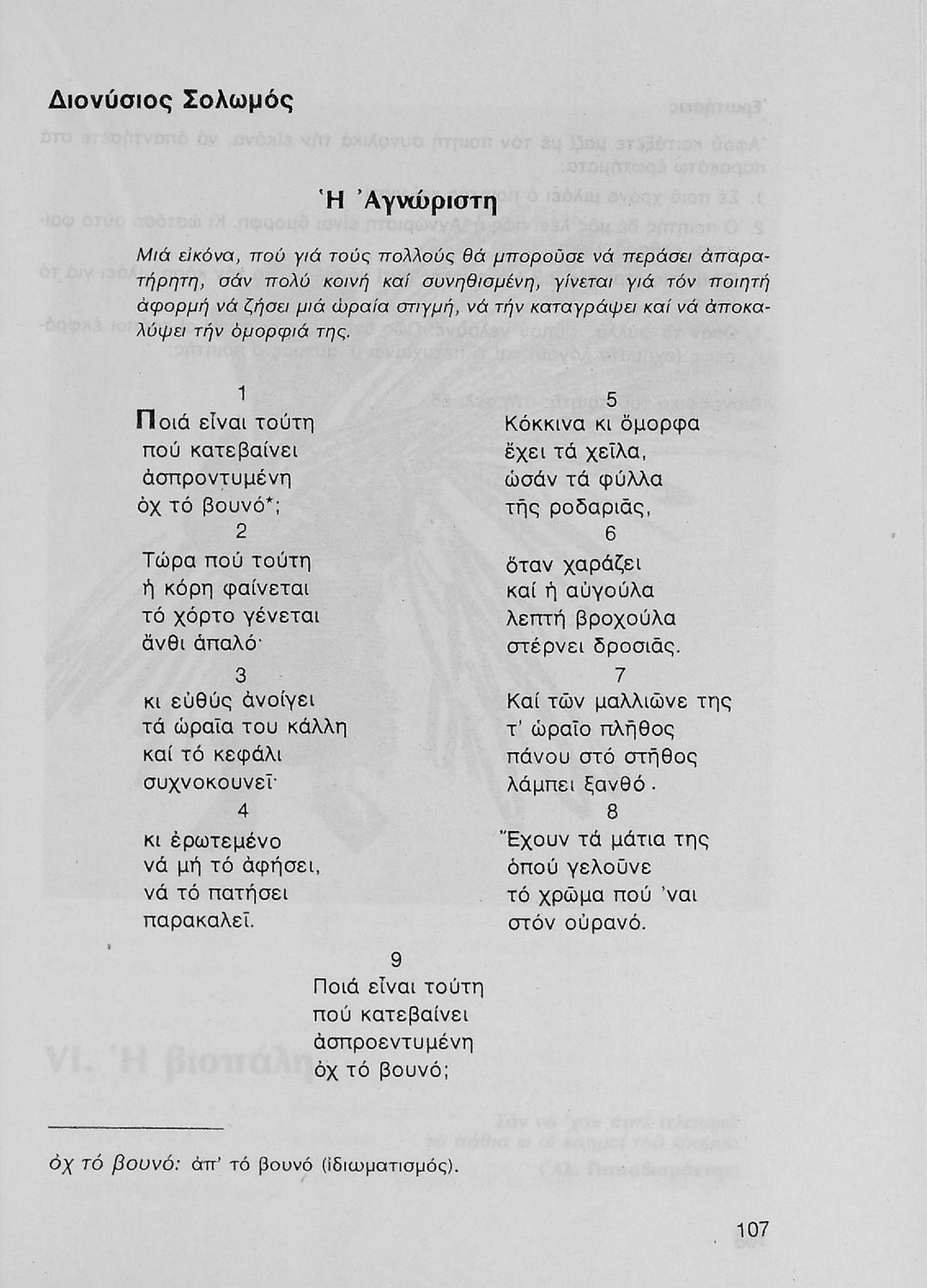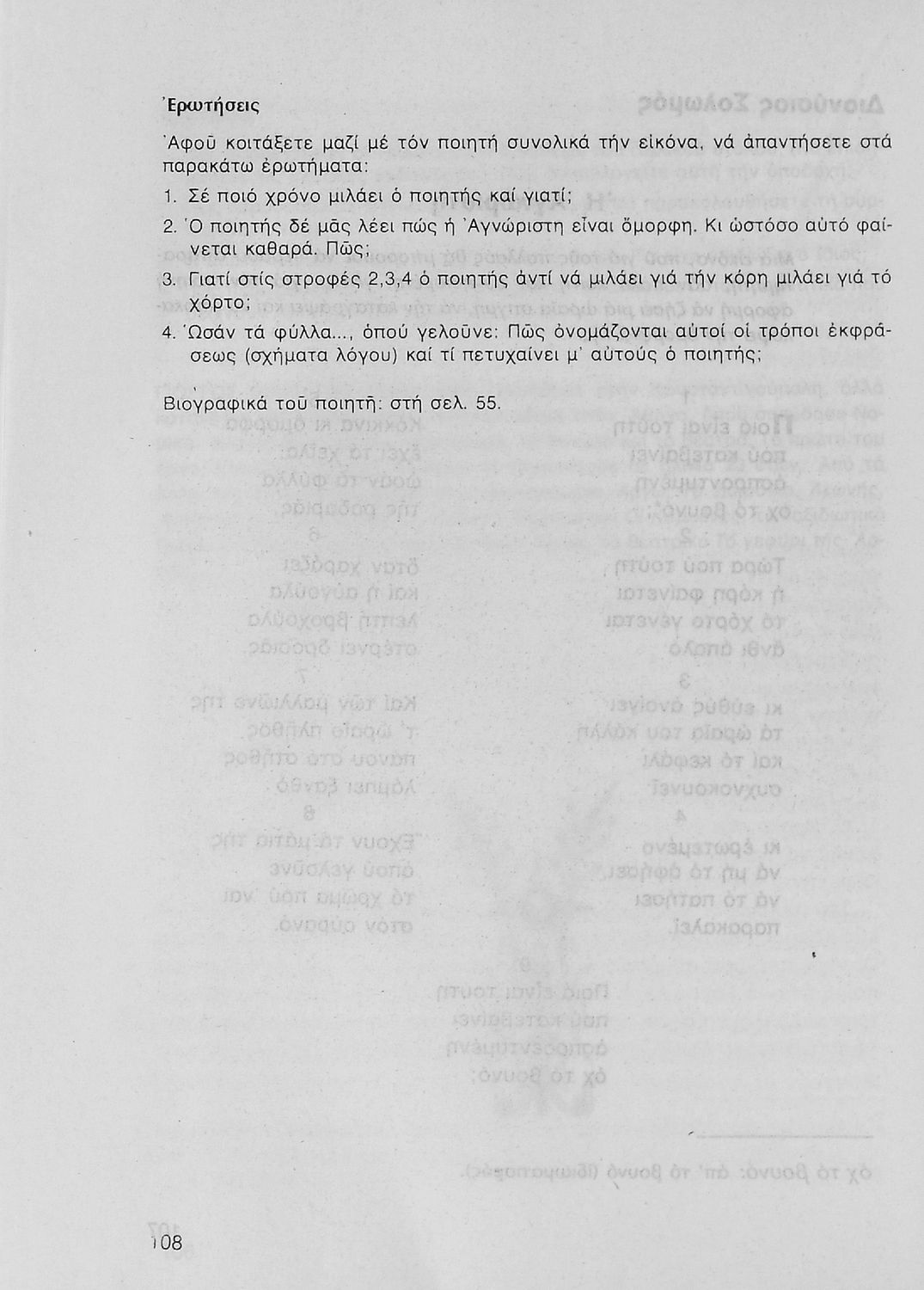 Σχολικό εγχειρίδιο Νέων Ελληνικών Α΄ Γυμνασίου που περιλαμβάνει δοκίμια, πεζά και ποιήματα Ελλήνων συγγραφέων και δημοτικά τραγούδια εμπνευσμένα από τη θρησκευτική, εθνική και κοινωνική ζωή, τη "δοκιμασία της Κύπρου", και την ελληνική φύση. Περιέχει και έργα ευρωπαίων συγγραφέων.