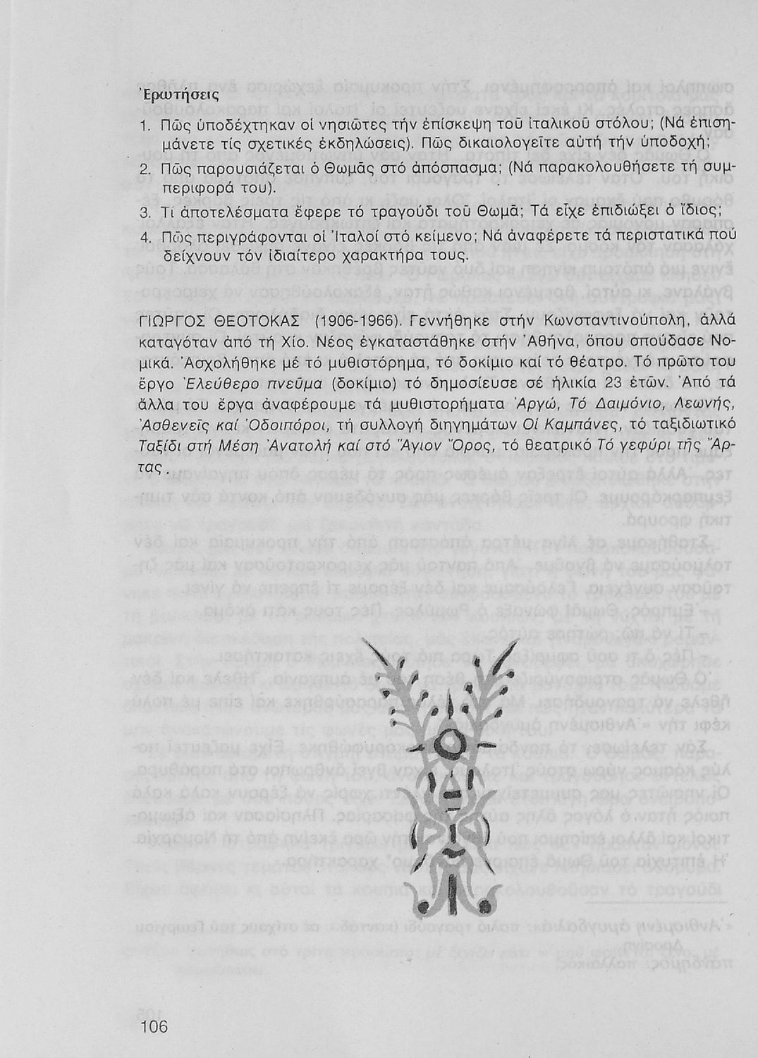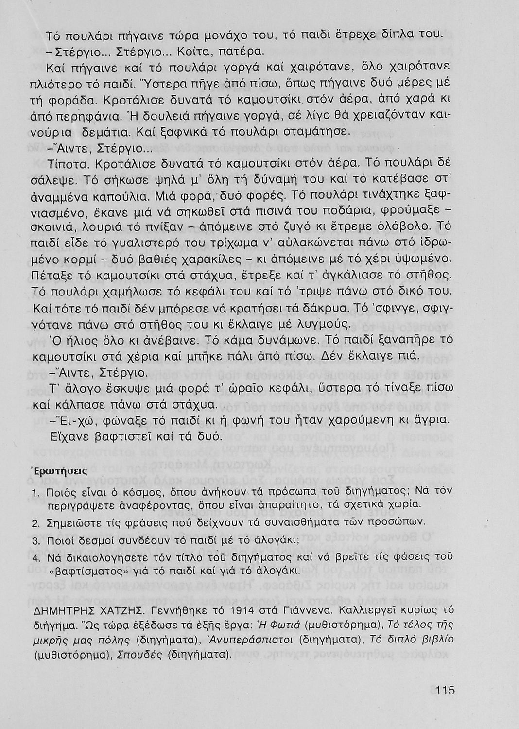 Σχολικό εγχειρίδιο Νέων Ελληνικών Α΄ Γυμνασίου που περιλαμβάνει δοκίμια, πεζά και ποιήματα Ελλήνων συγγραφέων και δημοτικά τραγούδια εμπνευσμένα από τη θρησκευτική, εθνική και κοινωνική ζωή, τη "δοκιμασία της ...
