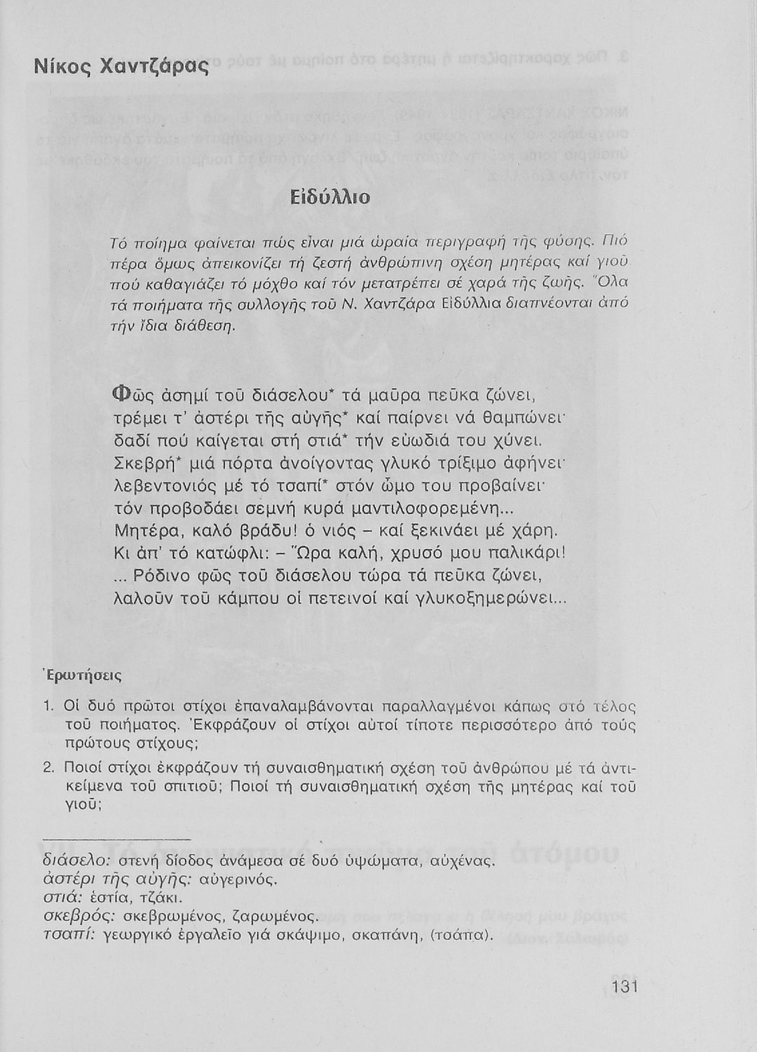 Σχολικό εγχειρίδιο Νέων Ελληνικών Α΄ Γυμνασίου που περιλαμβάνει δοκίμια, πεζά και ποιήματα Ελλήνων συγγραφέων και δημοτικά τραγούδια εμπνευσμένα από τη θρησκευτική, εθνική και κοινωνική ζωή, τη "δοκιμασία της Κύπρου", και την ελληνική φύση. Περιέχει και έργα ευρωπαίων συγγραφέων.