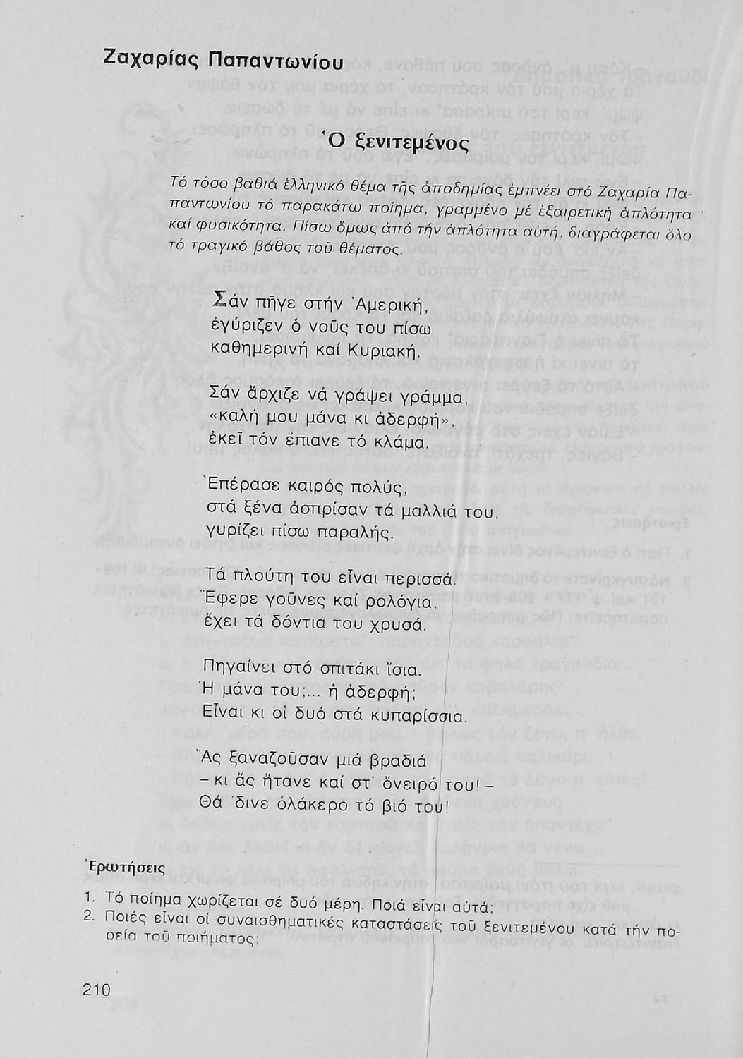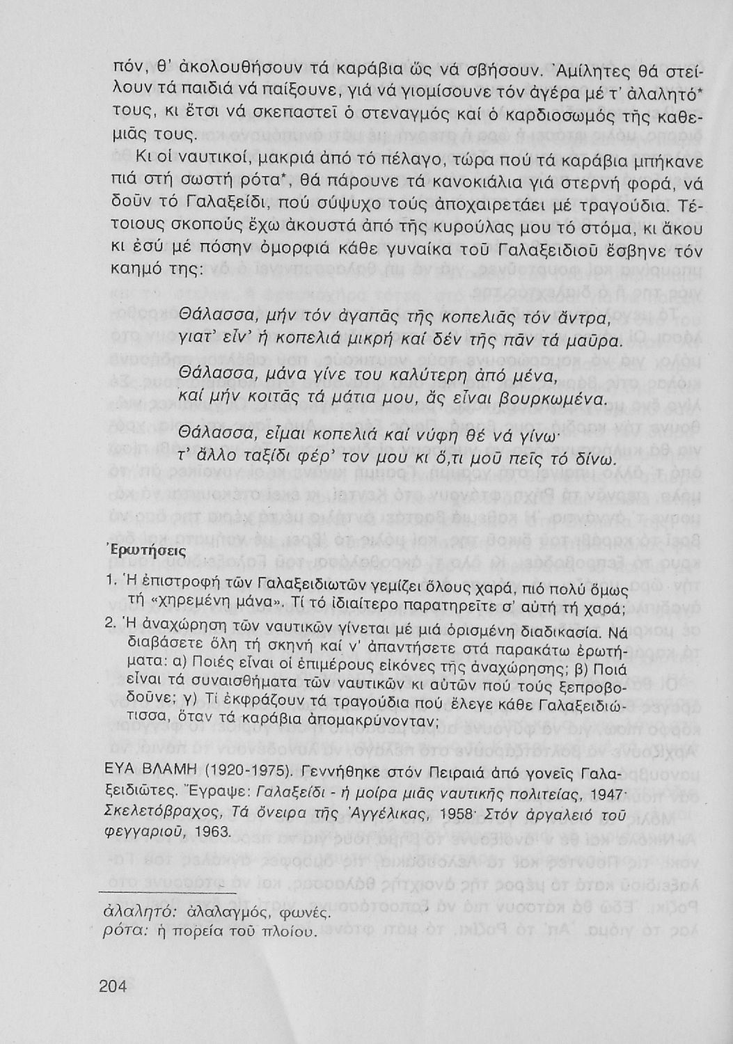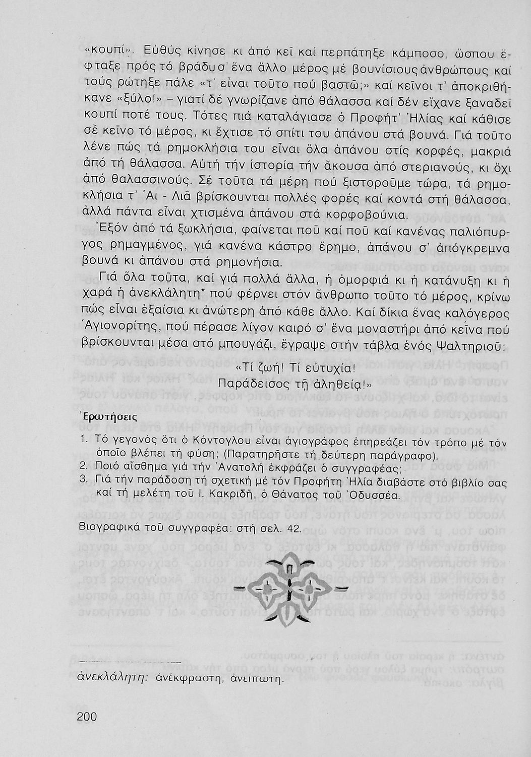 Σχολικό εγχειρίδιο Νέων Ελληνικών Α΄ Γυμνασίου που περιλαμβάνει δοκίμια, πεζά και ποιήματα Ελλήνων συγγραφέων και δημοτικά τραγούδια εμπνευσμένα από τη θρησκευτική, εθνική και κοινωνική ζωή, τη "δοκιμασία της Κύπρου", και την ελληνική φύση. Περιέχει και έργα ευρωπαίων συγγραφέων.