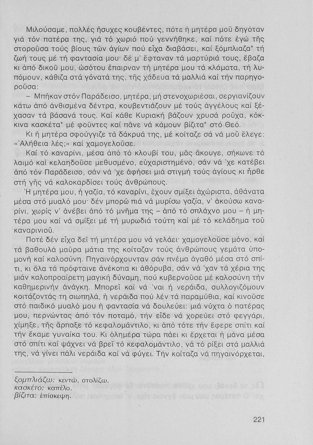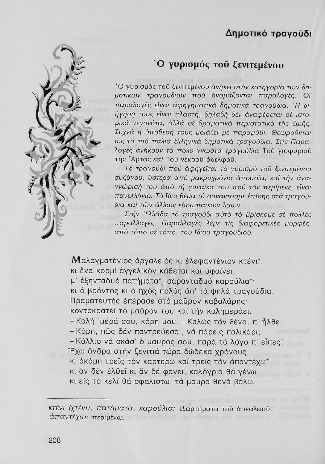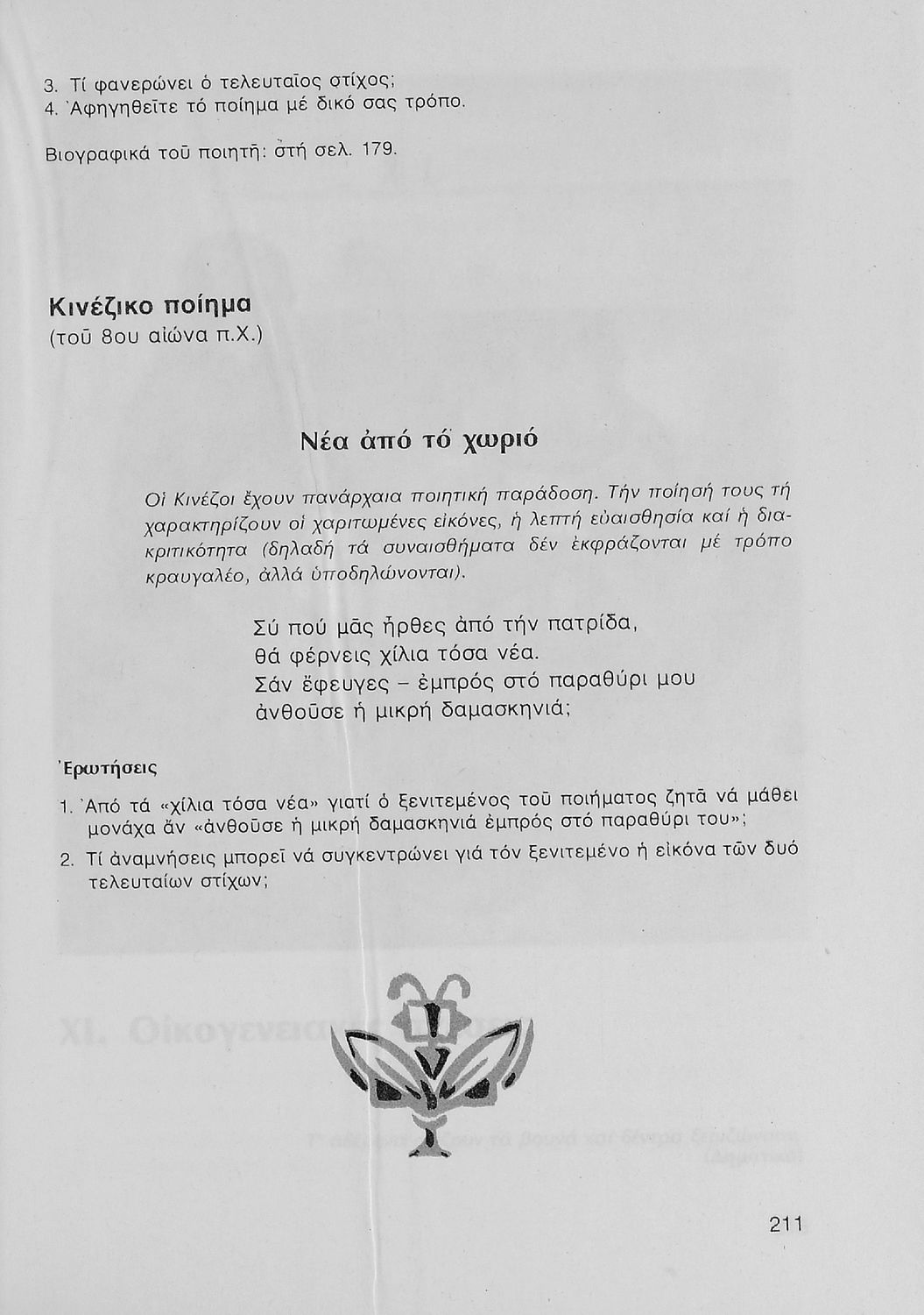 Σχολικό εγχειρίδιο Νέων Ελληνικών Α΄ Γυμνασίου που περιλαμβάνει δοκίμια, πεζά και ποιήματα Ελλήνων συγγραφέων και δημοτικά τραγούδια εμπνευσμένα από τη θρησκευτική, εθνική και κοινωνική ζωή, τη "δοκιμασία της Κύπρου", και την ελληνική φύση. Περιέχει και έργα ευρωπαίων συγγραφέων.