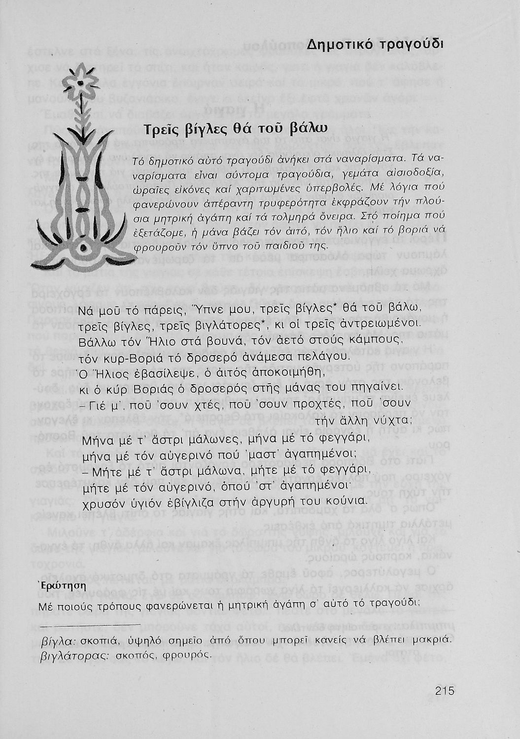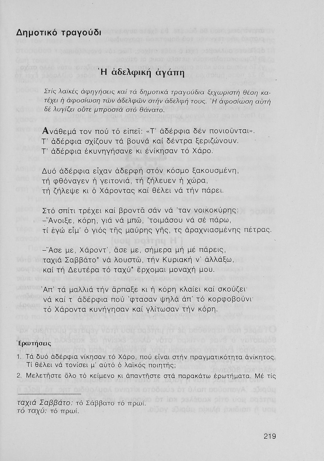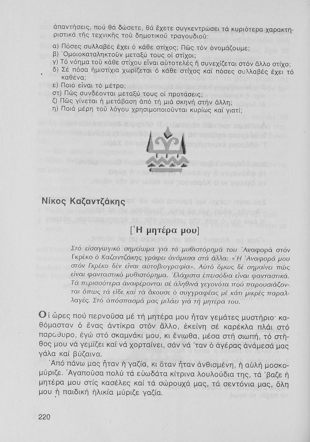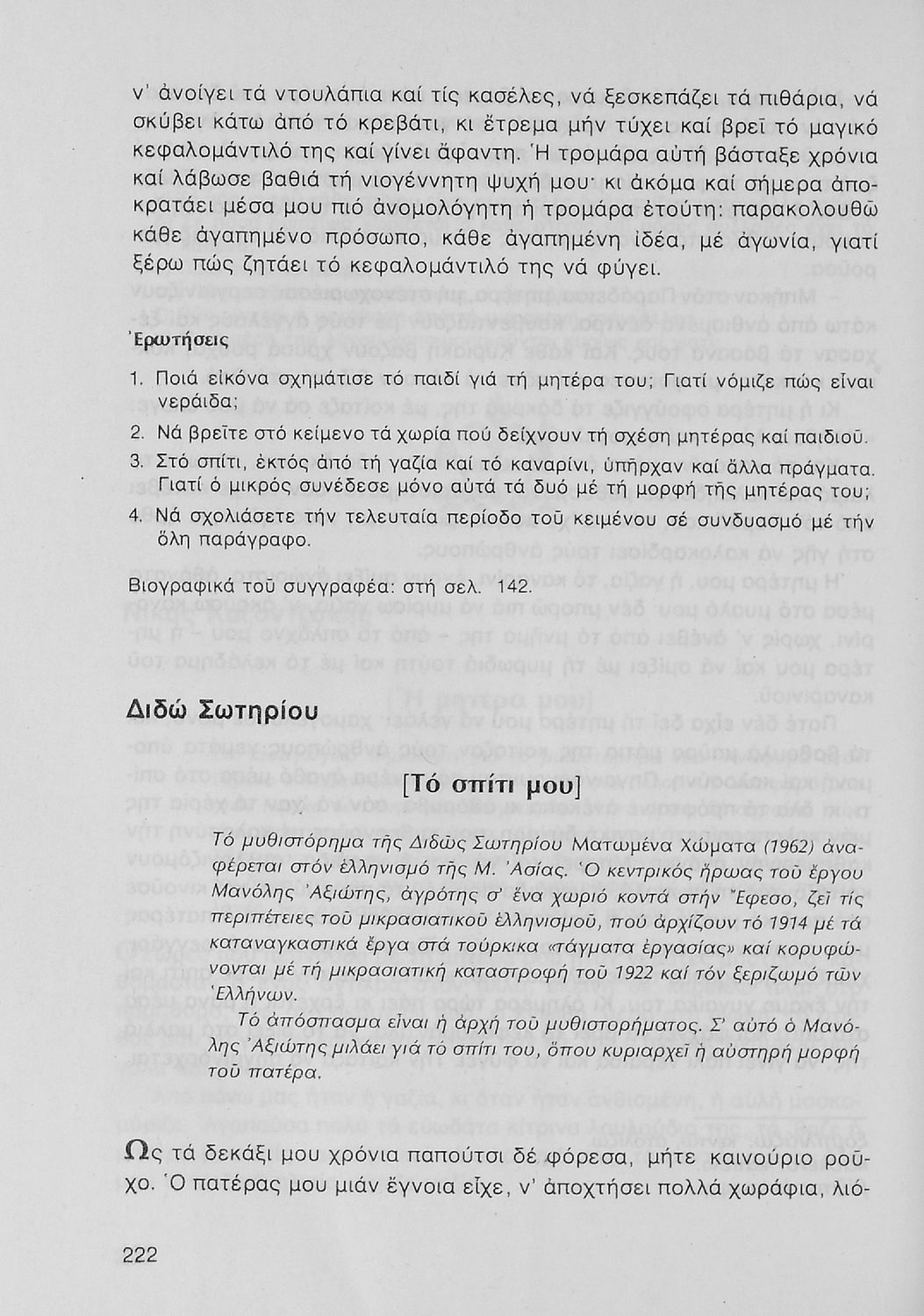 Σχολικό εγχειρίδιο Νέων Ελληνικών Α΄ Γυμνασίου που περιλαμβάνει δοκίμια, πεζά και ποιήματα Ελλήνων συγγραφέων και δημοτικά τραγούδια εμπνευσμένα από τη θρησκευτική, εθνική και κοινωνική ζωή, τη "δοκιμασία της ...