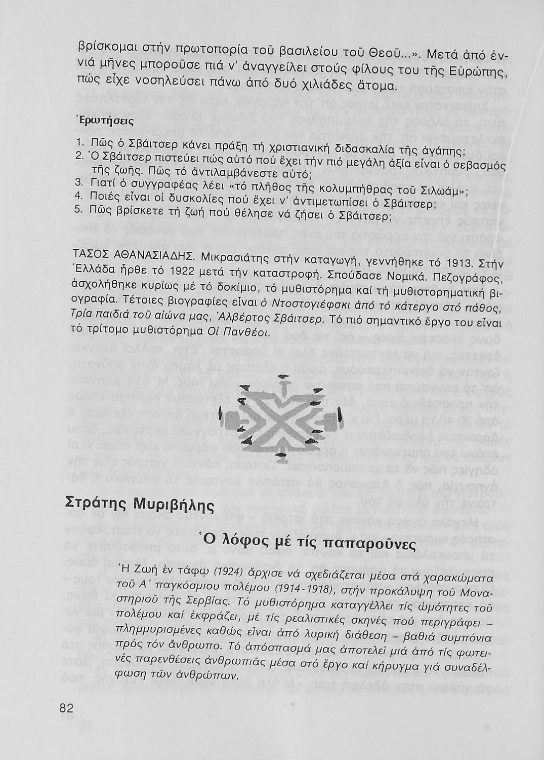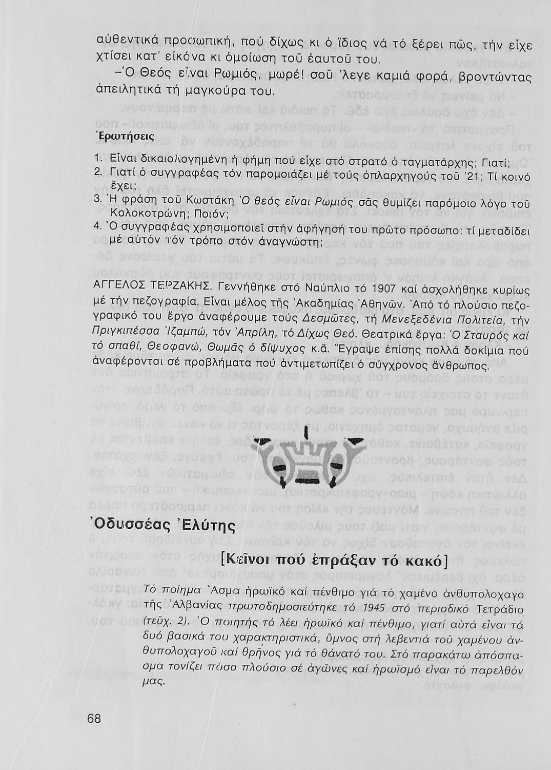 Σχολικό εγχειρίδιο Νέων Ελληνικών Α΄ Γυμνασίου που περιλαμβάνει δοκίμια, πεζά και ποιήματα Ελλήνων συγγραφέων και δημοτικά τραγούδια εμπνευσμένα από τη θρησκευτική, εθνική και κοινωνική ζωή, τη "δοκιμασία της ...