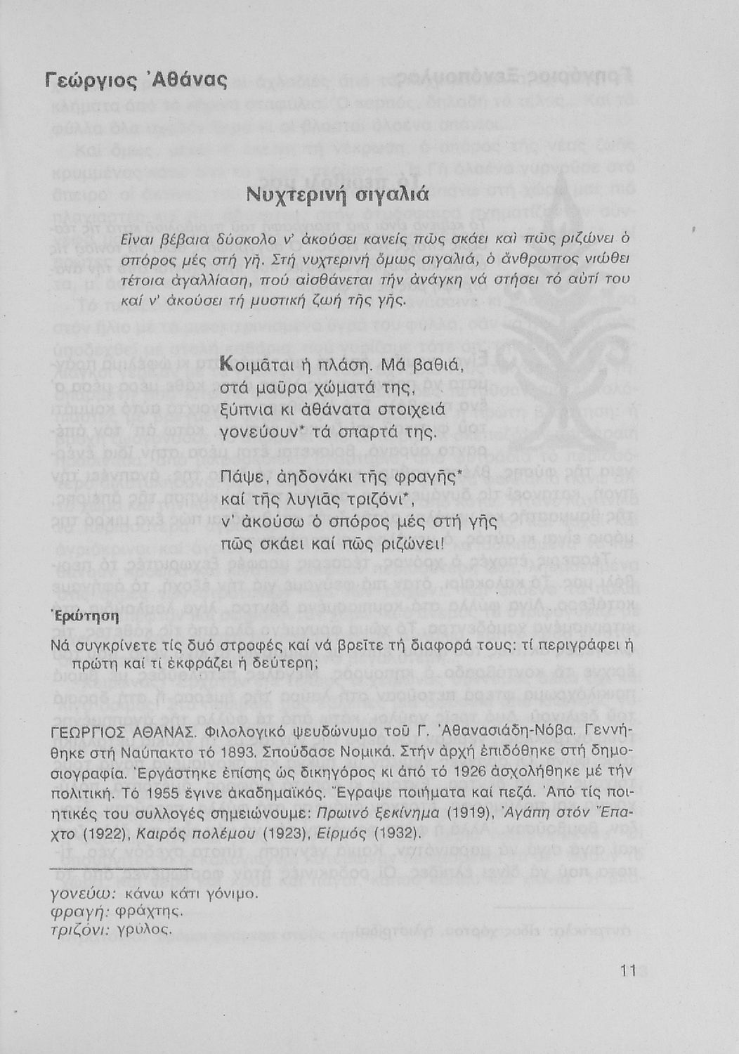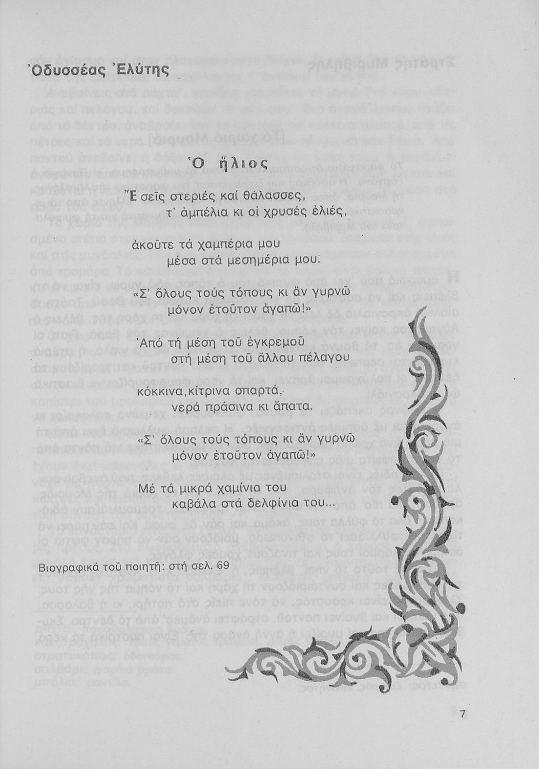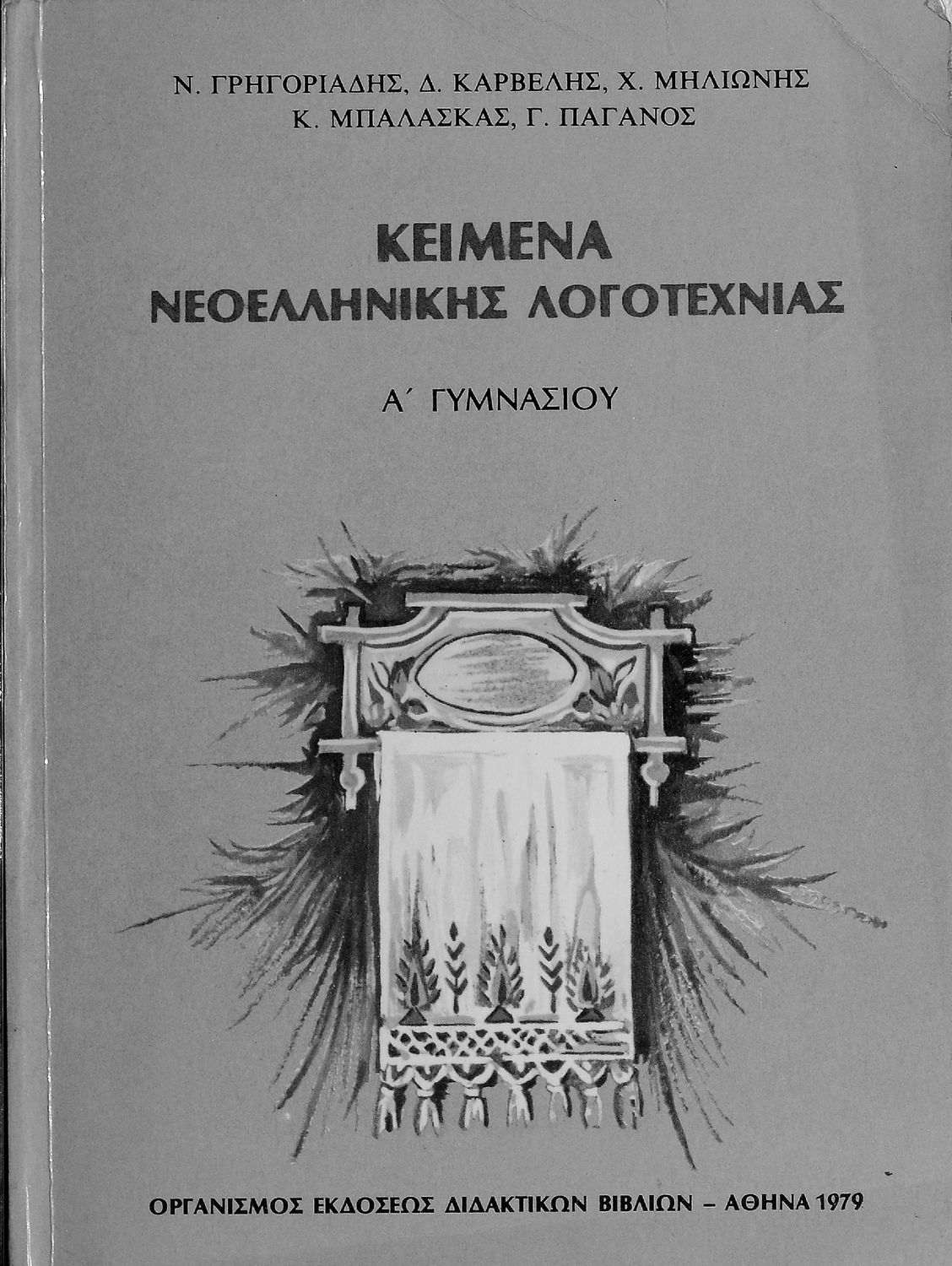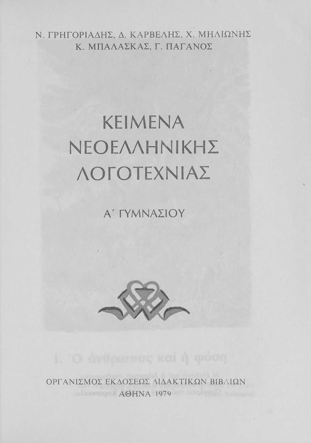 Σχολικό εγχειρίδιο Νέων Ελληνικών Α΄ Γυμνασίου που περιλαμβάνει δοκίμια, πεζά και ποιήματα Ελλήνων συγγραφέων και δημοτικά τραγούδια εμπνευσμένα από τη θρησκευτική, εθνική και κοινωνική ζωή, τη "δοκιμασία της Κύπρου", και την ελληνική φύση. Περιέχει και έργα ευρωπαίων συγγραφέων.