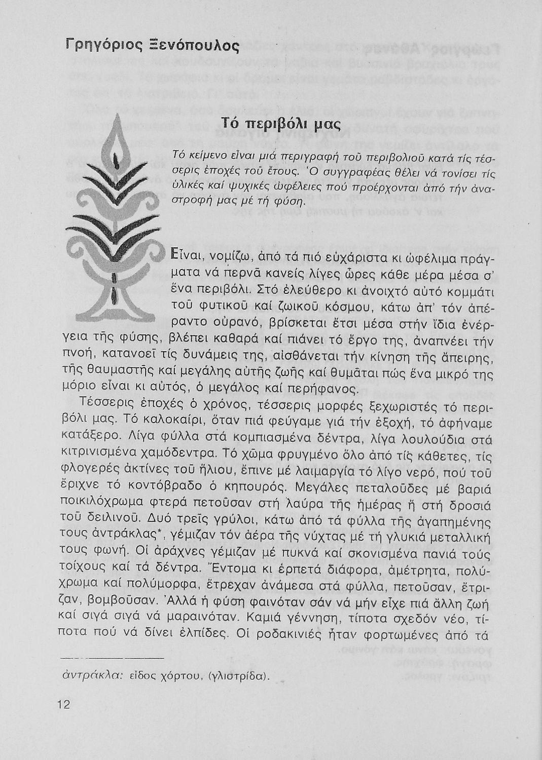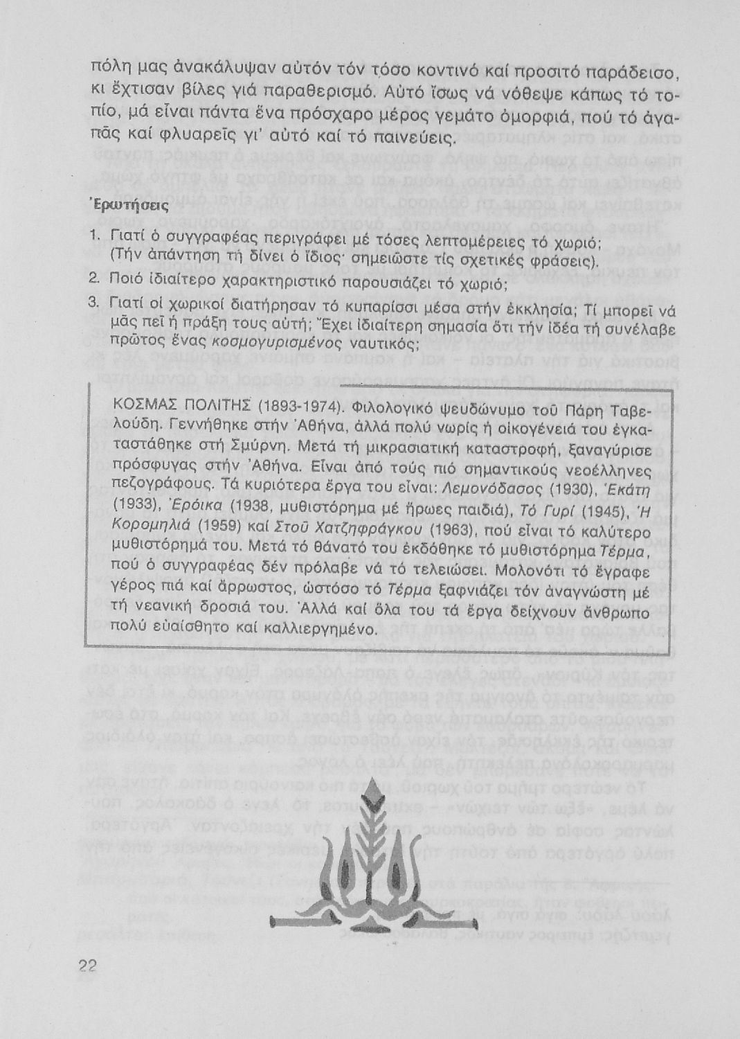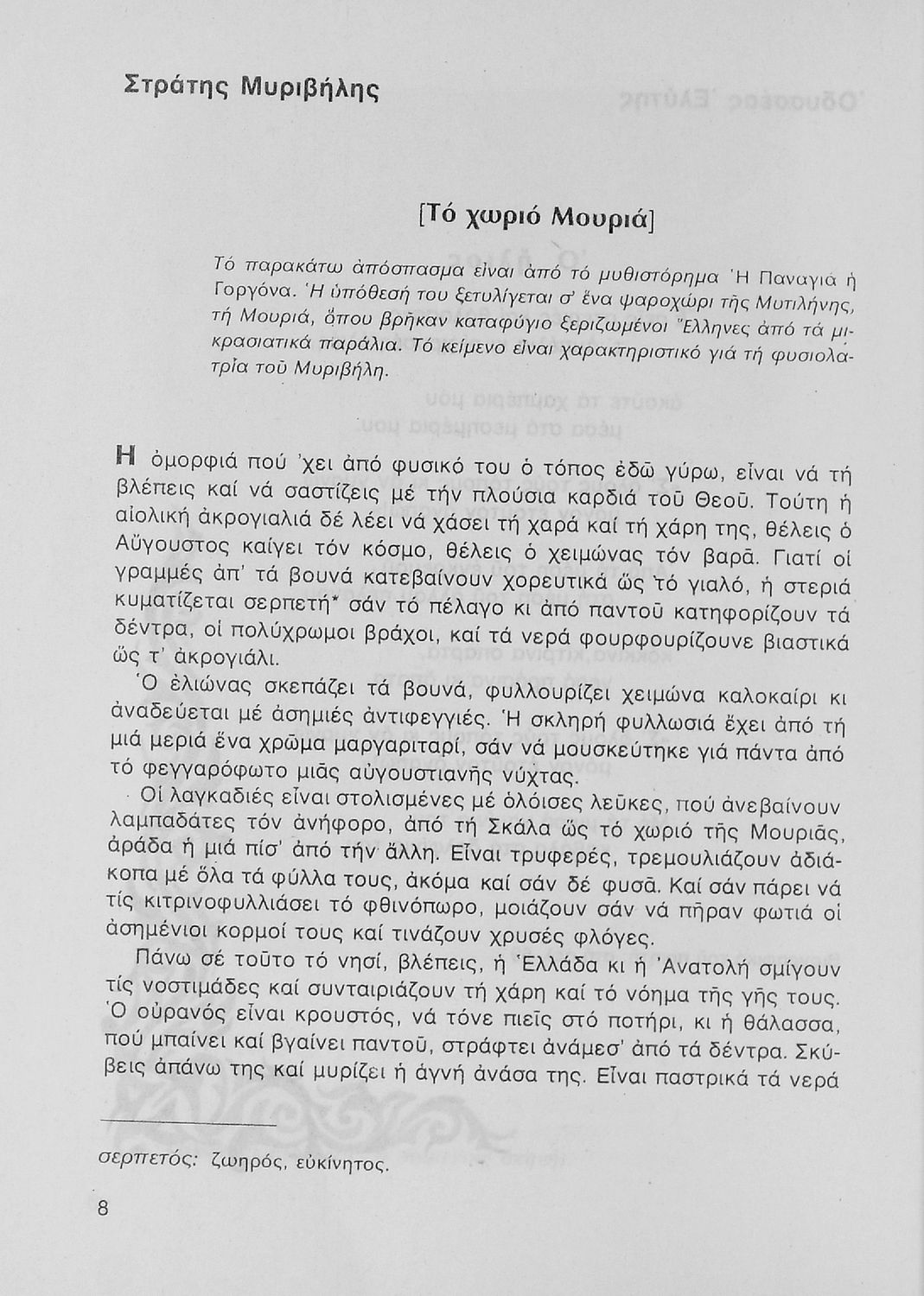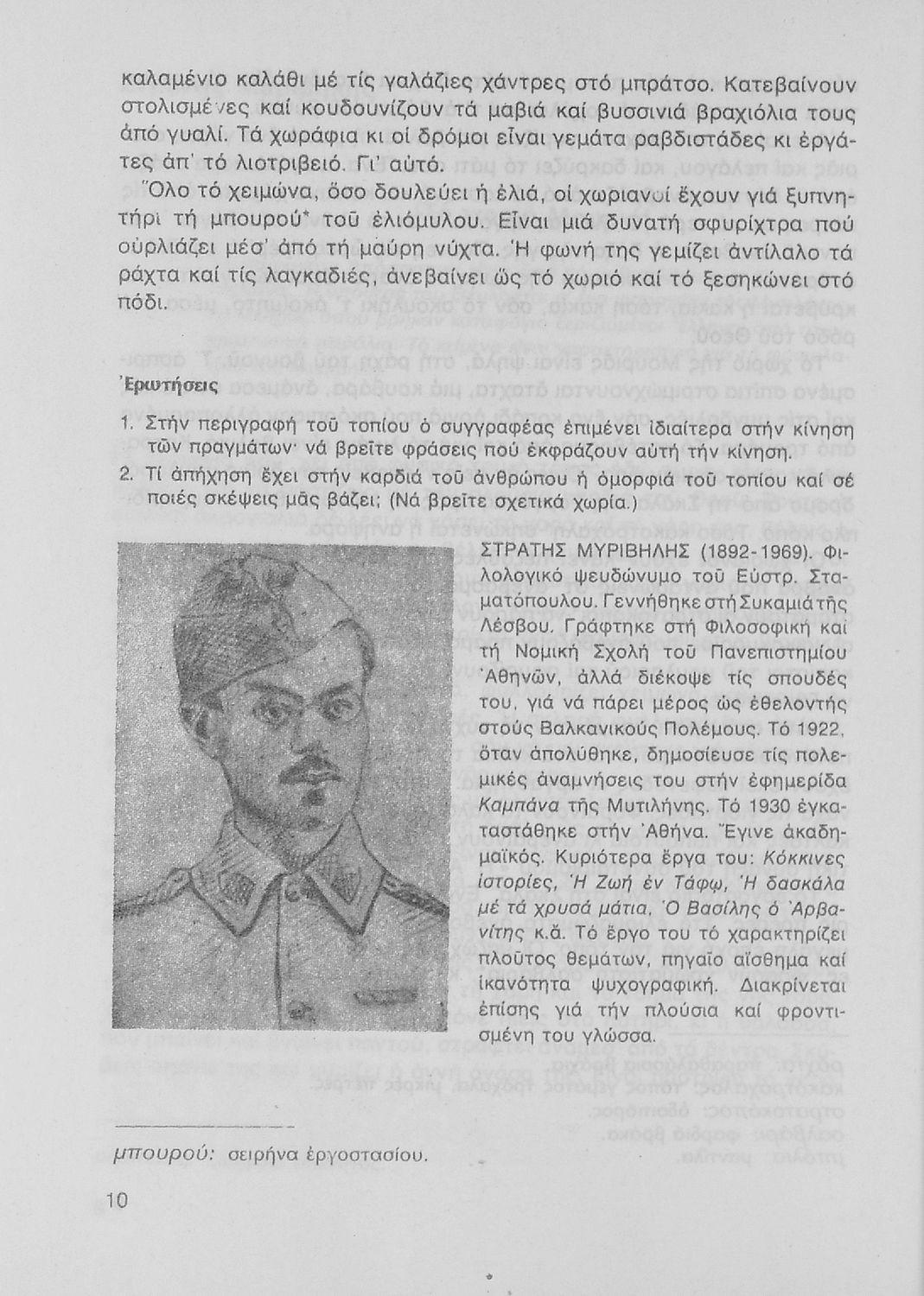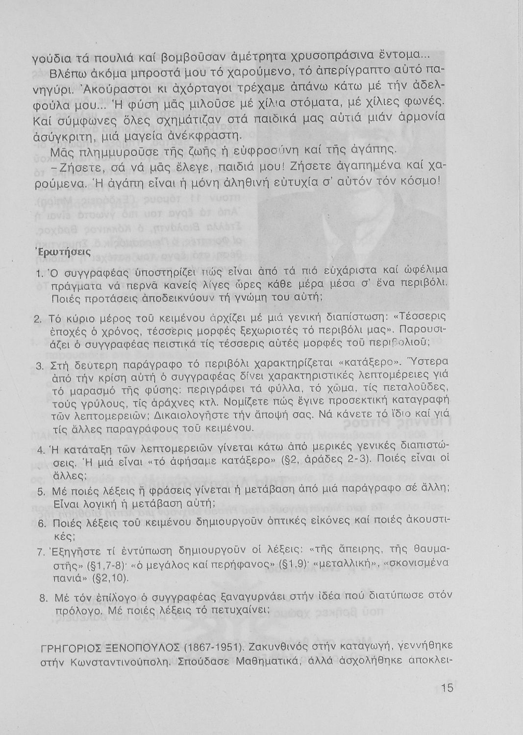 Σχολικό εγχειρίδιο Νέων Ελληνικών Α΄ Γυμνασίου που περιλαμβάνει δοκίμια, πεζά και ποιήματα Ελλήνων συγγραφέων και δημοτικά τραγούδια εμπνευσμένα από τη θρησκευτική, εθνική και κοινωνική ζωή, τη "δοκιμασία της Κύπρου", και την ελληνική φύση. Περιέχει και έργα ευρωπαίων συγγραφέων.