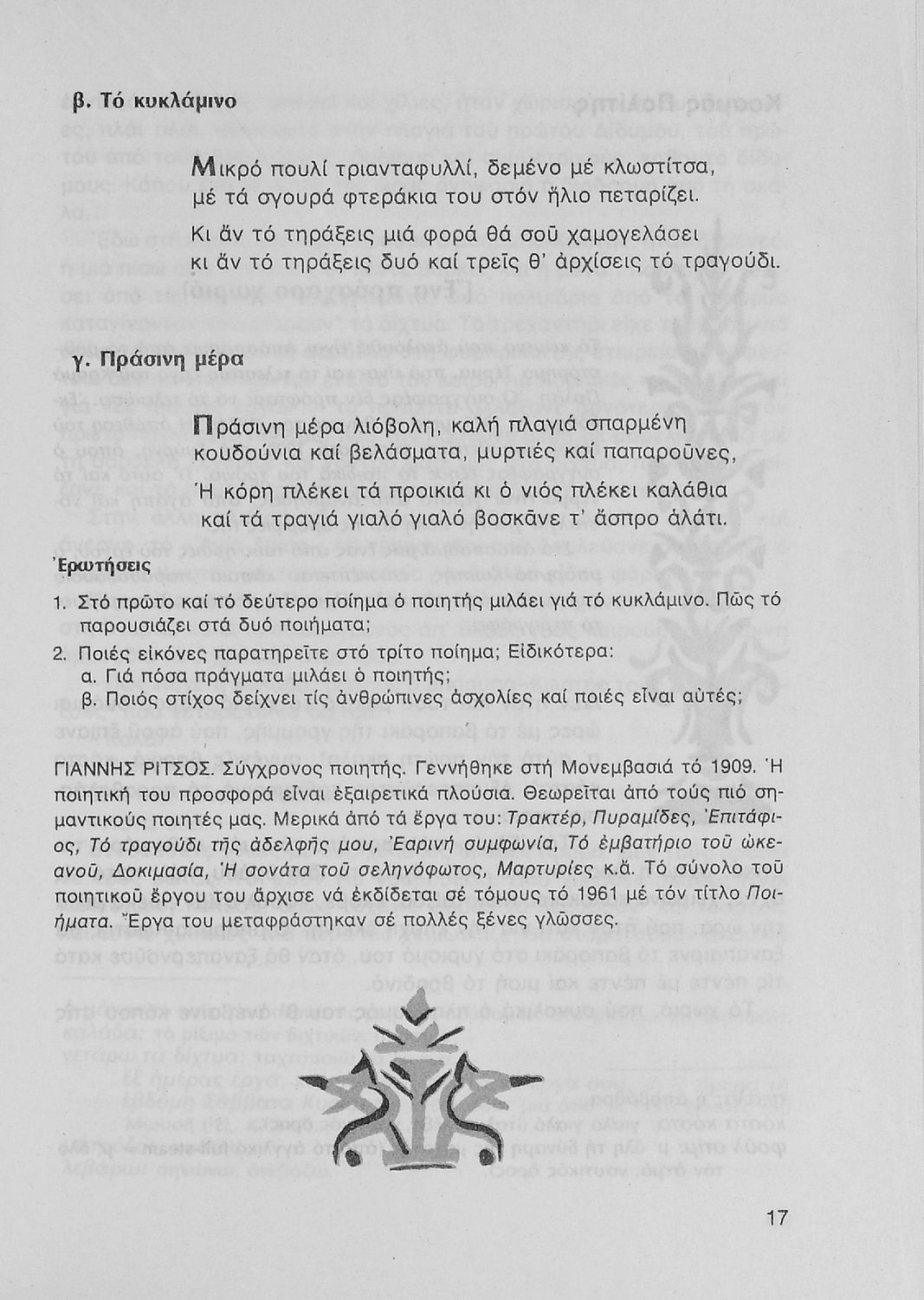 Σχολικό εγχειρίδιο Νέων Ελληνικών Β' Γυμνασίου που περιέχει δημοτικά τραγούδια, πεζά, δοκίμια και ποιήματα σύγχρονων Ελλήνων συγγραφέων και είναι χωρισμένο σε θεματικές ενότητες όπως η πόλη και η ύπαιθρος, η ...