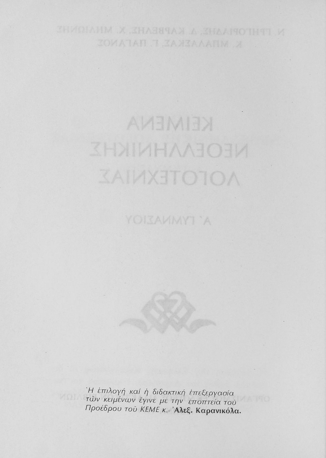 Σχολικό εγχειρίδιο Νέων Ελληνικών Α΄ Γυμνασίου που περιλαμβάνει δοκίμια, πεζά και ποιήματα Ελλήνων συγγραφέων και δημοτικά τραγούδια εμπνευσμένα από τη θρησκευτική, εθνική και κοινωνική ζωή, τη "δοκιμασία της ...