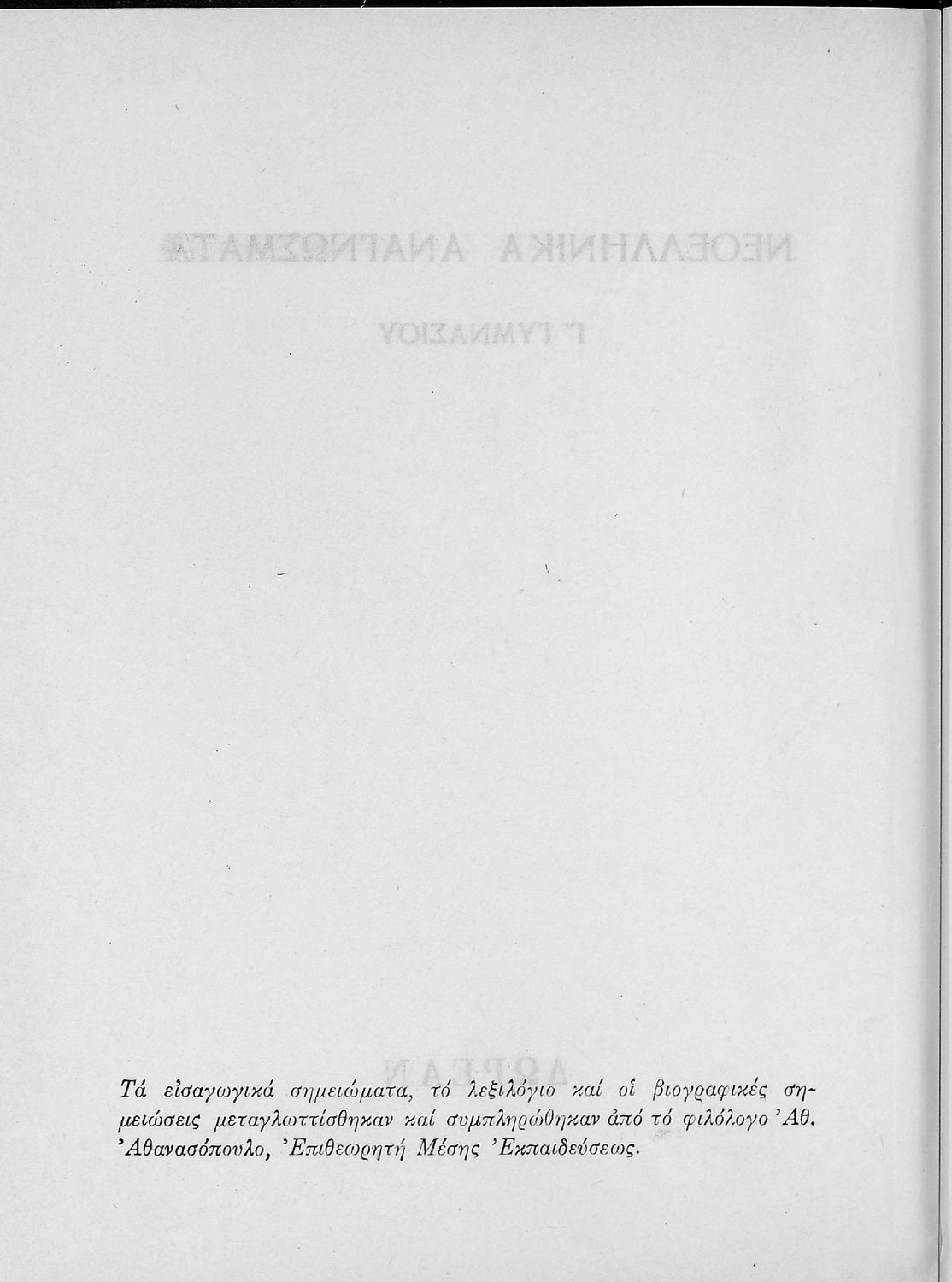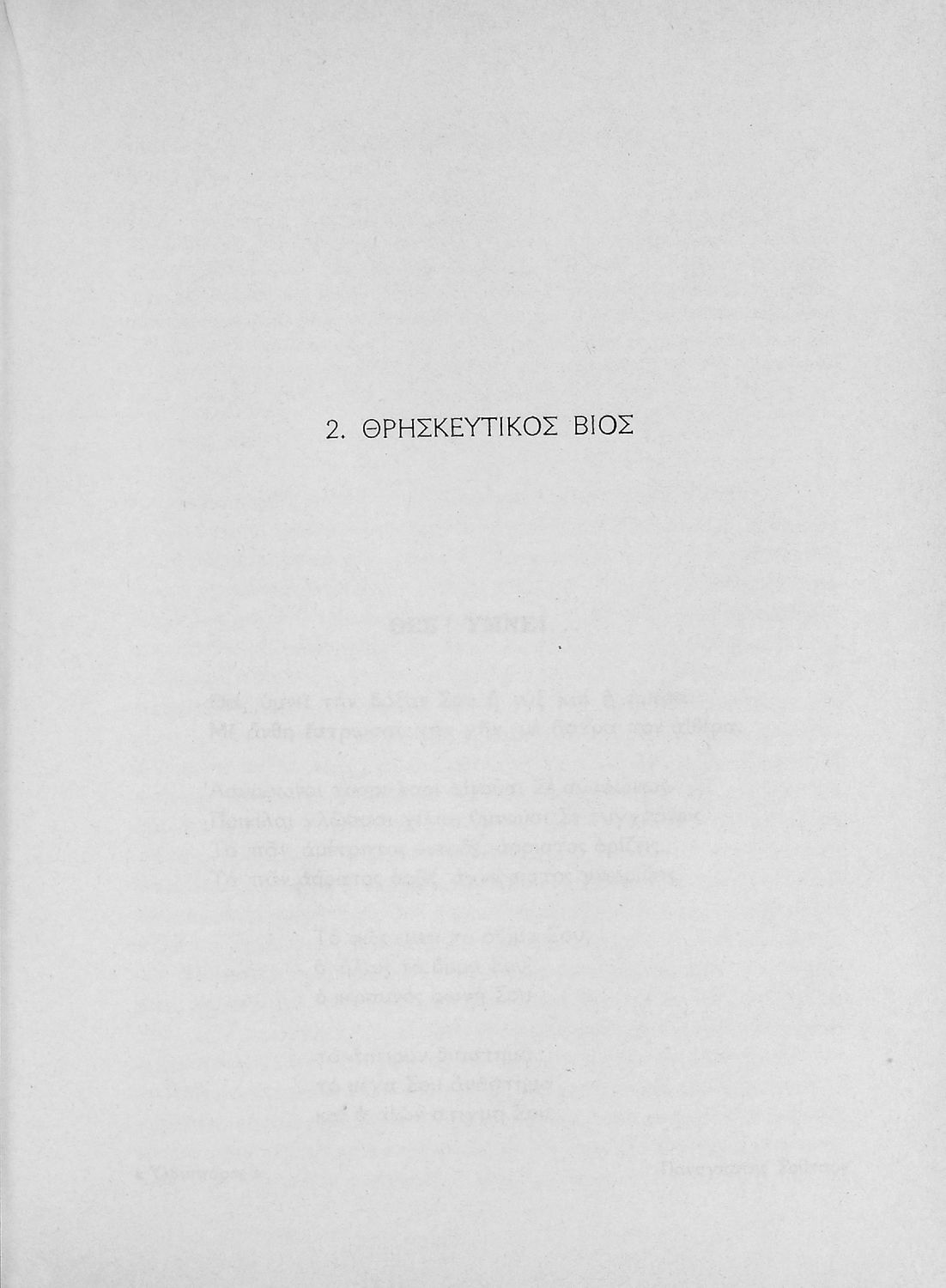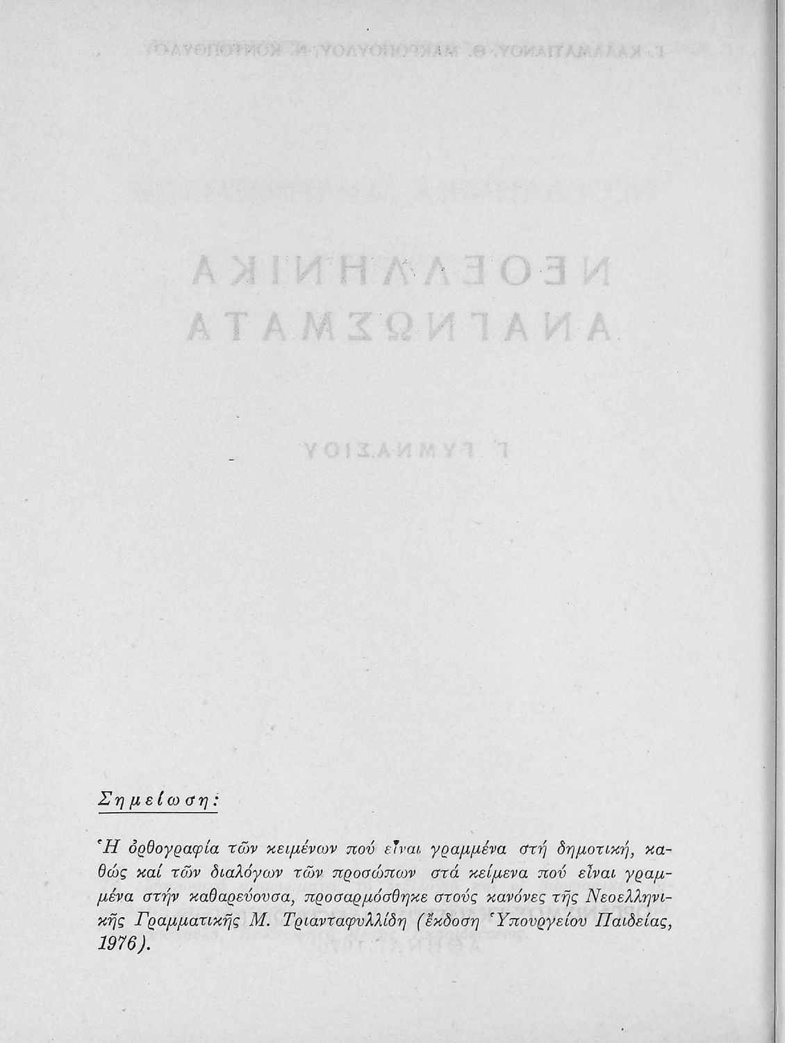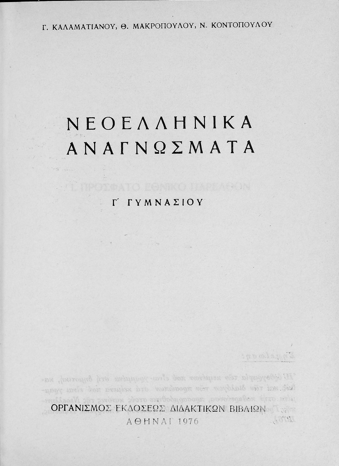 Σχολικό εγχειρίδιο Νέων Ελληνικών Γ΄ Γυμνασίου και Α' Αστικού Σχολείου που περιέχει πεζά και ποιήματα Ελλήνων συγγραφέων εμπνευσμένα από τη θρησκευτική και κοινωνική ζωή, την ελληνική μυθολογία, την αρχαία και