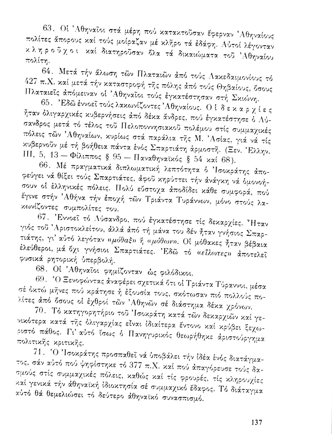 Σχολικό εγχειρίδιο Αρχαίων Ελληνικών για τη Β΄ Γυμνασίου που περιλαμβάνει Λόγους των Λυσία και Ισοκράτη και αποσπάσματα από τα Ελληνικά του Ξενοφώντα σε μετάφραση, εισαγωγή στη ζωή και το έργο τους και ερμηνευτικές σημειώσεις.
