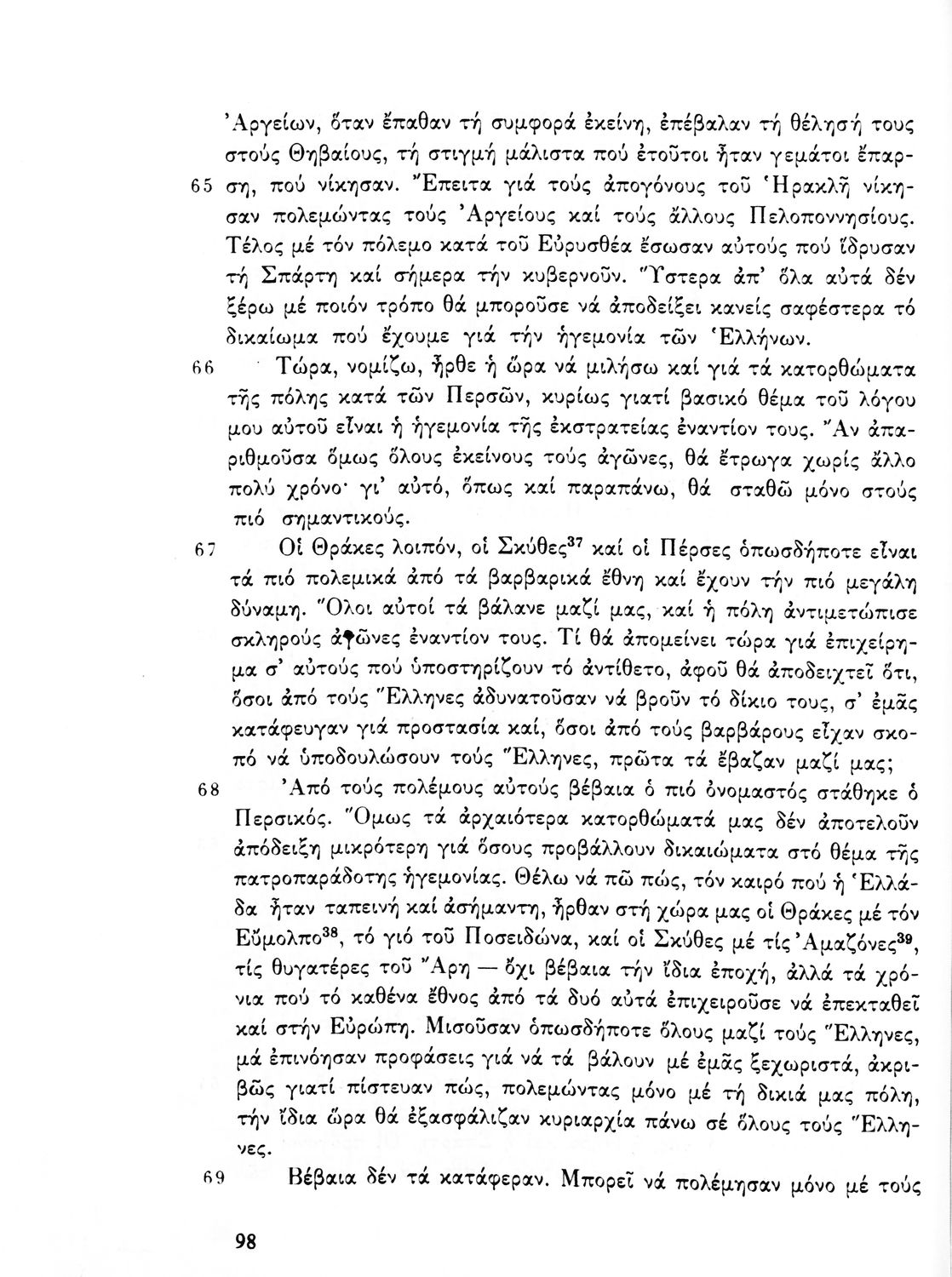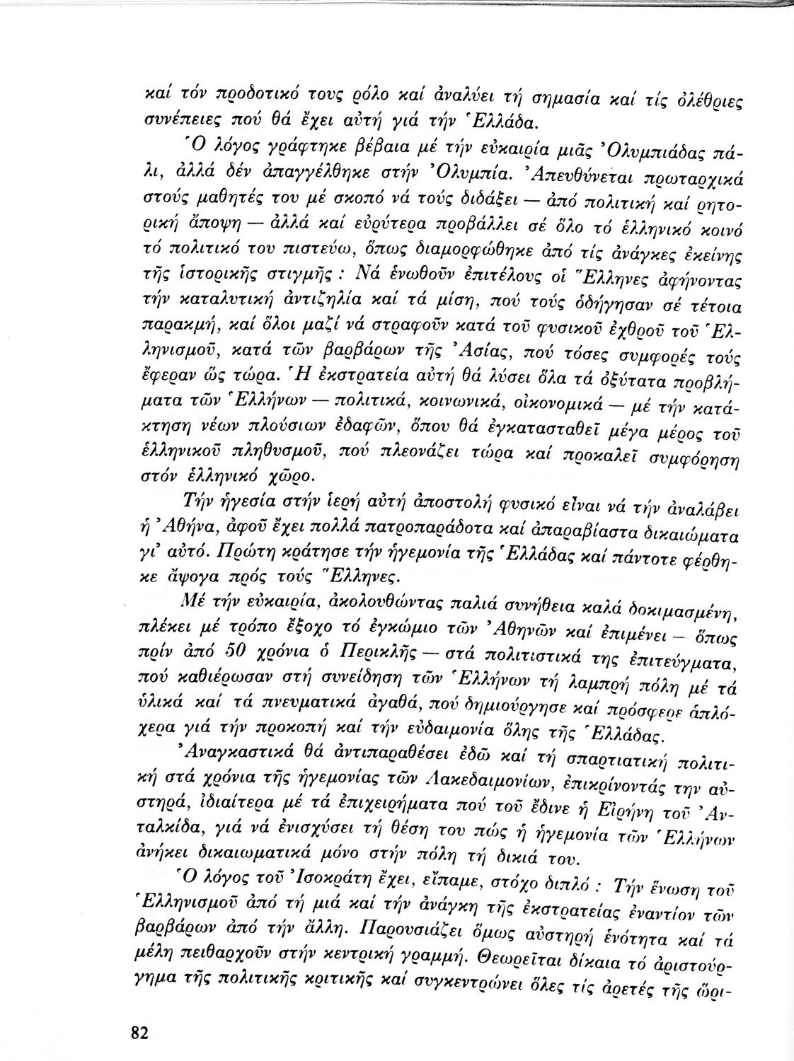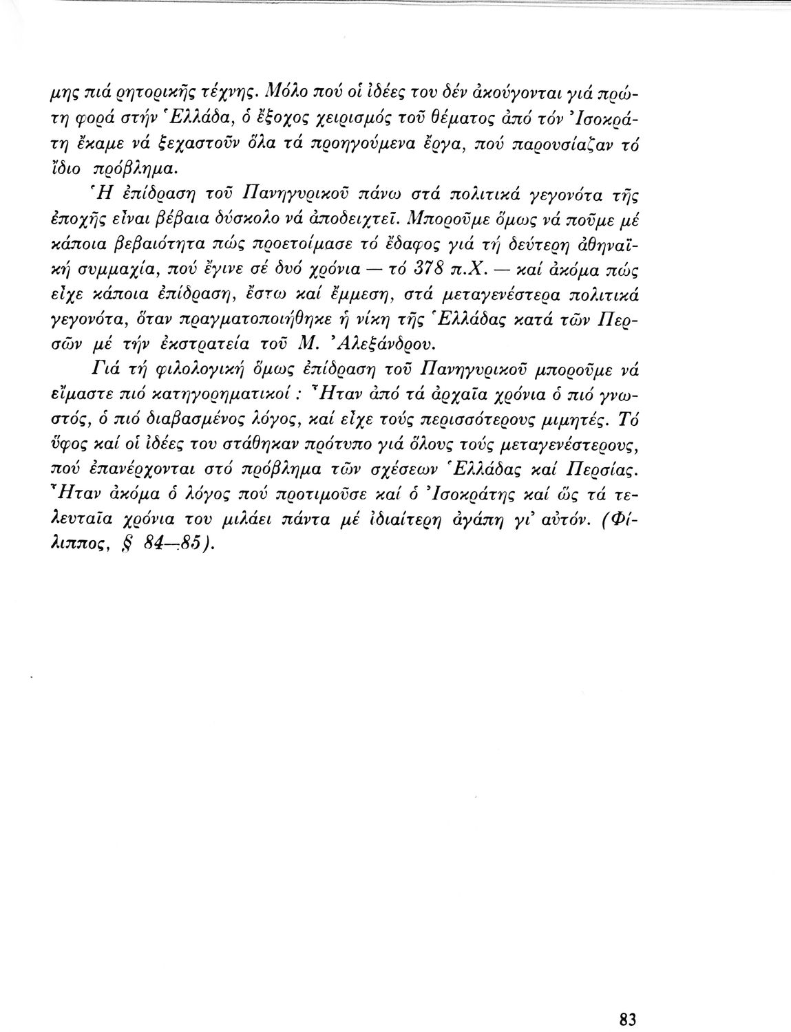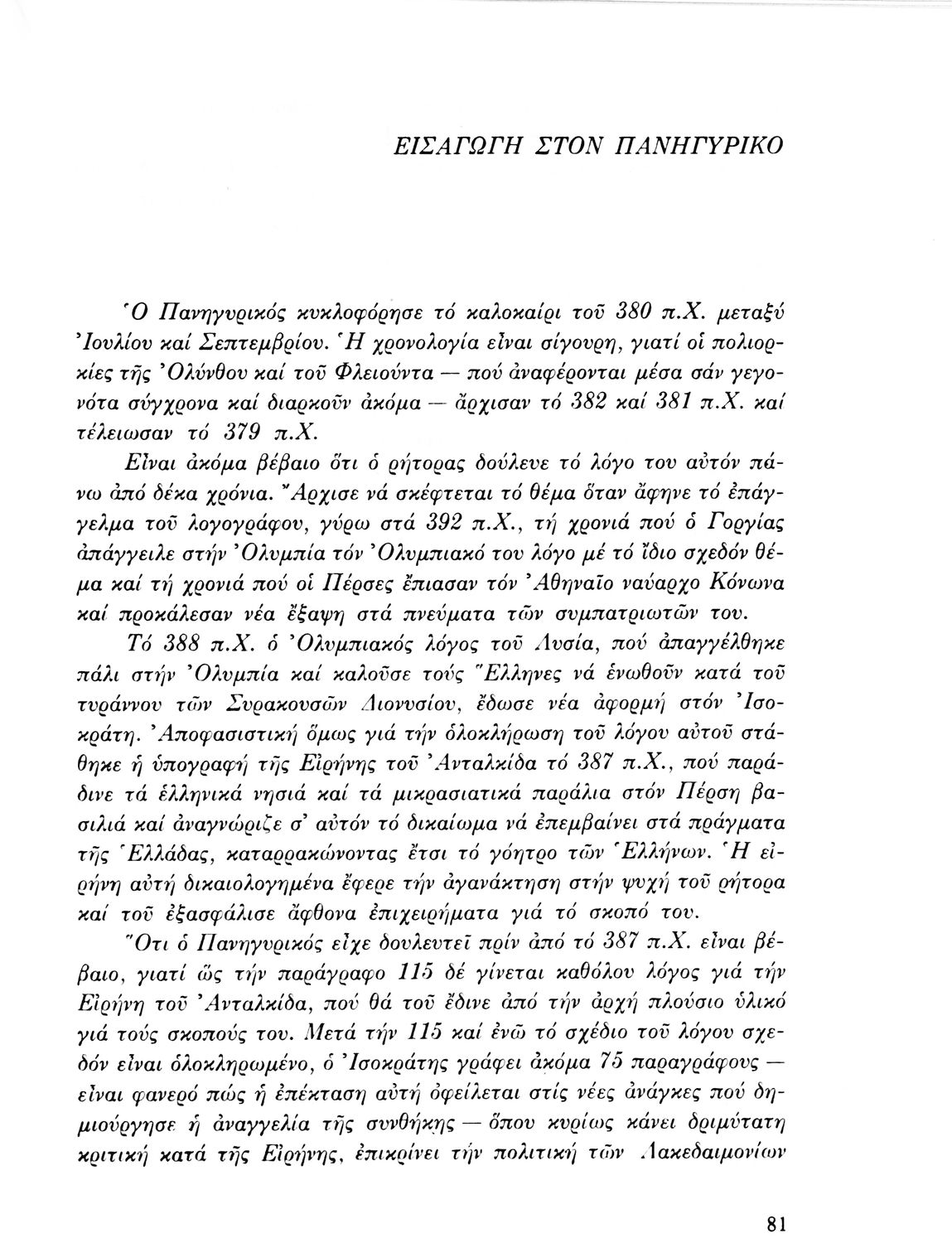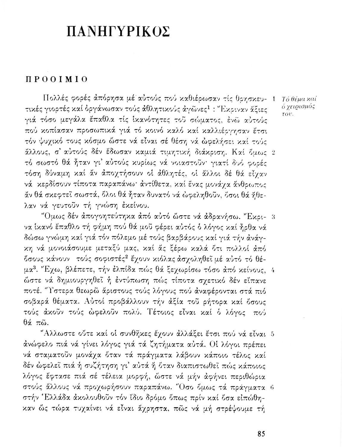 Μαθητικό βοήθημα Αρχαίων Ελληνικών που περιλαμβάνει μετάφραση του Λόγου του Ισοκράτη Πανηγυρικός και ερμηνευτικές σημειώσεις.